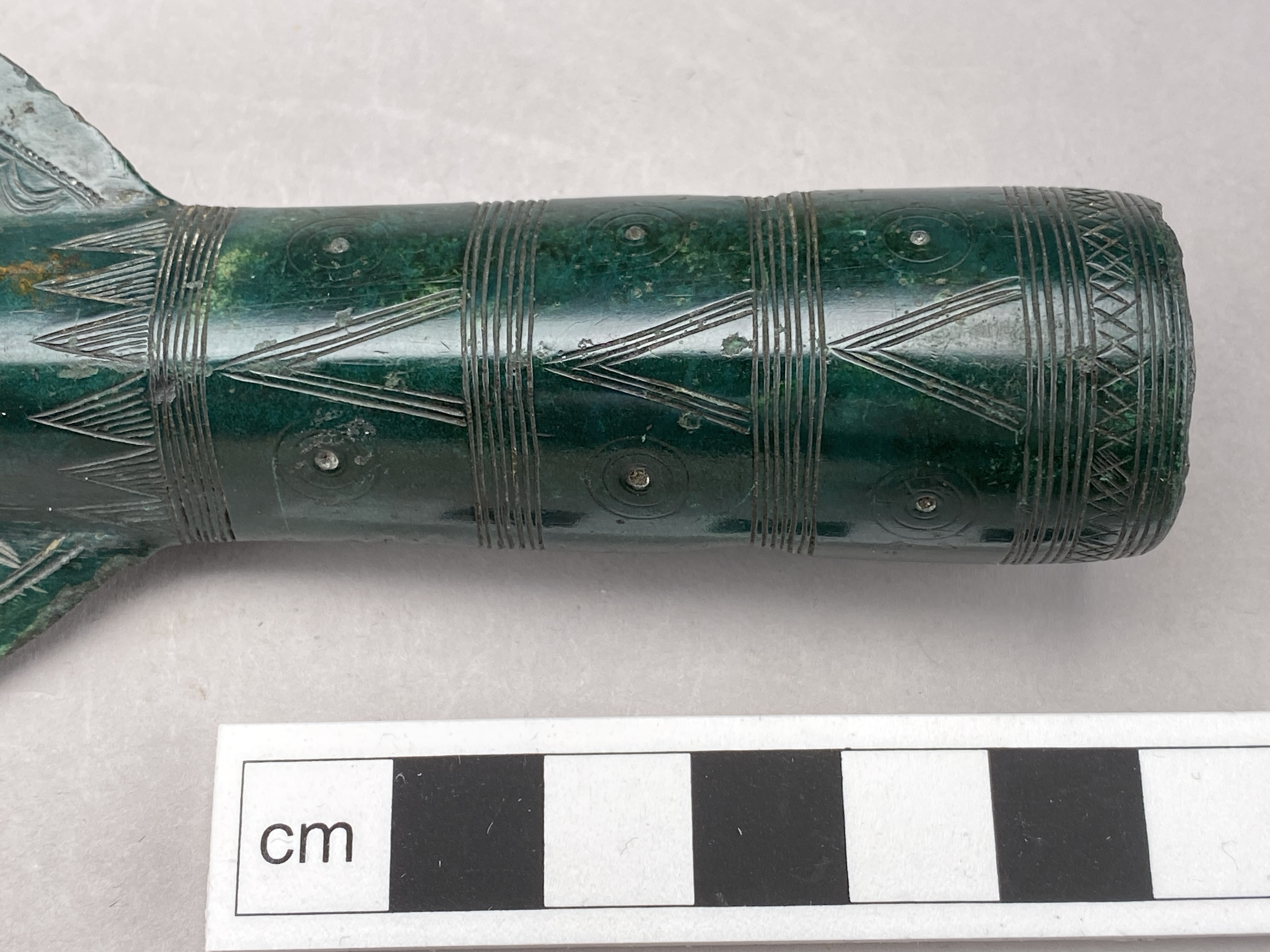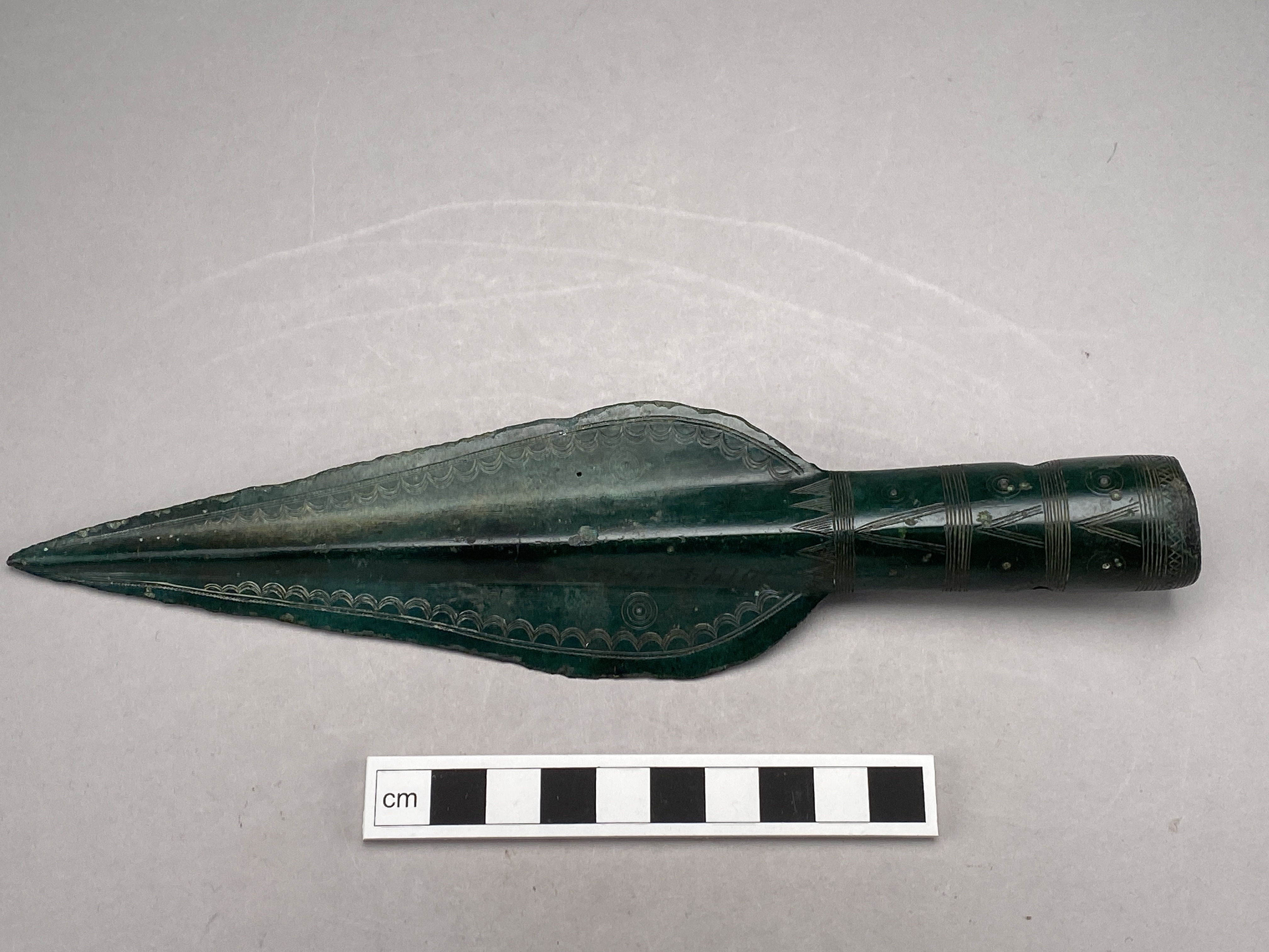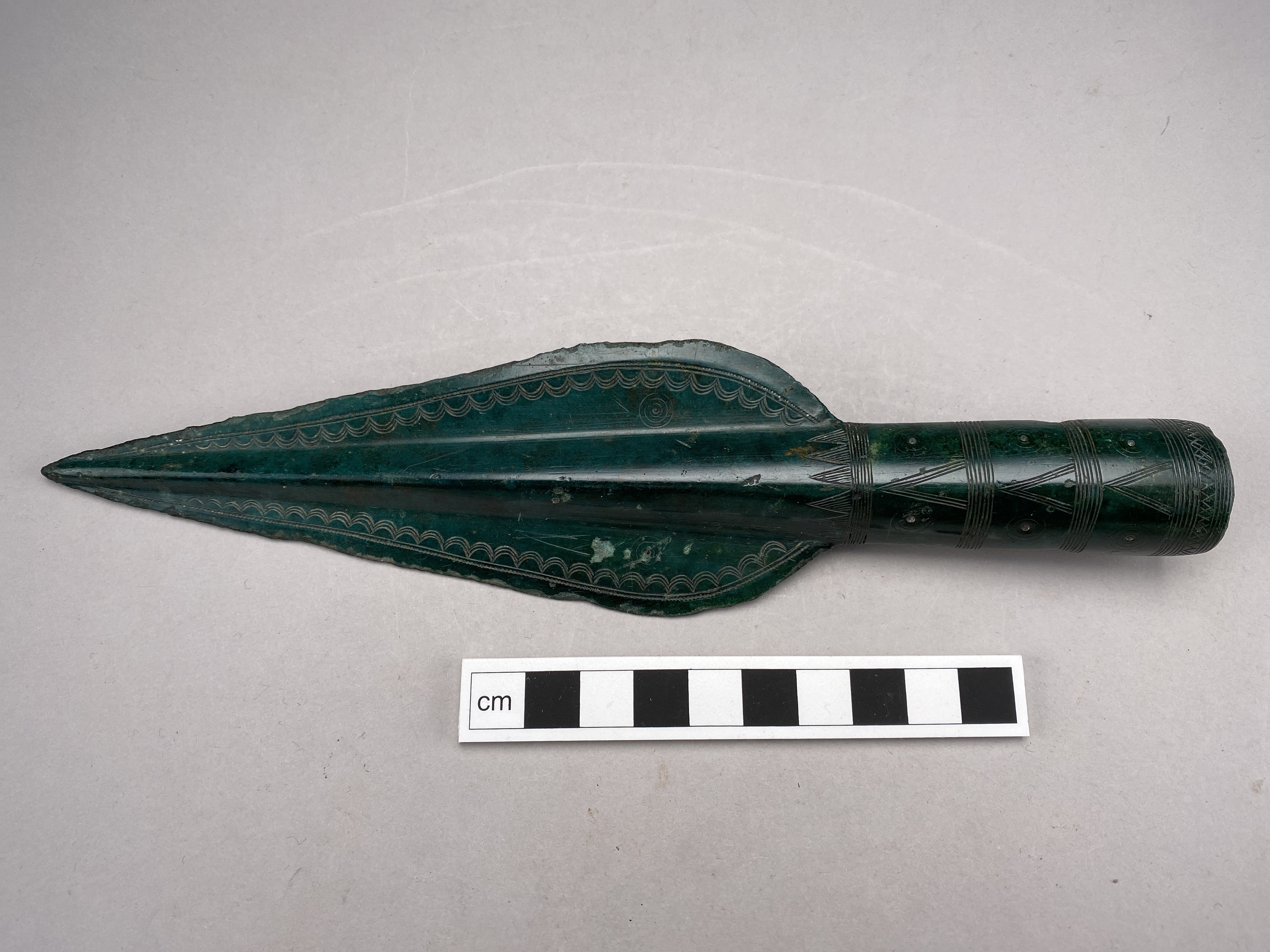 Spjutspets av brons med ryggad holk. Bladet är ornerat med inpunsade punktrader och halvbågar samt komcentriska ringar med mittpunkt. Holken är ornerad med fem linjeband, fyllda trianglar, koncentriska ringar med mittpunkt samt korslagda streck. Två runda nithål.
