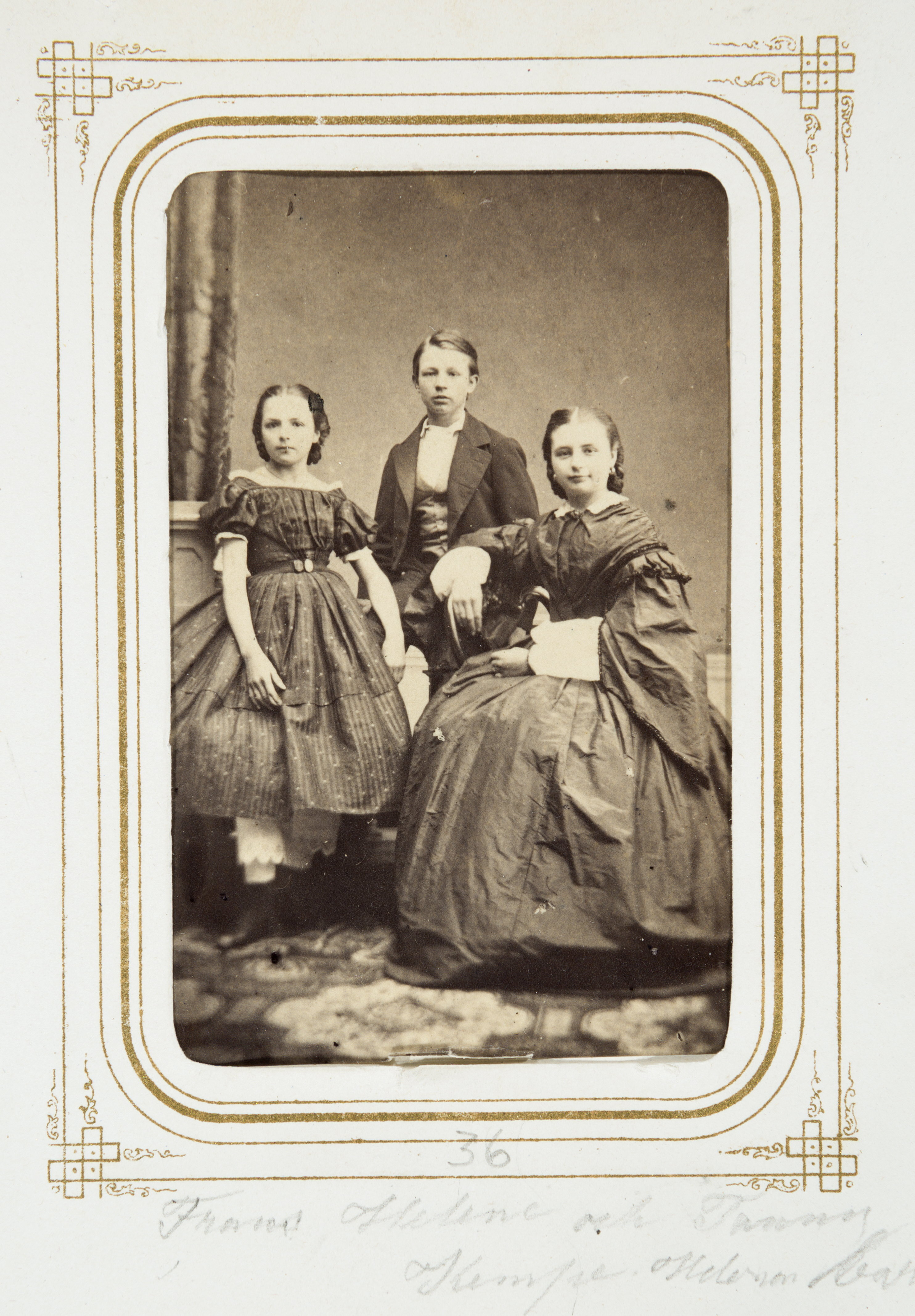 Fotografiporträtt i album. Helena, Frans och Fanny Kempe.