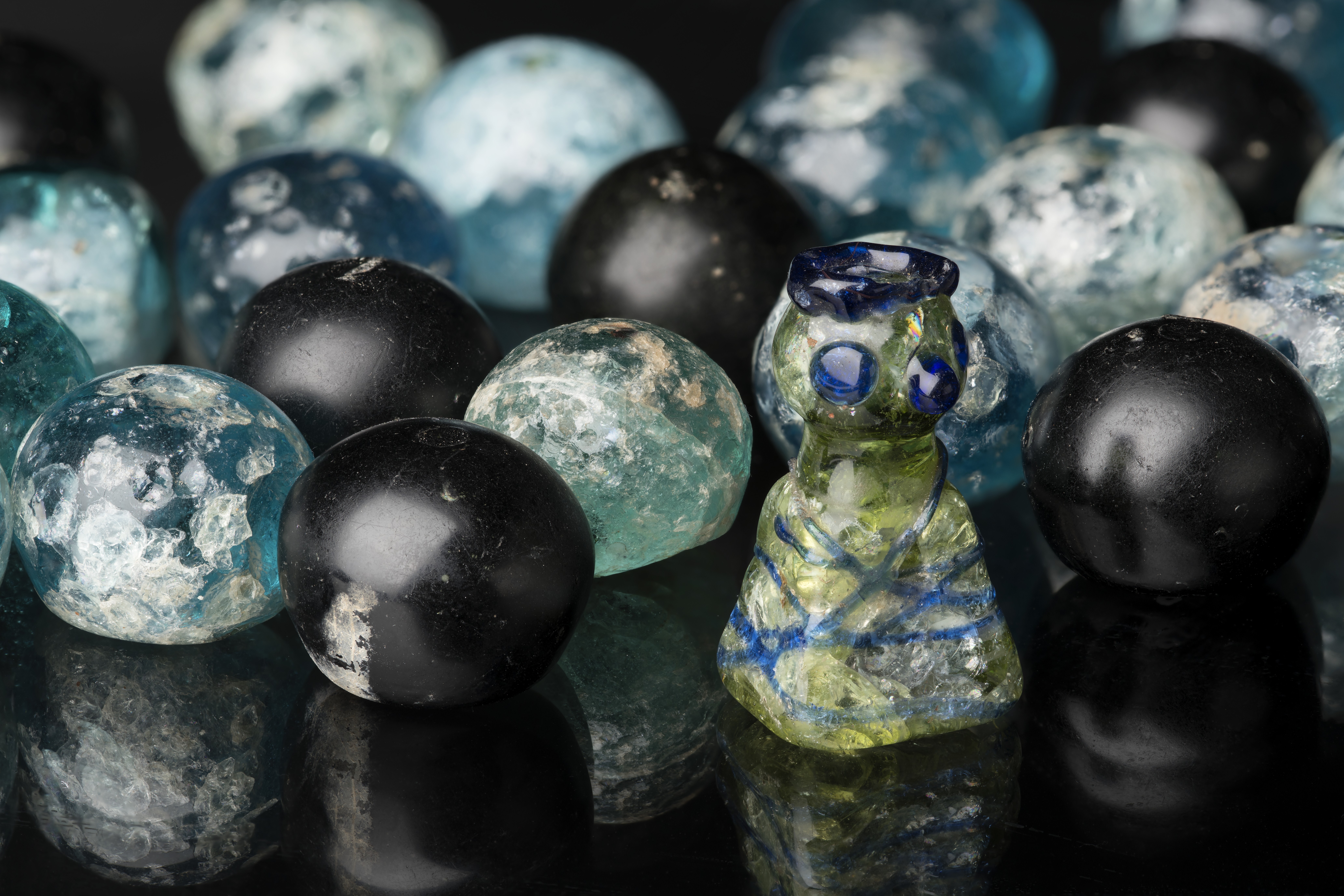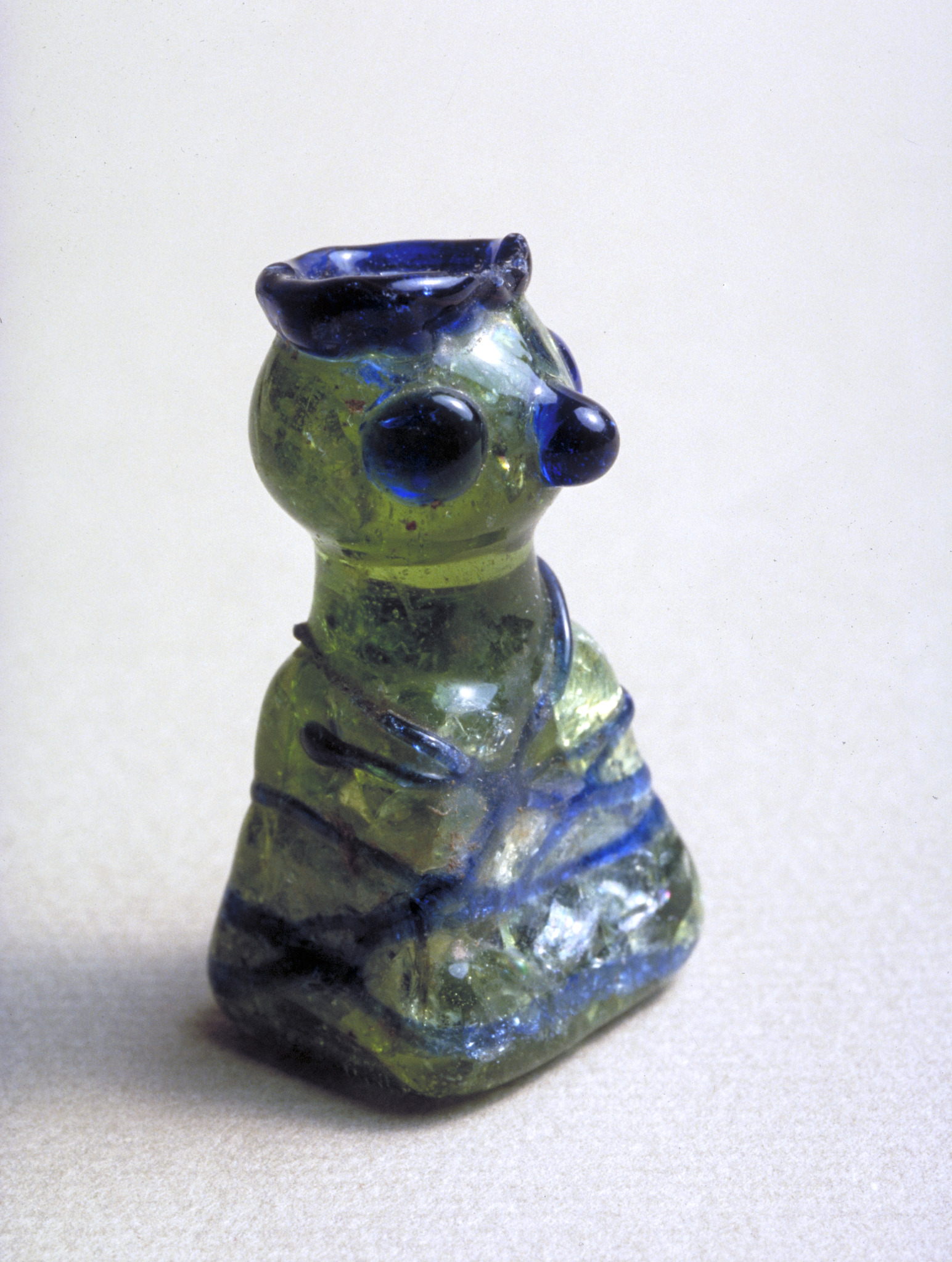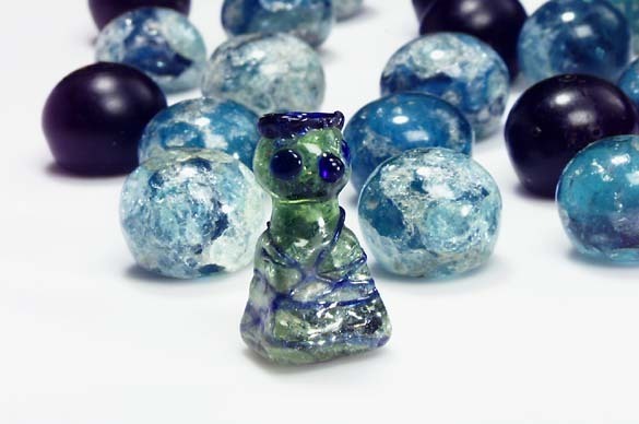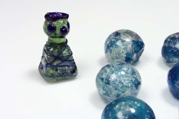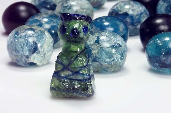Kung av glas till brädspel. Av grönt glas med blå dekor. Brädspel.