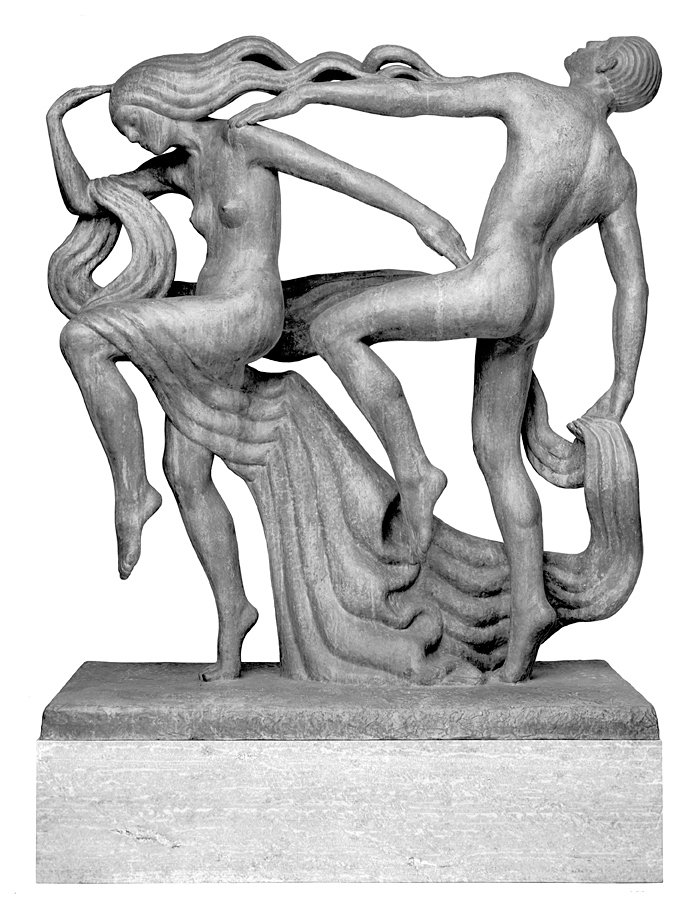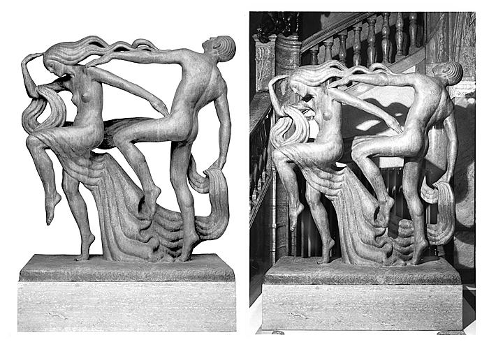 Skulptur. DANSEN, figurgrupp av brons på rekangulär sockel av Kolmårdsmarmor. Föreställer en ung kvinna och man som dansar. Artificiellt patinerad yta. Modellerad efter beställning av Wilhelmina von Hallwyl av hennes dotter Ellen Roosval hösten 1924 - våren 1925.