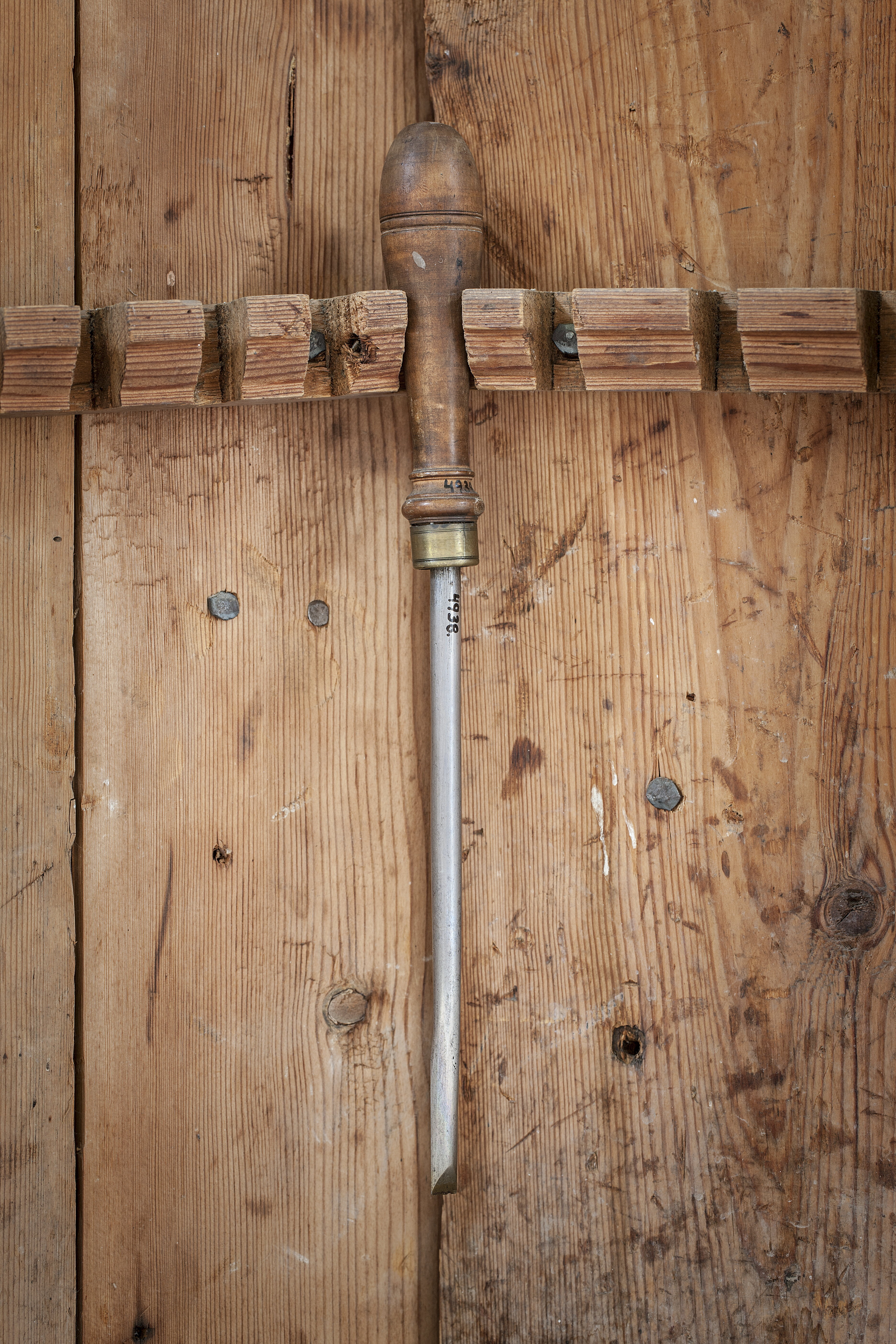 Rund klinga, i änden med halvcirkelformad genomskärning. Svarvat skaft av päronträ med två vulster nedtill ("skoklostertyp"). Mässingsring.