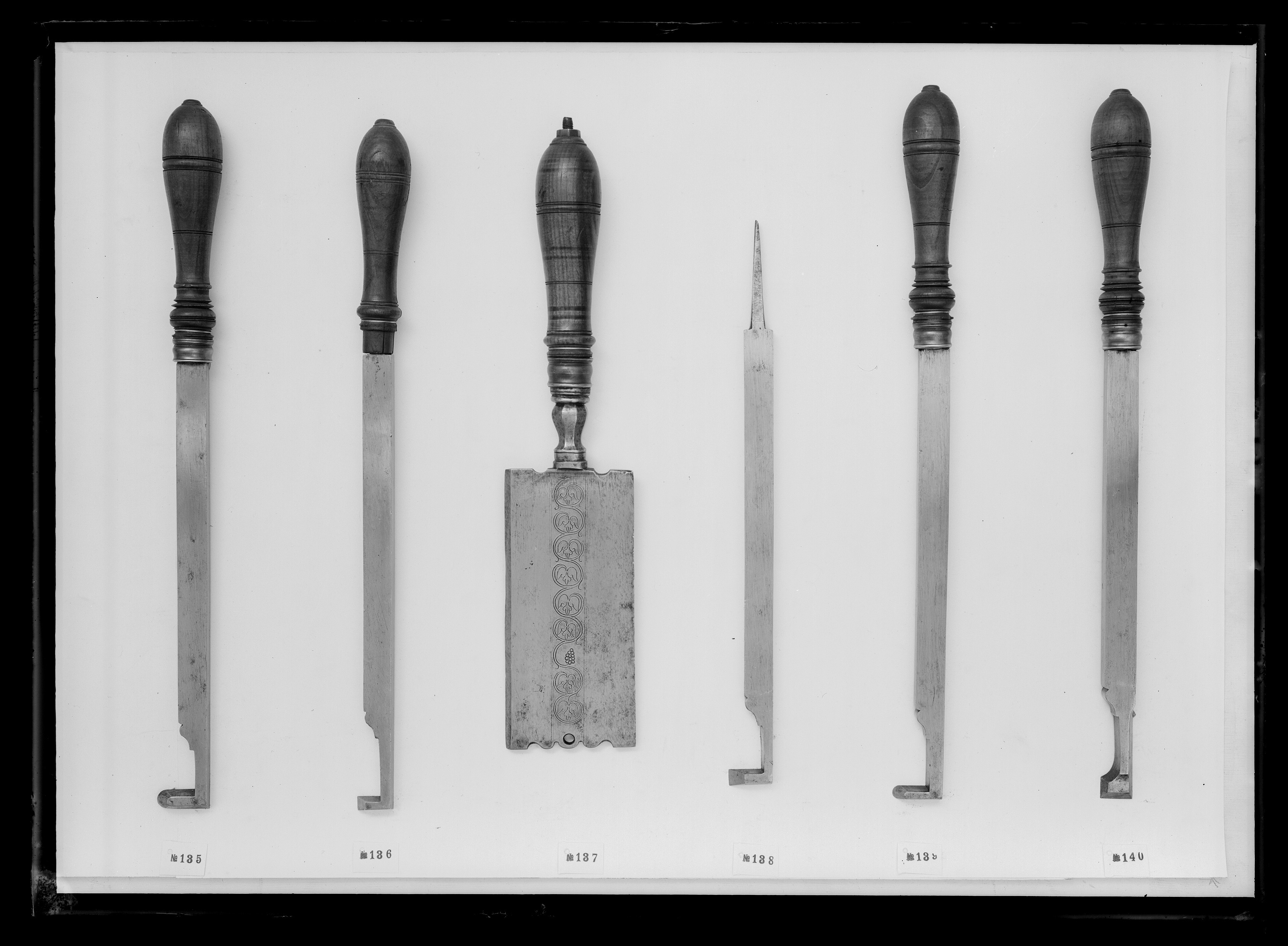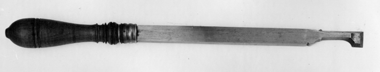 Slätstål med rak egg framtill och på sidorna. Höger egg är lång, vänster egg kort. Rät vinkel mellan eggarna. Urtag i stålet bakom vänster egg, dekorerat med en kornischformig profil vid övergången till klingan. Klingan har rektangulärt tvärsnitt. Svarvat, profilerat, kägelformigt träskaft, dekorerat med svarvade ringar och med en rad vulster vid fästet. Skaftet avslutas med en flat knopp. Fästet skott med en profilerad mässingsring. Mått: L: 436 mm, skaftl: 158 mm, största diam: 36,7 mm, egg b: 19,8 mm Stämpel: IK under krona, samt 3 mm däröver P, proberstämpel?