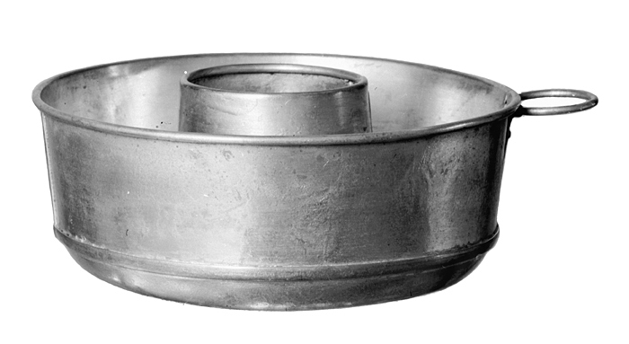 KAKFORM. Nästan cylindrisk, med vulstig bottenring och grovt, svagt koniskt mittrör, sargen medelst två tvärgående falsar hopsatt av två stycken, kring brädden en utstående stav, nedanför denna vid ena tvärfalsen en rundstavig ring, rörlig i en med två nitar fäst omvikt plåtflik; botten fastfalsad vid sargen, mittröret med en längdgående fals samt kring övre kanten en inåt utstående stav. Höjd: 6 cm.; diameter: 15,1 cm.