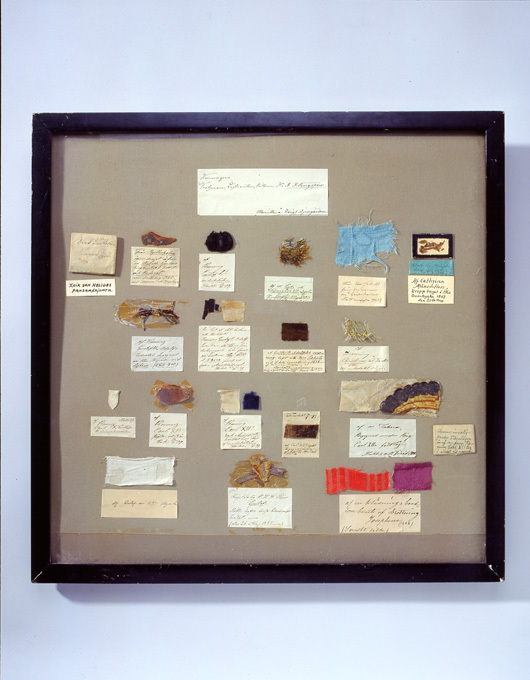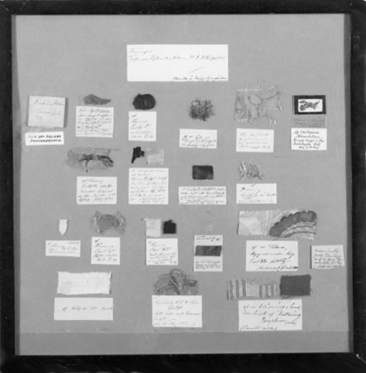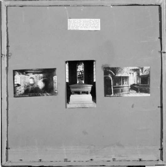 Nästan kvadratisk tavla av grå papp, skarvad nertill med en ca 30 mm bred remsa av samma material. Upptill klistrat en vit pappersetikett med bläckpåskrift: "Konungens // Trotjenare, Löjtnanten, Välborne H:A.Klingspor // Manilla å Kongl: Djurgården". Över skarven på baksidan bruna klisteremsor. Upptill klistrat på vitt papper en tryckt text: "Del av Gustaf II Adolfs svepning (spärrat) av guldtyg. Gustav II // Adolfs kista som från gravsättningen 1634 stått på // tvenne sandstenspelare i gravkorets nedre valv uppflyt- // tades till det övre koret och öppnades högtidligt i när- // varo av konung Karl XIV Johan den 6 nov. 1832. // Den tillslöts därefter och nedsattes i marmorsarkofagen. // Vid detta tillfälle erhöll Excellensen Greve Magnus // Brahe detta minne". Därnedanför klistrat tre svartvita vykort, två från Gripsholm, text: "Gripsholms slott. Erik XIV fängelse" och "Johan III:s fängelse eller Hertig Carls Kammare Gripsholm". I mitten ett vykort med text: "Turun Tuomiokirkko Kaarina Maununtyttären kappel // Åbo Domkyrka. karin Månsdotters sarkofag". Svartlackerad ram, b: 20 mm, tjocklek: 14 mm, glas.