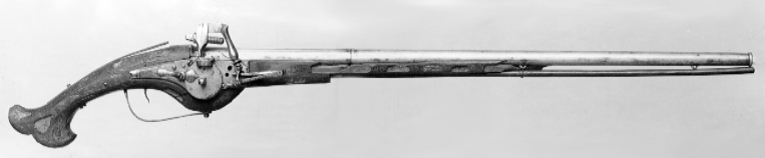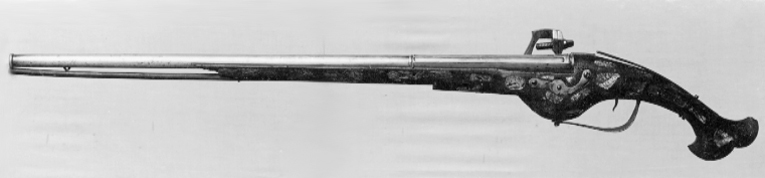 Rund, slätborrad pipa av stål med svarvad ring vid mynningen samt vid kammarens framände. Vid pipbasen en profilerad, hög ring. Kammarens ovansida kantig med smala kantlister, fältens ändar rundade. Rektangulärt svansskruvblad till kolvkulan, l: 165 mm. Stämpel: Vid pipbasen på ovansidan en sköldformig stämpel med spegelmonogram G C över stjärna (LRK vägl.1921:241). Riktmedel: Vid pipbasen en filad siktskåra. Fästning: Tre häften. Pipan fäst med två ej ursprungliga pipstift av trä. Hjullås av fransk typ med plant låsbleck med fasade kanter, nedsvängt vid hjulet, välvd bakände med konkavt urtag på spetsen. Utvändigt hjulfäst med studel kl. 9, hjärtformig platta, rundat, droppformigt löv med liten ändkula. Fängpanna med svängd gavel och låg krutskärm, streckdekor. Fängpannelock med rörlig arm, slätt, tvärt avskuret fingergrepp. Tryckknapp saknas. Hane med balusterformig kropp. Fyrsidig hals med svängd framkant, lös underkäke, tvärt avskurna käkar, käkskruv med fyrsidigt huvud. Hanfjäder med fasningar på mitten, streckdekor på ändarna, timglasformig studel, välvt fjäderlöv med nit. Hjulaxeln lagrad i sidblecket. Fästning: En, urspr. två låsskruvar. Svagt böjd avtryckare till h. om underbeslaget. Helstock av trä, böjd kolv med fiskstjärtsliknande, kluven kolvände. Nästan yttäckande dekor av tunna mässingstrådar i lister och bladslingor, infällda pärlemorplattor med grov, graverad dekor i form av fåglar(?) och blad. Vid slagfjäderns fäststift urspr. två benplattor med bladdekor, den v. bortfallen. Beslag: Pipstiftbrickor av ben med streck-och rutdekor, två återstår på v. sida. Svängt sidbleck med lagerhål för hjulaxeln. På kolvens undersida beslag med pilspetsformig framände, rektangulärt hål för slagfjäderns ände. Bandformig varbygel fäst med skruv i framänden, bakänden inskruvad i beslaget. Tillbehör: Laddstock av trä, l: 502 mm, (ej ursprunglig).