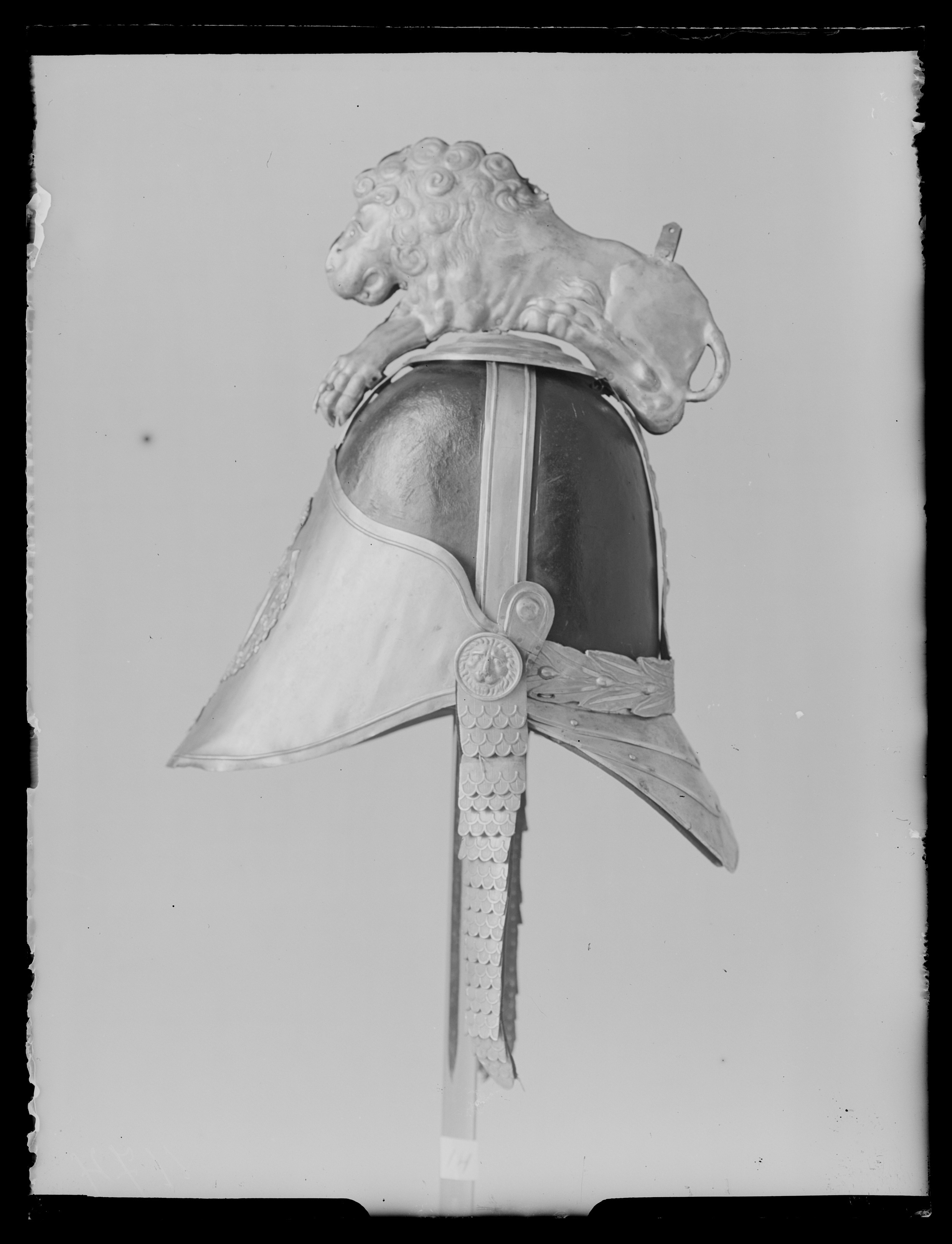 Kask för Livdrabantkåren. Kask av svartlackerat läder med beslag av förgylld mässing. På framplåten finns fäst Riksvapnet med en krönt sköld med tre kronor inom serafimerordens kedja med ordenskors. Kasken har en kam i form av ett lejon med lockig man. Lejonet är sammansatt av två delar av plåt med mönstret pressat i relief. Lejonet ligger med framsträckta framben och bakbenen uppdragna mot kroppen. Baktill på kasken finns en tredelad nackplåt. Fyra byglar går från kaskens nederkant till dess topp där de hålls samman av en rundel i tre avdelningar (ca. 11,5 cm i diameter), varpå lejonet vilar. Bygeln baktill (ca. 3,4 cm bred), liksom ett band längs kaskens nederkant baktill, har inpressad dekor i form av parvis ställda lagerblad och bär. Övriga tre byglar är släta med en upphöjd rand i var sida. Hakrem med fjällformade beslag, bredast upptill (ca. 3,6 cm) och avsmalnande nedåt (ca. 2,7 cm). Remmen har foder av svart sammet och spår efter ett knytband som varit påsytt på remmen på höger sida. Ett runt beslag dekorerat med ett lejonhuvud (ca. 3,2 cm i diameter), finns där hakremmen är fastsatt. Foder/innerhuva av brunt tunt läder. Huvan är öppen på hjässan, avslutad med flikar, i var flik finns ett hål och ett snöre är genomdraget, med snöret regleras vidden/storleken. Skärm och bakstycke har foder av blått siden. Längs kaskens nederkant är sytt ett svart band. På bakstyckets siden står skrivet: "IG F???chler". Jämför med Armemuseum inv.nr 13154 och 70521; beslag av förgylld mässing, likadana som Lrk inv.nr 22205-08, 22351-68 och 28493.