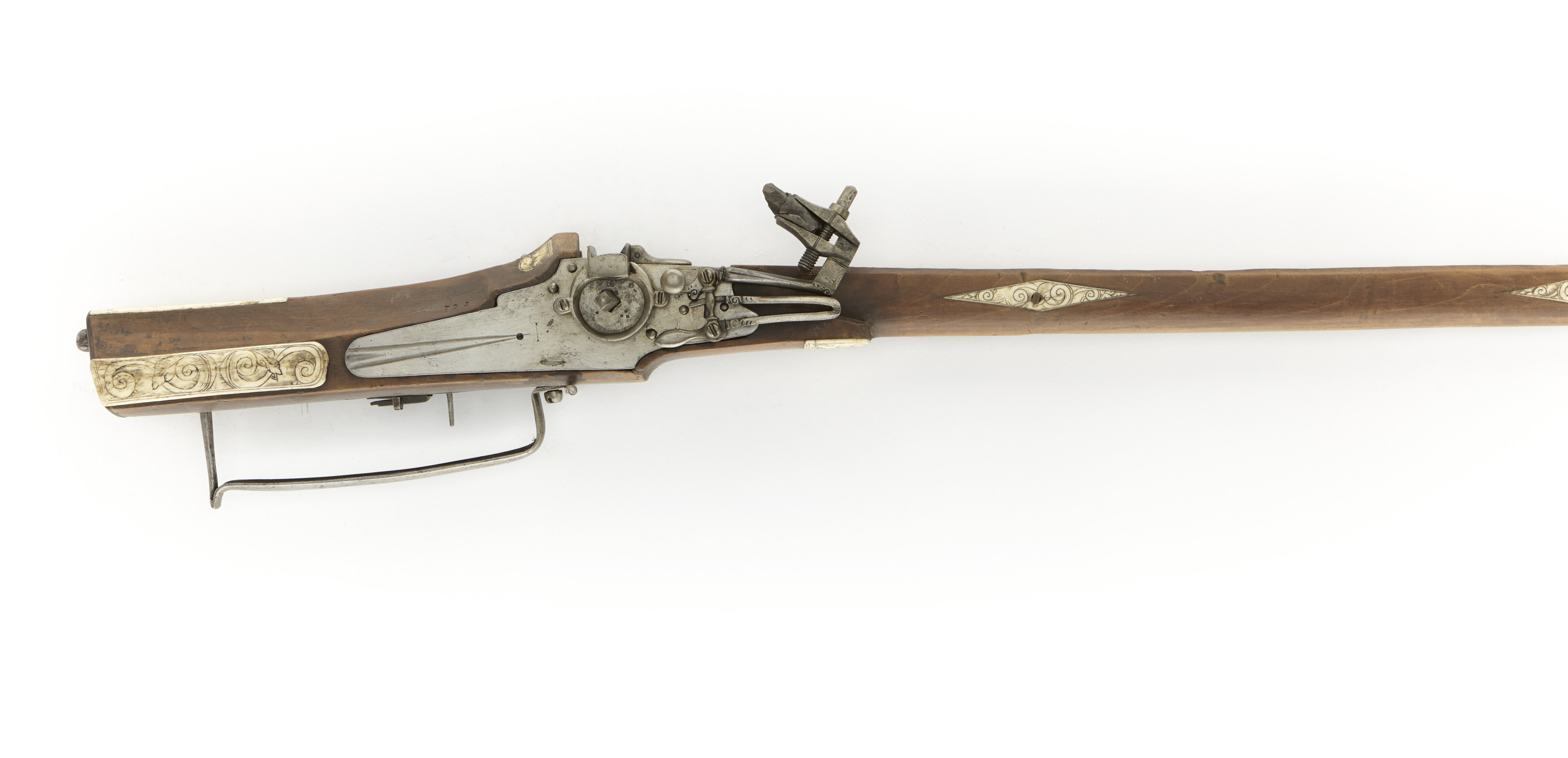 Hjullås. Låsbleck av tysk typ, bakåt avsmalnande genom två fall. Hjulet fastskruvat med ring kl.9 och kl.3. Under hjulaxeln tre punsade prickar, till vänster om hjulaxeln en punsad prick. På låsbleckets bakre del, med riktning mot hjulet graverat torn (liknar tornpipornas dekor). Hane med lös underkäke. Hel stock av valnöt. Tysk kolvtyp. Bakplåt av svart horn, stödkula av stål. Kolvlådelock av ben med graverade voluter. Benplattor på kolvryggens bakre del samt på sidorna av svansskruvbladet. På anslaget trapetsformig, s.k. holsteinsk platta, med graverade bandslingor och bladbukett. Två låsskruvar med runda brickor av ben. Sluten laddstocksränna. Vid krävan benplatta med graverat manshuvud ifört hatt. Näsband av ben. Trågformad s.k. holsteinsk varbygel. Avtryckare med spärregel. Tillbehör: Laddstock med doppsko av ben. Svavelkis i blymantel. Märkt: 791, stanstyp 5376. 1710 års inv. p.13, rum II: "46-791-1 Liten D:o (Hålsteinsk Hacka) med årtal 1618 och beensatt stock".