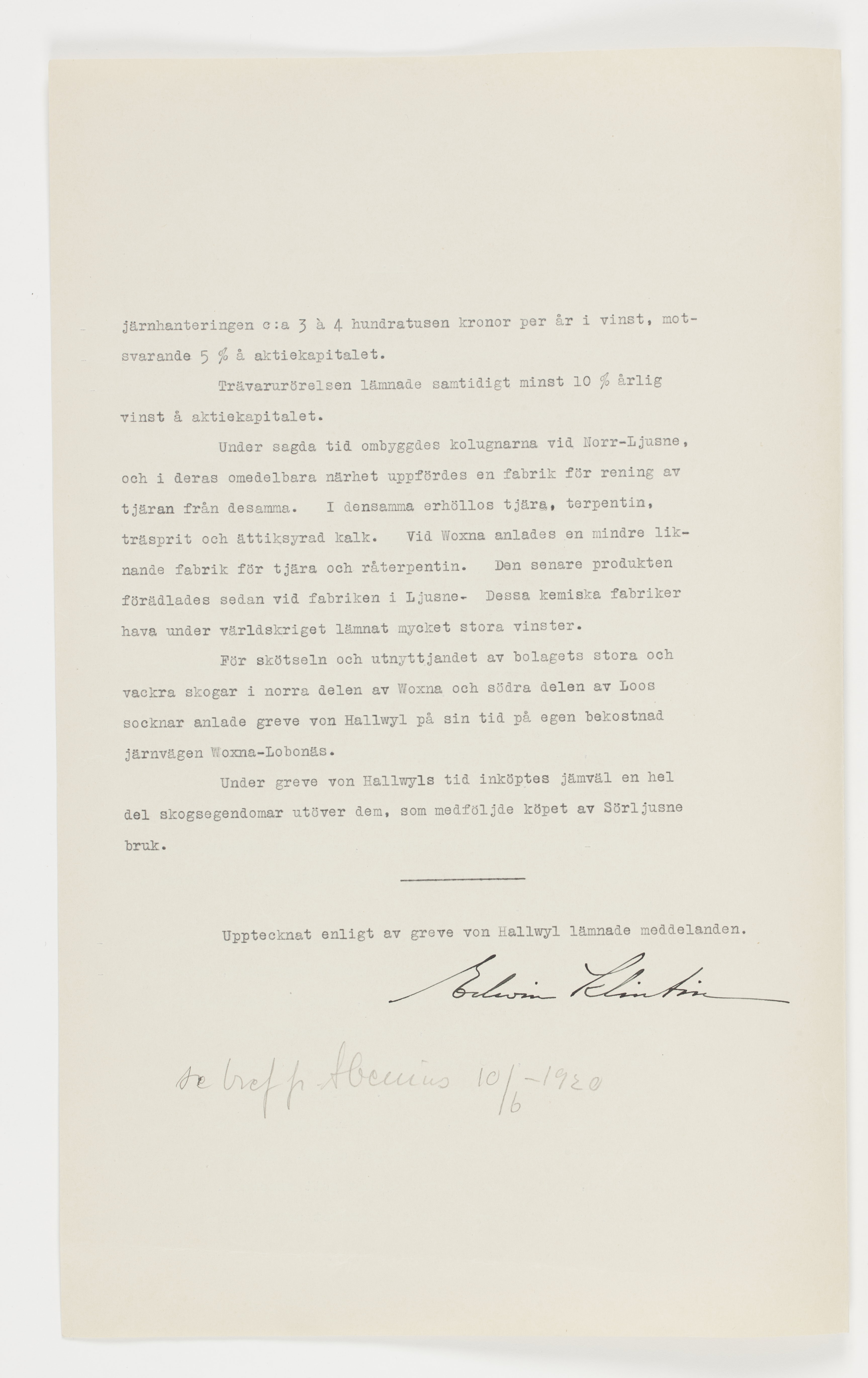 P. M. rörande Ljusne-Woxna AB. Edvin Klintin 1920. Upptecknat enligt av greve von Hallwyl lämnade uppgifter.