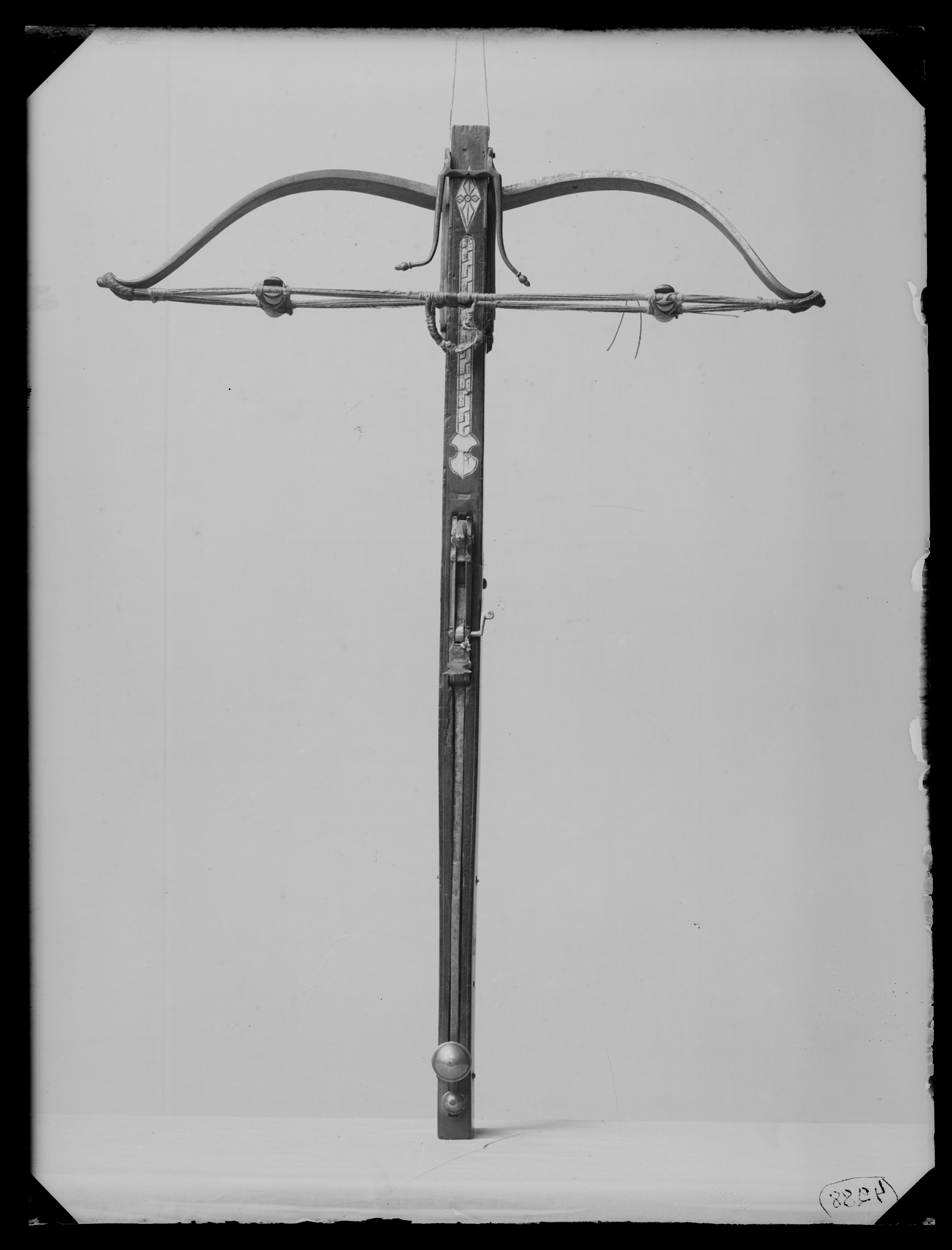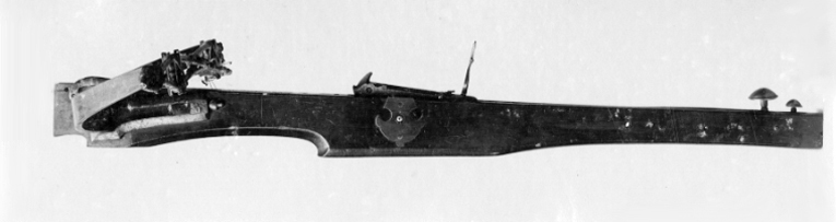 Båge av stål, något inböjd på mitten, på ena sidans baksida stämpel föreställande hjärta. Bågen fästad i stocken i genomgående rektangulärt hål och stålkilar och fasthållen med krampor av stål. Dubbel sträng av hampa på mitten sammanhållen med stålklammer och på sidorna skild med runda balusterformade pinnar av ebenholts, på mitten smala och profilerade. Låset friliggande på stockens ovansida, kombinerat med spännarm i vars ände ett runt, välvt handtag av mässing, som fästes med fjädrande lås med likadant handtag. På låset uppfällbart balusterformigt sikte. Smal kolv av valnöt (kubamahogny?) med på låsets sidor bladformade nedåtriktade inläggningar av mässing. På stockens ovansida framför låset beninläggning, i mitten bandformig närmast låset sköldformig och närmast bågen rombformig. Framtill på stockens sidor rektangulära mässingsbleck och gaffel med två utåtböjda klor (för korn).