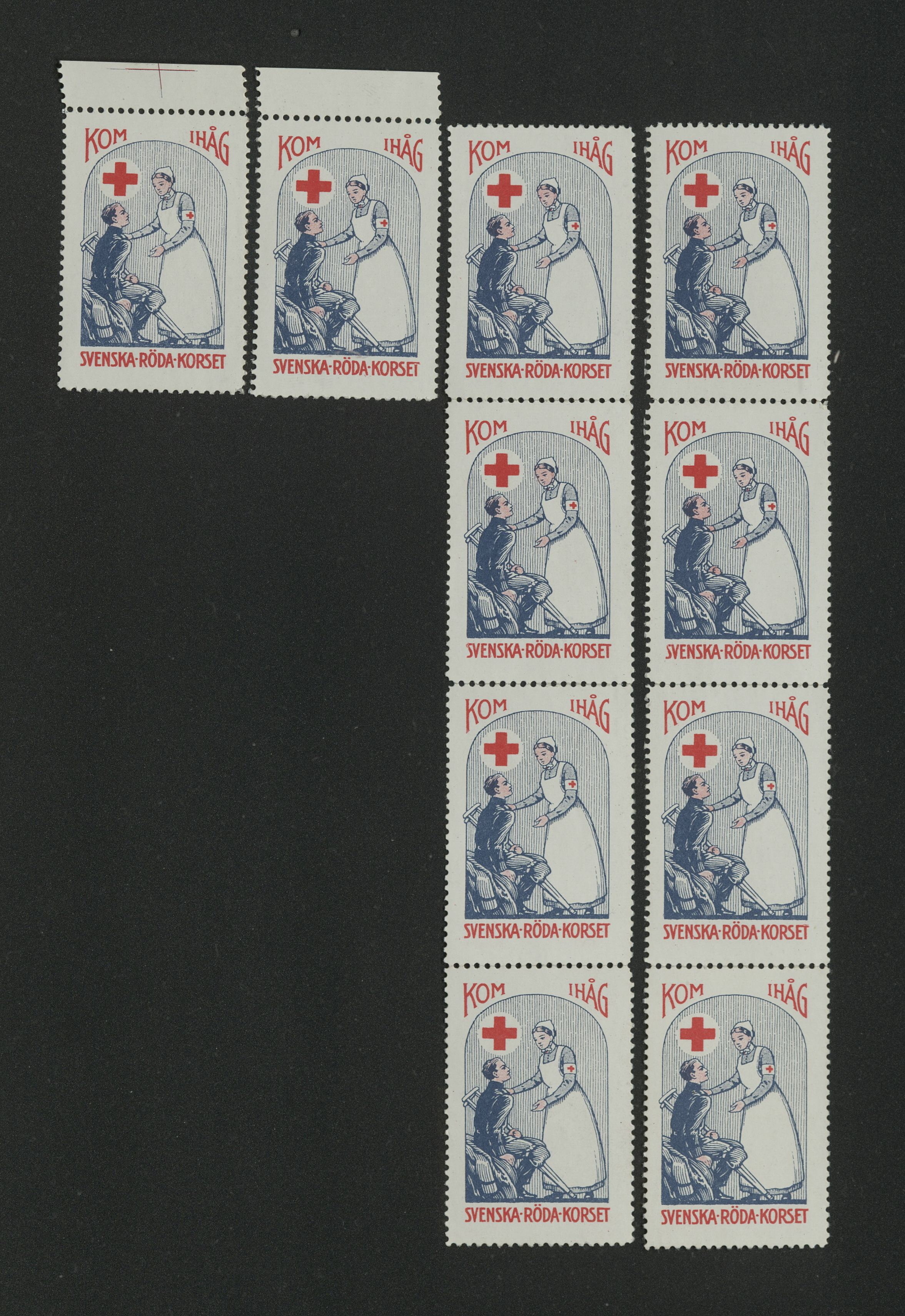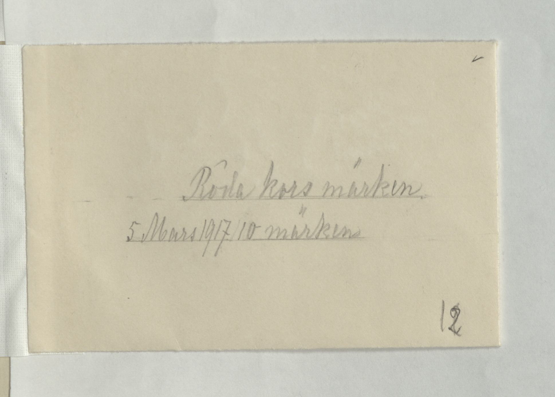 Utdrag ur katalogverket: "Rödakorsetmärken. »Kom ihåg Svenska Röda Korset.» 5 mars 1917. Tr. i blått och rödt. Gummerad baksida. 10 s."