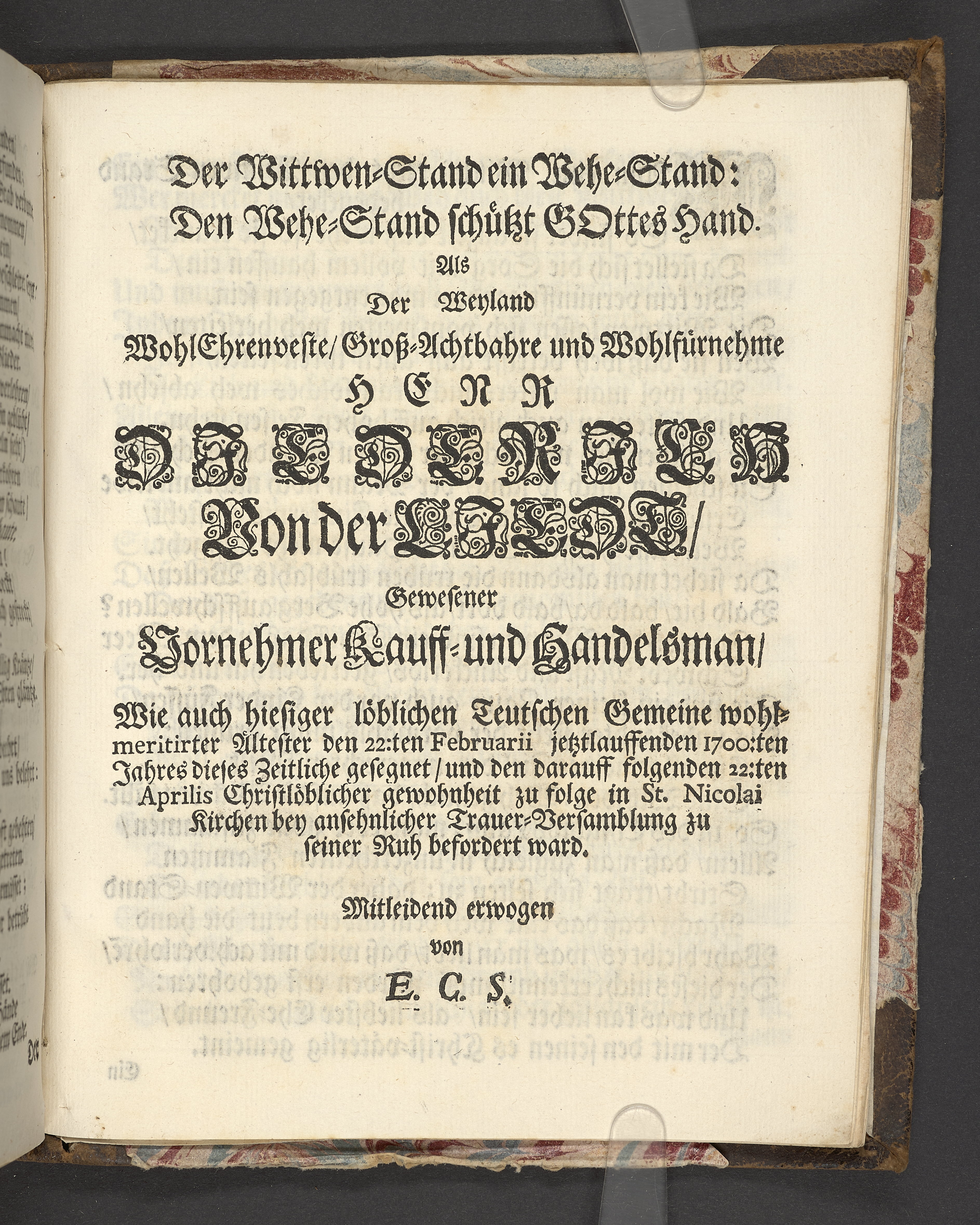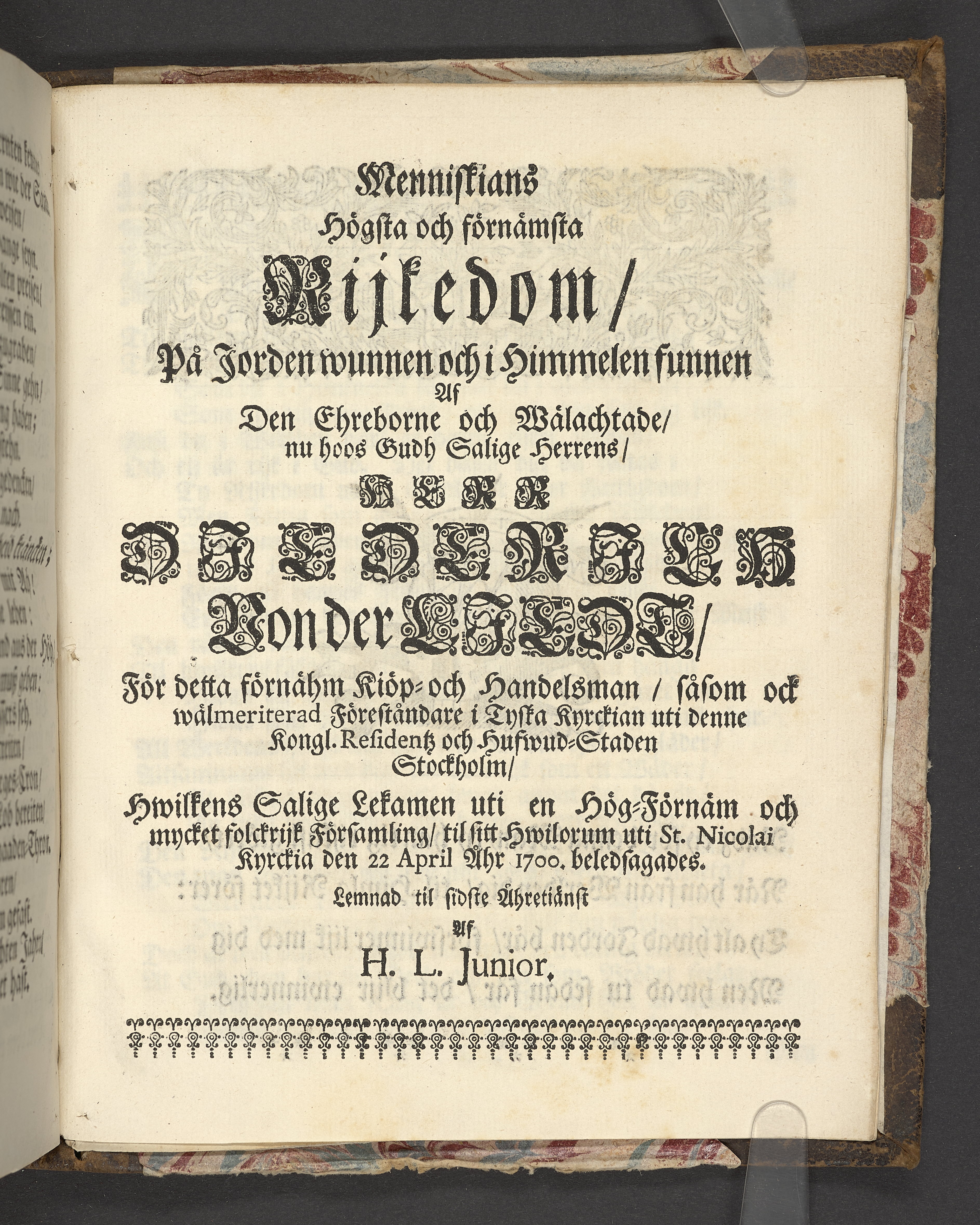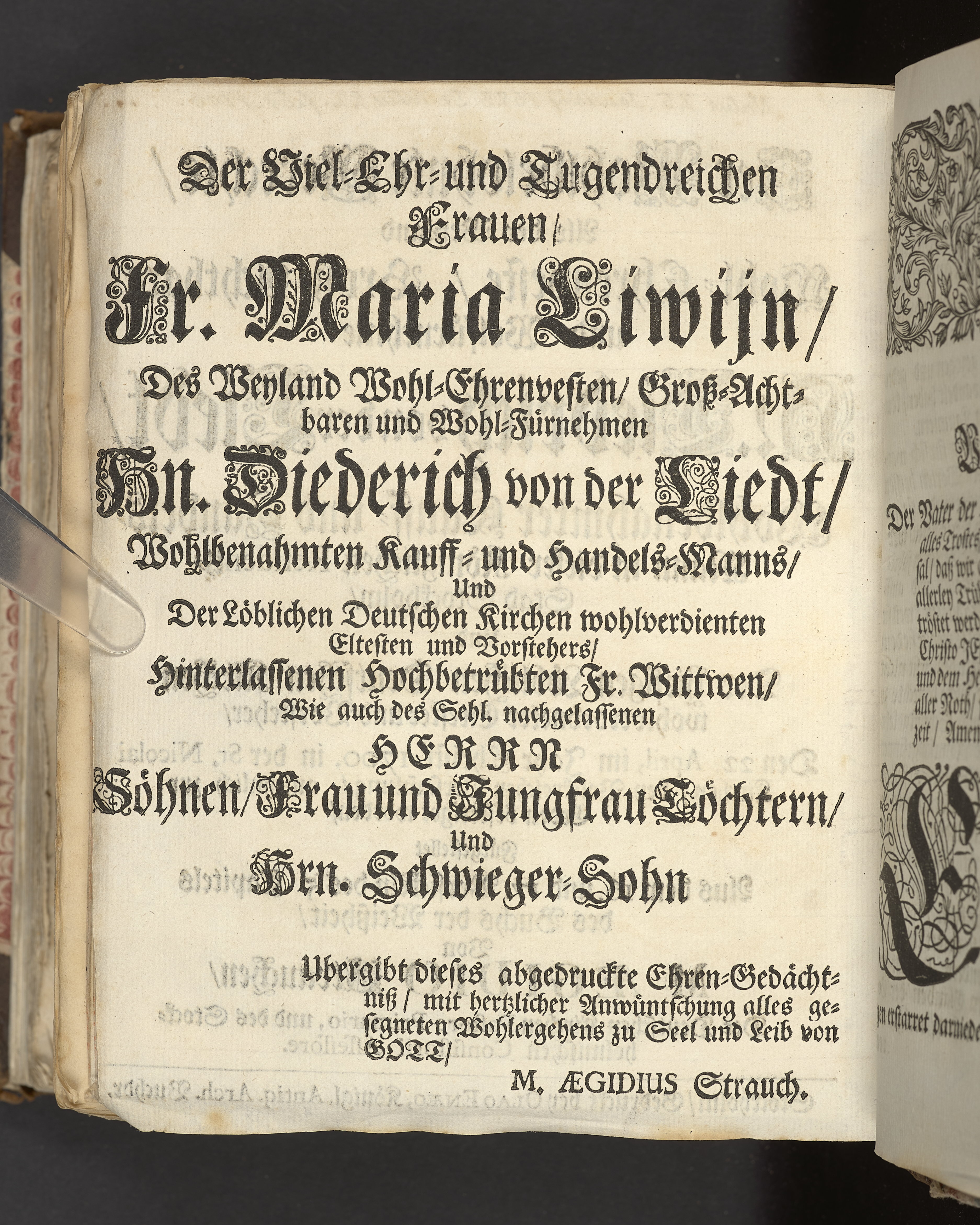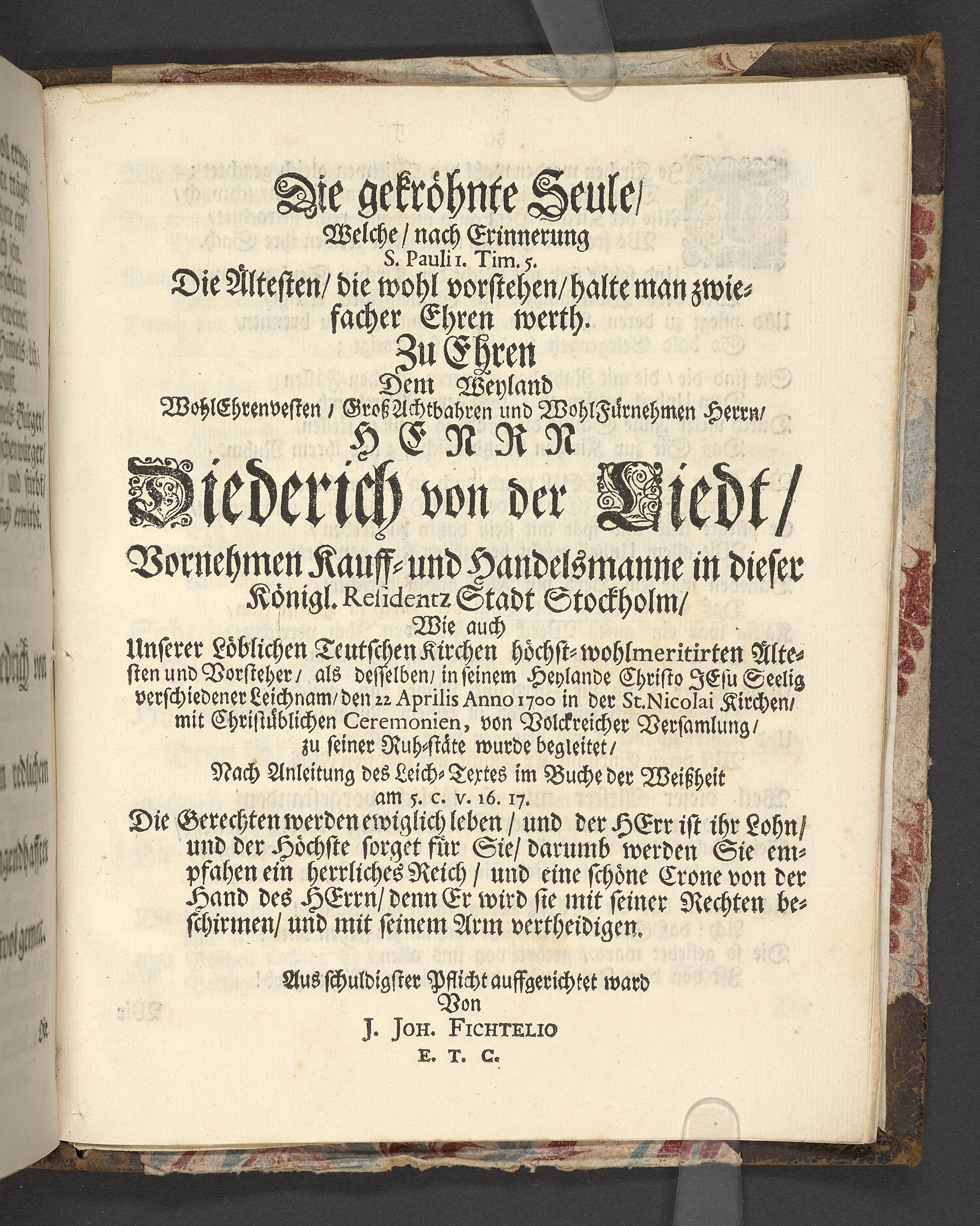 Der wohlbelohnte Gerechte, als der Weyland wohl-ehrenveste ... Diedrich von der Liedt, wohlbenahmter Kauff- und Handels-Mann in dieser königlichen Residentz-Stad Stockholm, und der hiesigen löblichen deutschen Kirchen wohlverordneter Eltester und Vorsteher, den 22. April, im Jahr Christi 1700. in der St. Nicolai Kirchen, bey volckreicher Versamlung, ansehnlich zur Erden bestetiget worden, fürgestellet aus dem 16. und 17. Versickeln des 5. Capitels des Buchs der Weiszheit, von M. Ægidio Strauchen ... Stockholm, gedruckt bey Olao Enæo, königl. Antiq. Arch. Buchdr.