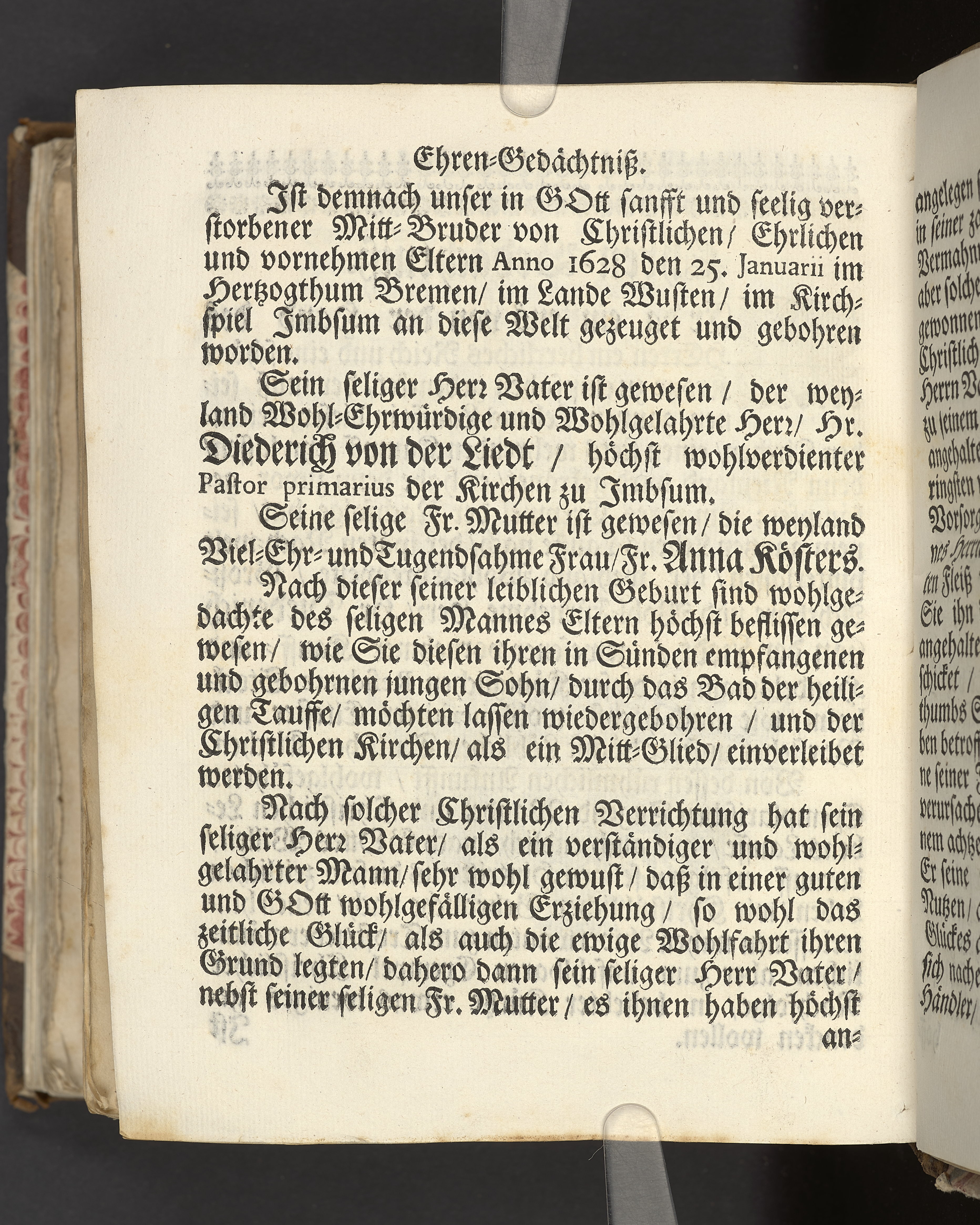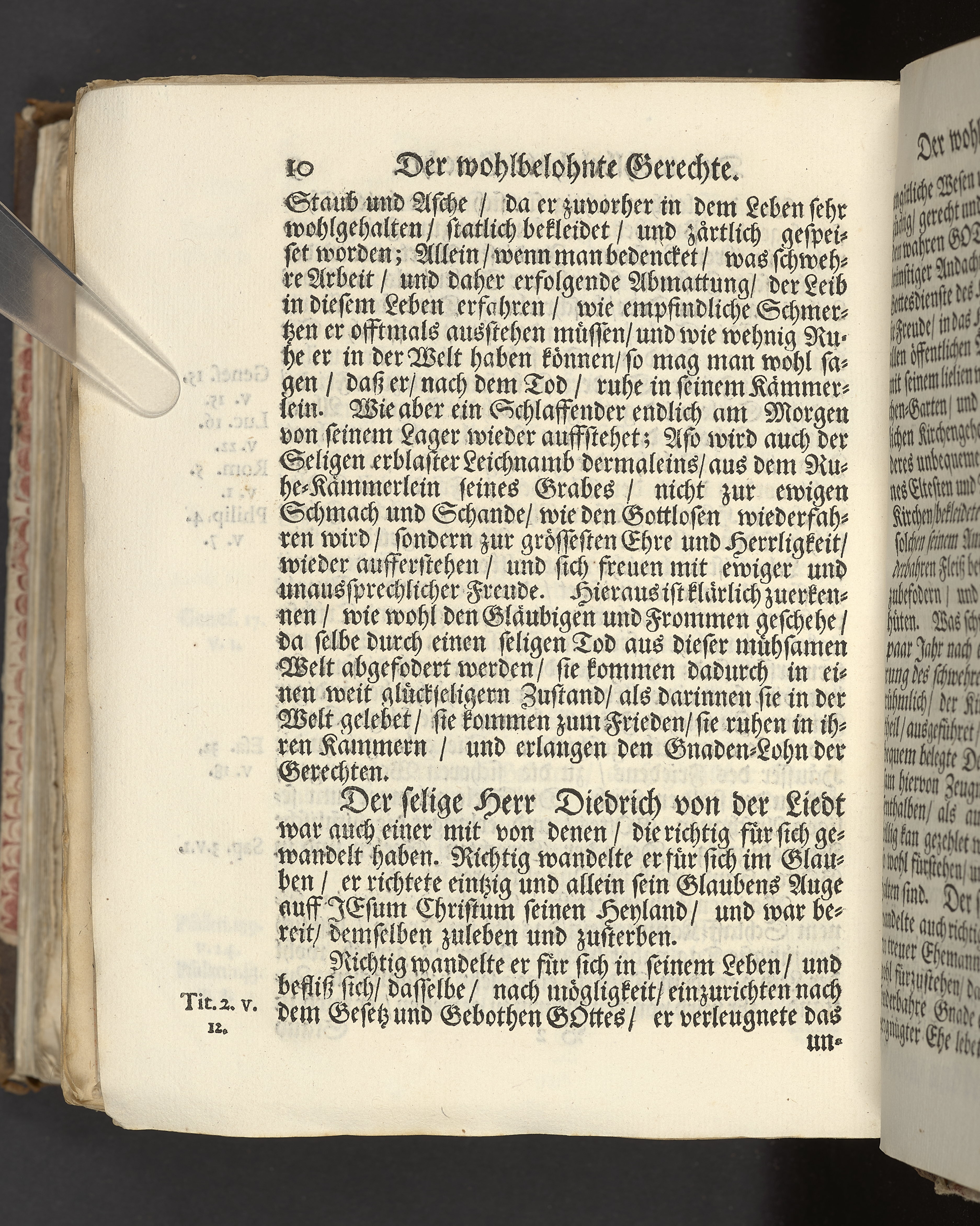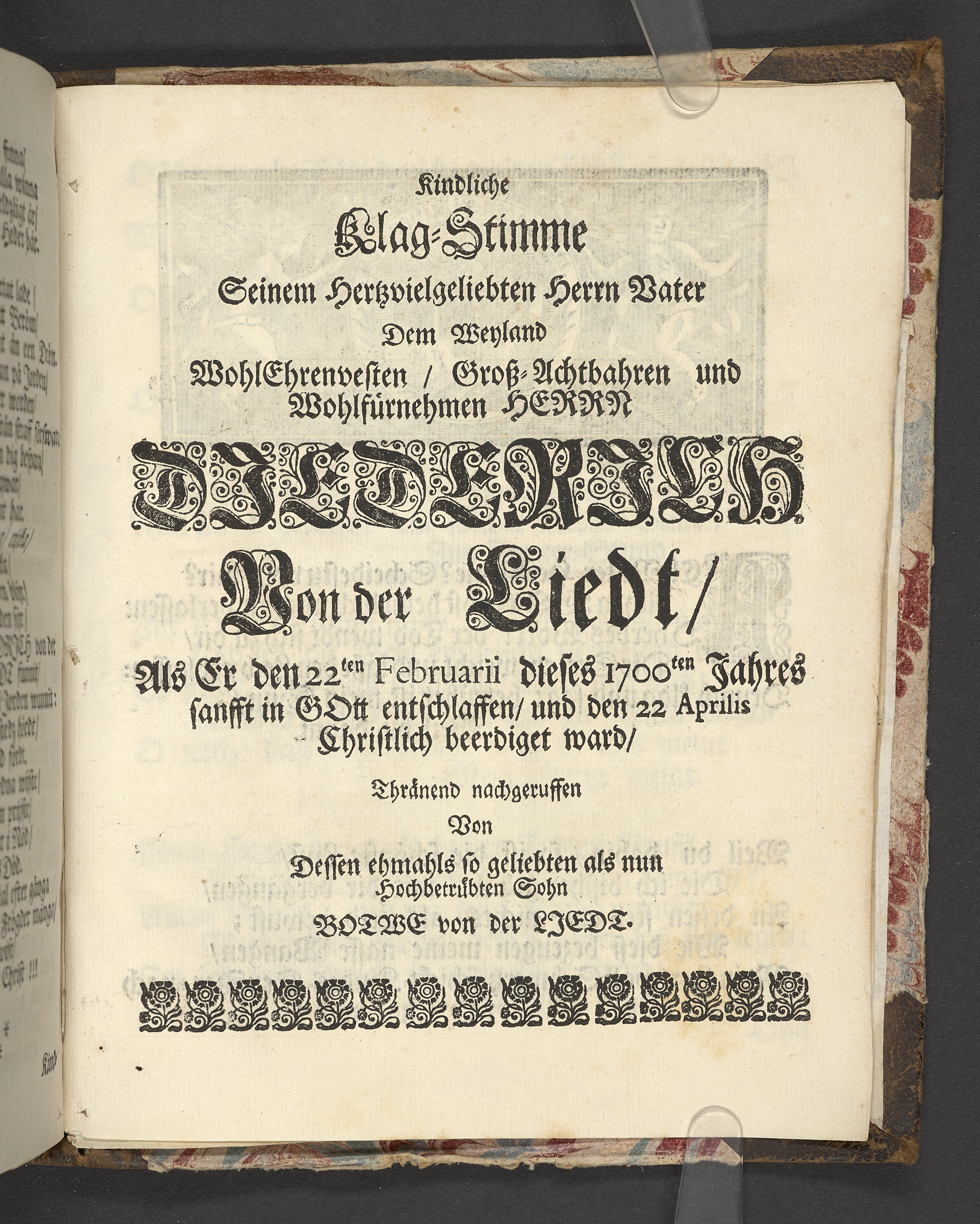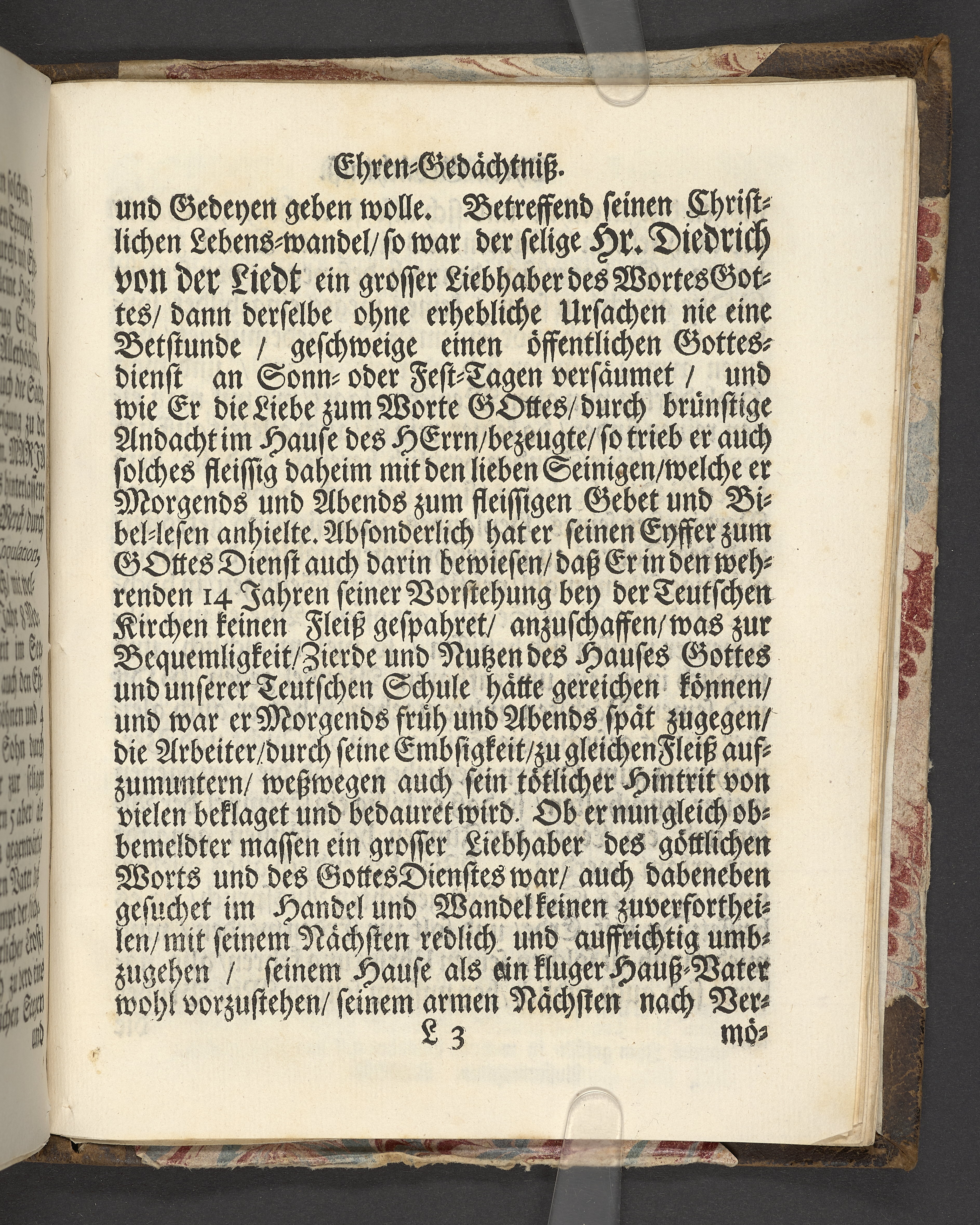 Der wohlbelohnte Gerechte, als der Weyland wohl-ehrenveste ... Diedrich von der Liedt, wohlbenahmter Kauff- und Handels-Mann in dieser königlichen Residentz-Stad Stockholm, und der hiesigen löblichen deutschen Kirchen wohlverordneter Eltester und Vorsteher, den 22. April, im Jahr Christi 1700. in der St. Nicolai Kirchen, bey volckreicher Versamlung, ansehnlich zur Erden bestetiget worden, fürgestellet aus dem 16. und 17. Versickeln des 5. Capitels des Buchs der Weiszheit, von M. Ægidio Strauchen ... Stockholm, gedruckt bey Olao Enæo, königl. Antiq. Arch. Buchdr.