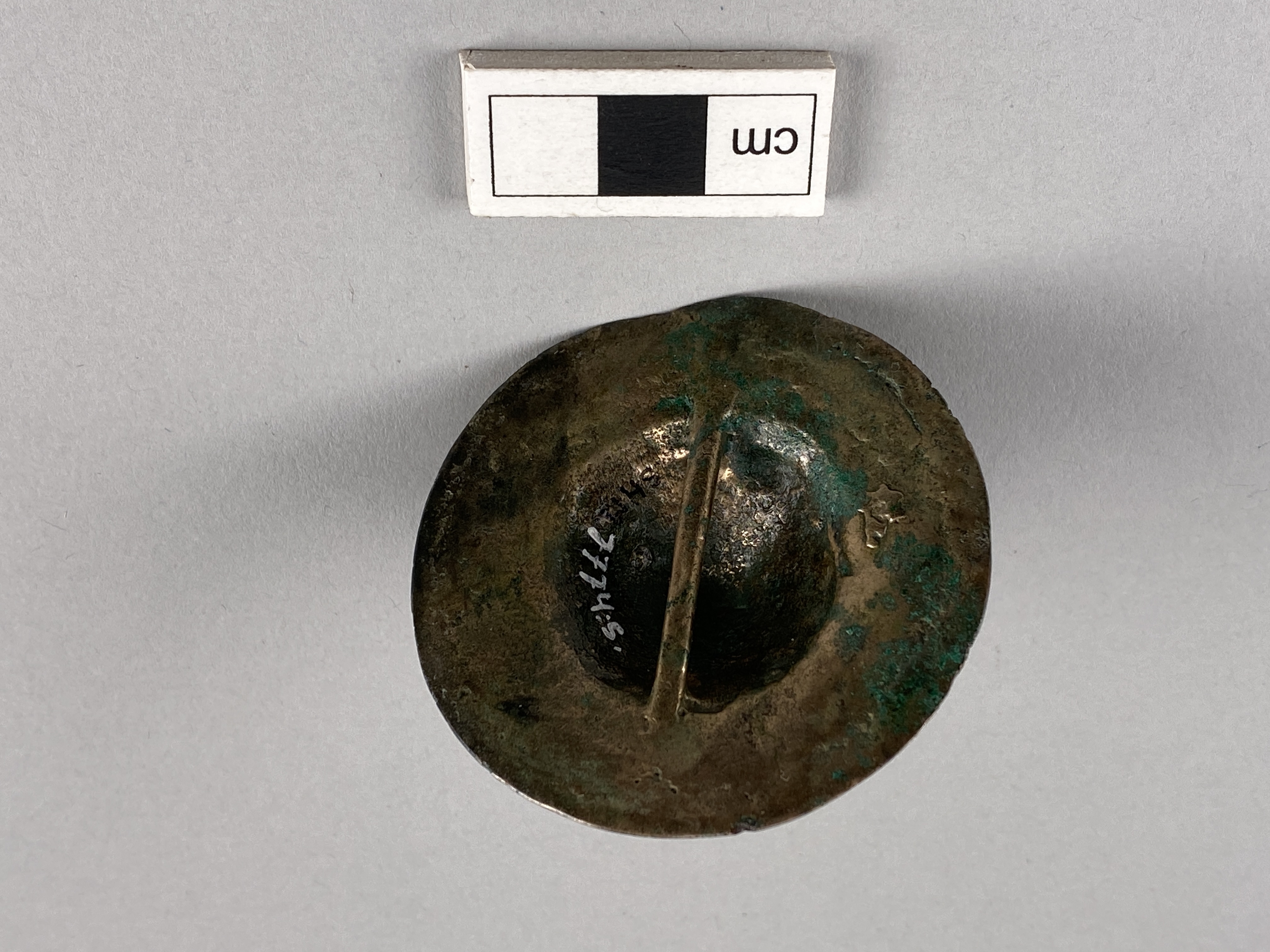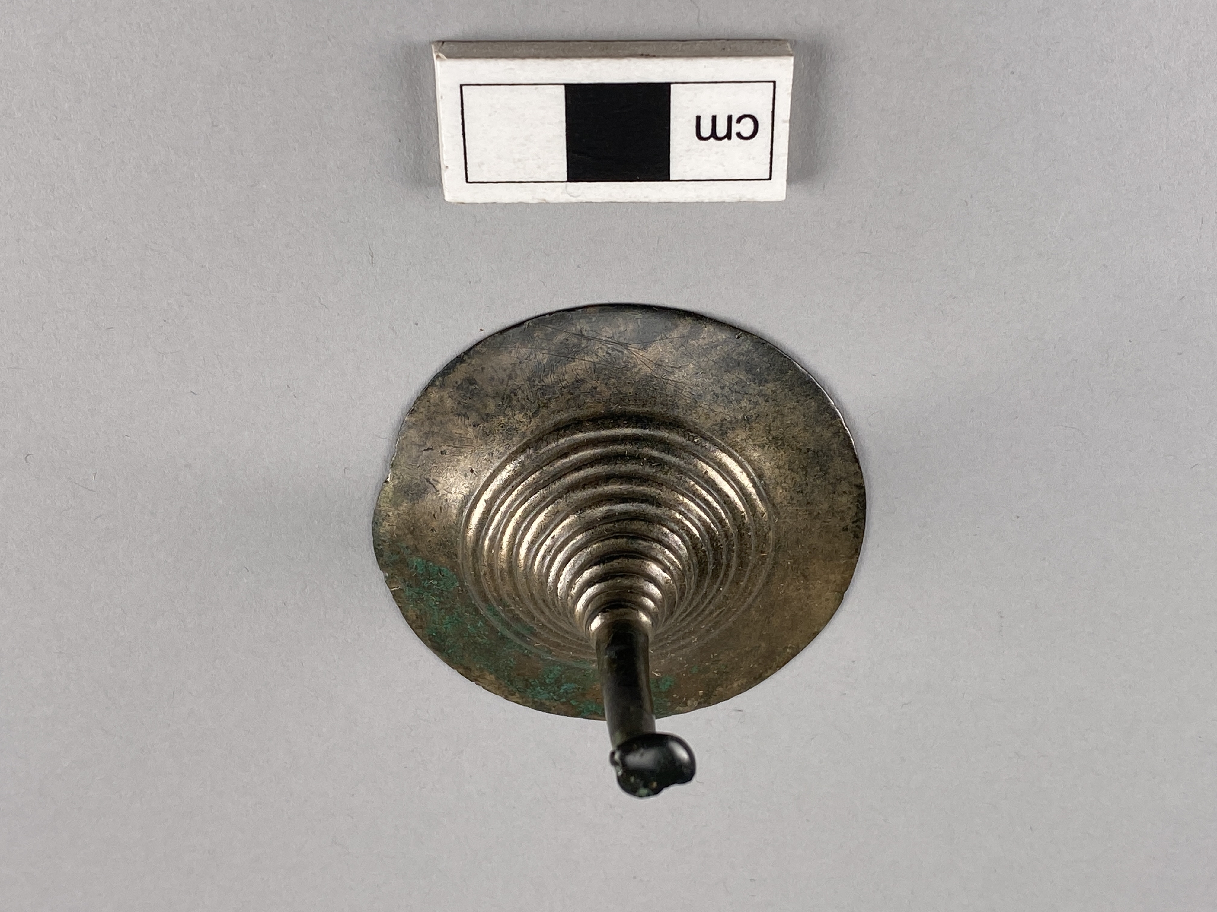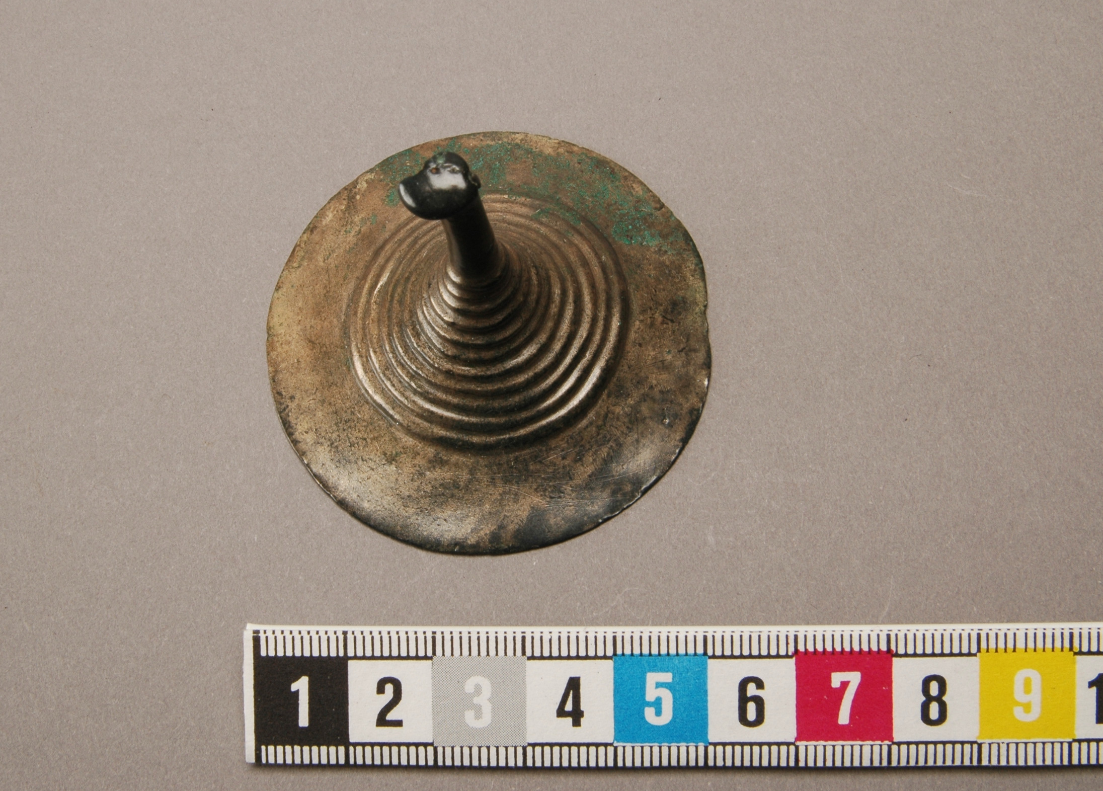 Tutulus av brons vars knopp på stången är stor, platt. Tvärslån på baksidan är inte märkbart nött.