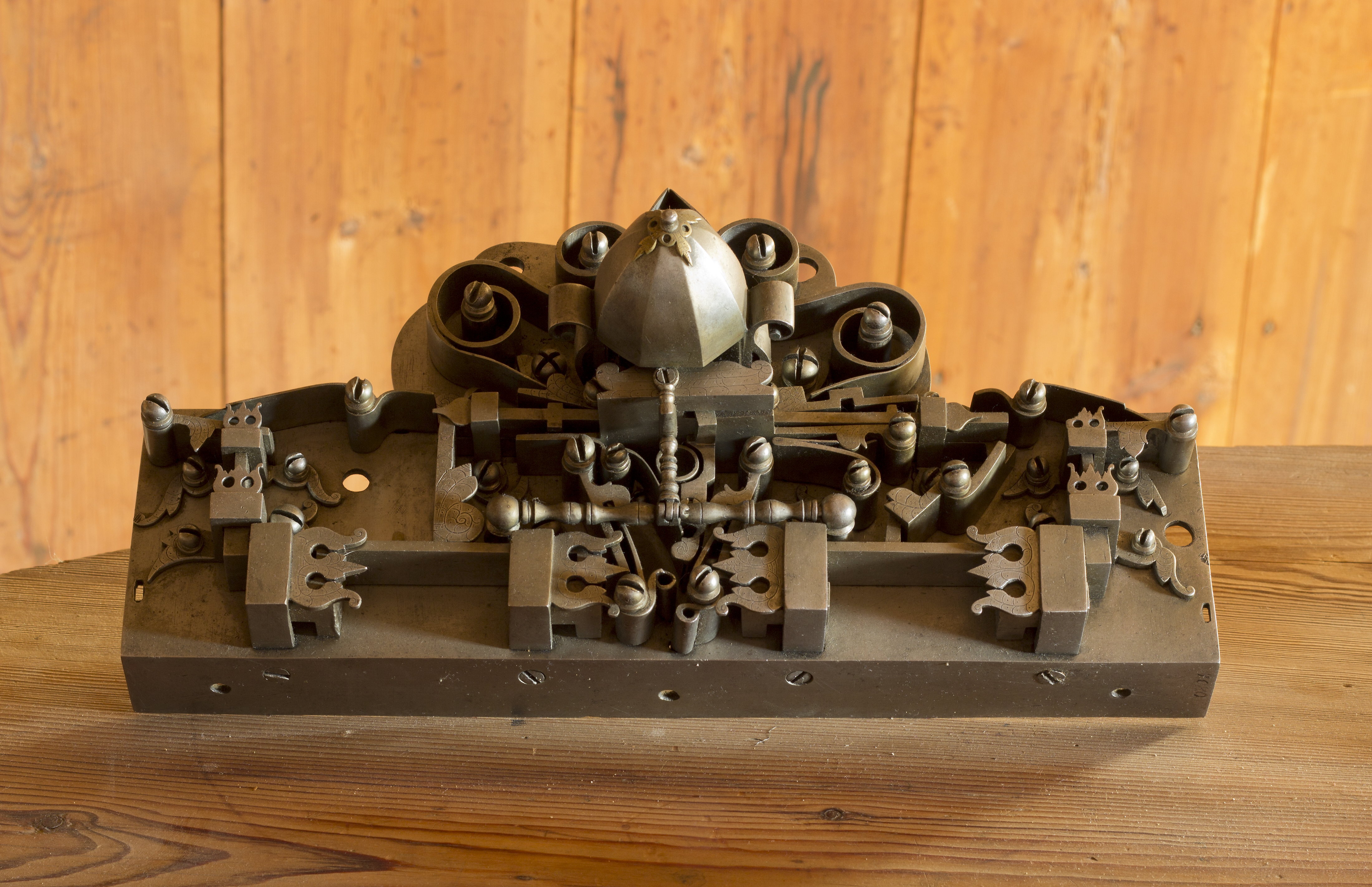 Av stål. Vågrätt rektangulärt låsbleck, nertill utvidgat och profilerat. Alla låsdelarna utvändigt. Åttkantig kupolliknande nyckelkupa, upptill med mässingsornament. "1649 12.11 Dem Schlosser vor die beden Schlosser so meijsterstuck." K.G Wrangel befann sig 1649, nov. i Nyrnberg