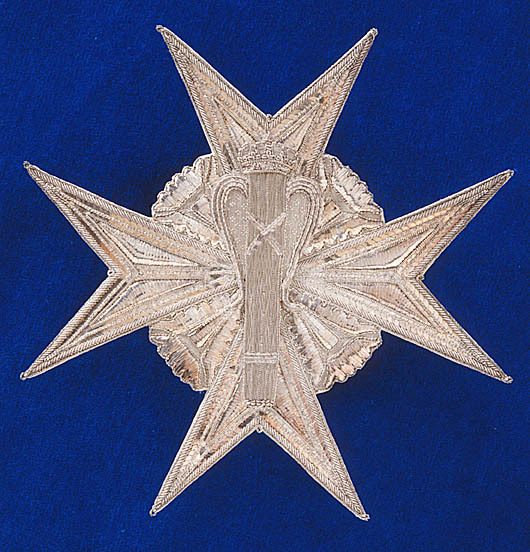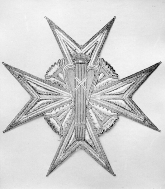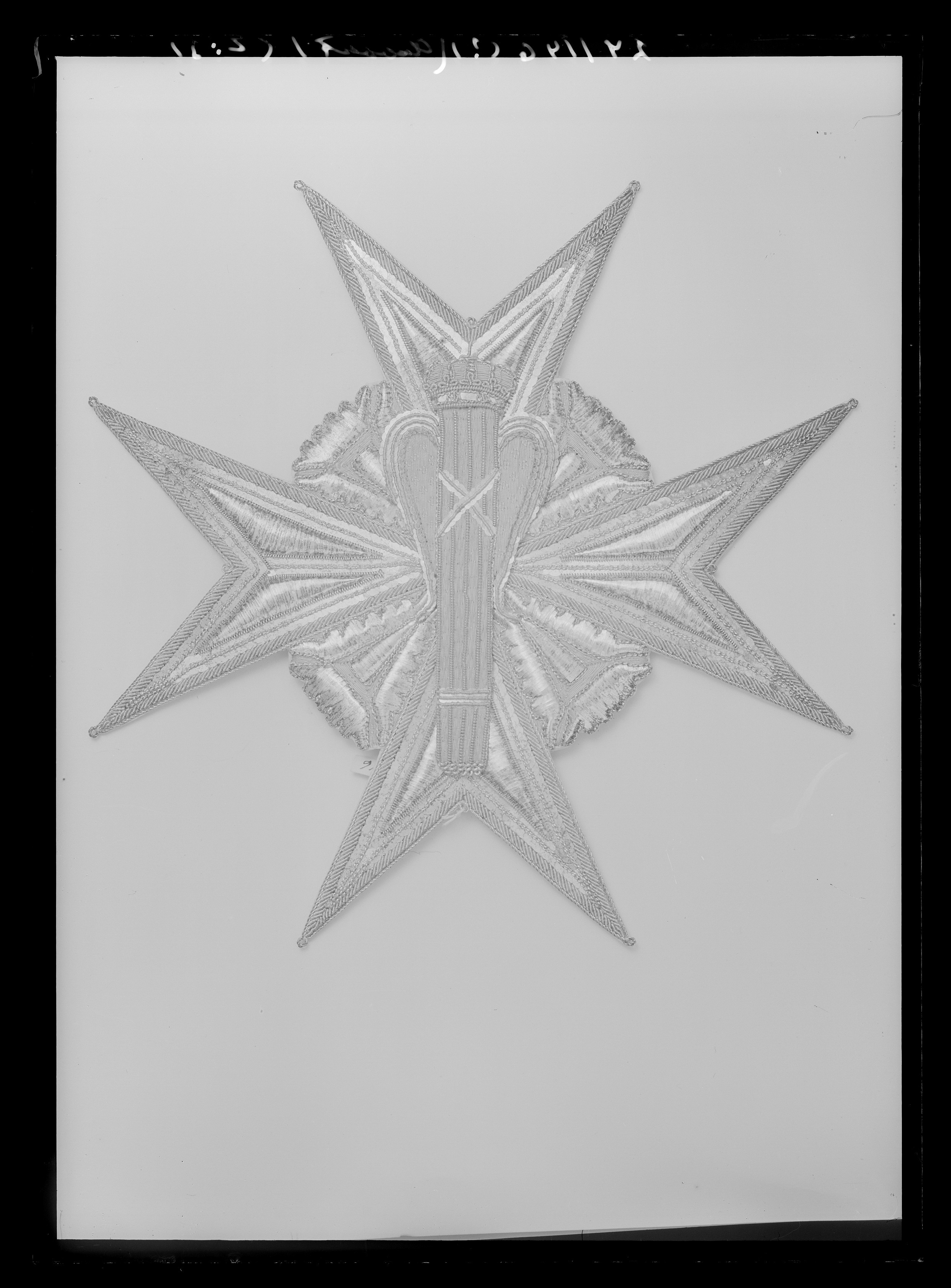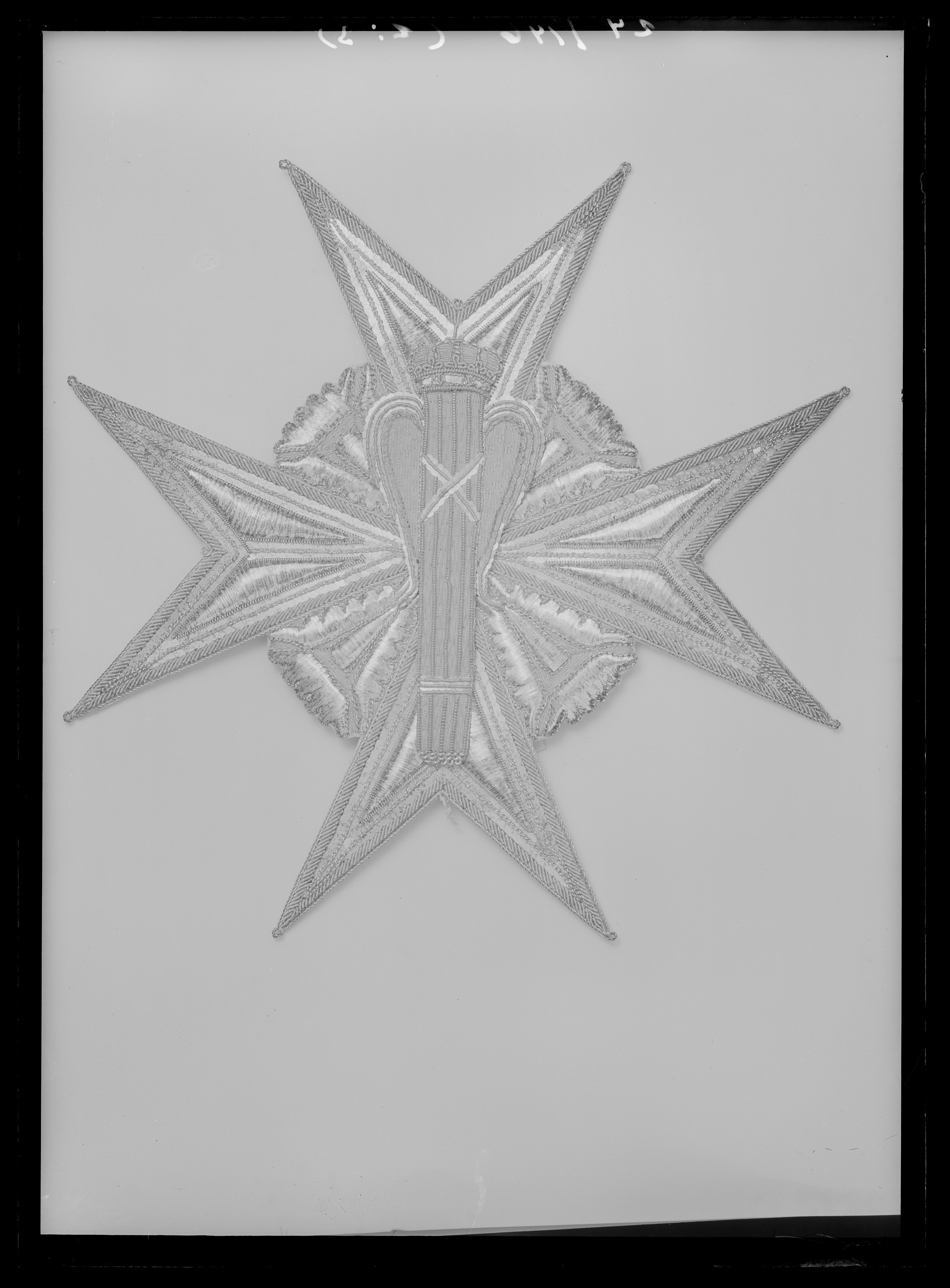 Malteserkors broderat med silverlan, -kantiljer och -paljetter. Mellan korsarmarna holsteinska nässelblad av silvertråd, -lan och -kantiljer. Över de lodräta korsarmarna fäst en krönt vase av silvertråd, -paljetter och på kronringen ett silverlan. Baksidan täckt med ett vitt papper.