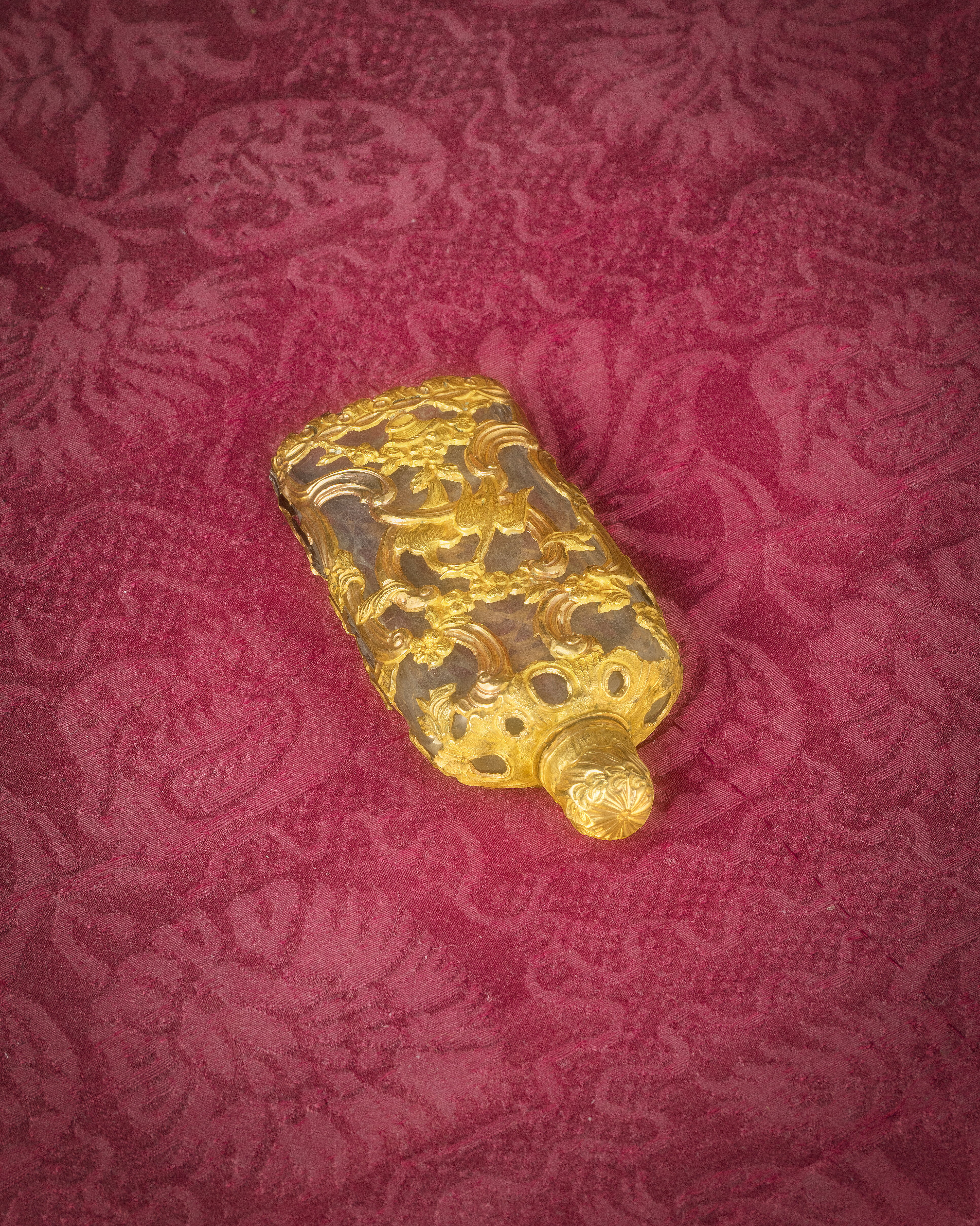Omkring år 1750. Glas och guld en deux couleurs. Hölje och skruvlock av guld. Höljet genombrutet och rikt ornerat med rokokoornament, fruktkorg och girlander samt två kyssande fåglar, lika på båda sidor. Ostämplad. Sko inv. 1845: 1 st. parfym flaska af slipad Crystall, överdragen med Ornamenter i guld. denna parfym flaska har tillhört Drottning Gunilla Bielke, köpts på auctjon efter General Majoren C. Hård som tillhandlat sig den af någon af Bjelkiska arfvingarne. Skänkt till Sko kloster af hans Excellence Riksmarskalken Grefve M. Brahe 1844 (Proveniensen omöjlig på stilmässiga grunder).