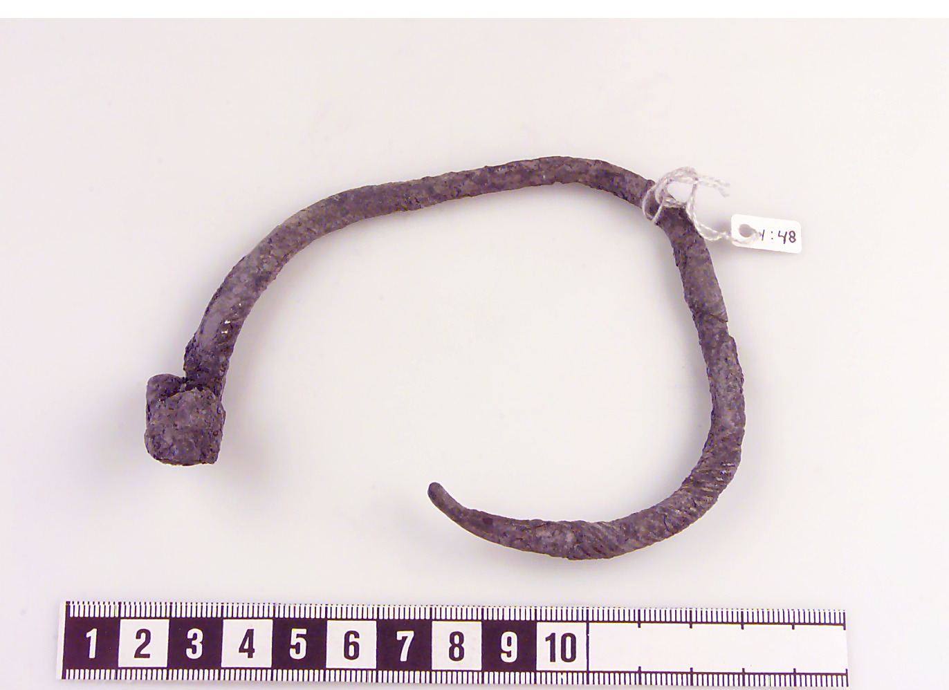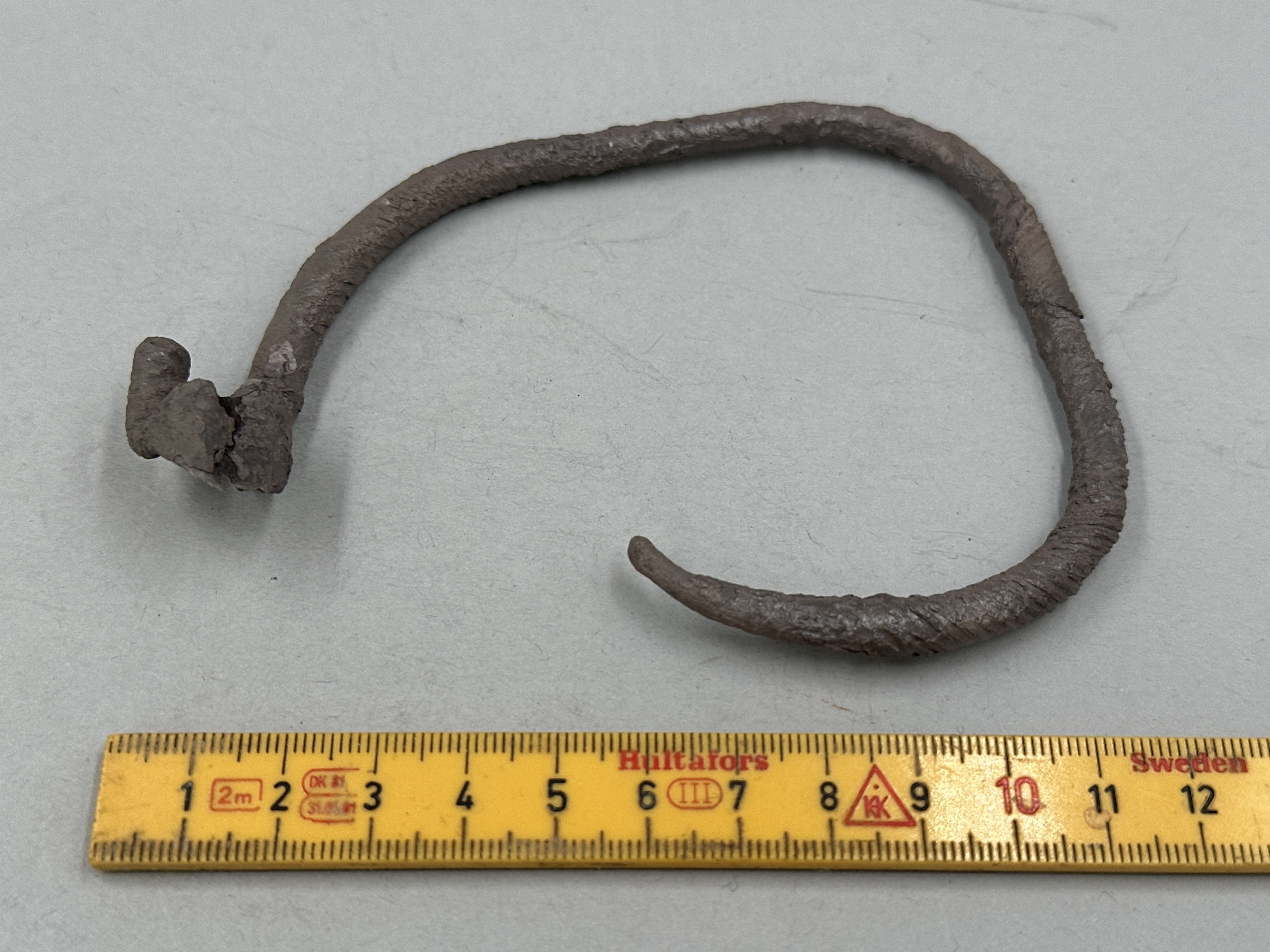 Tillknycklad rundad ten som i ena änden är tillplattad och tillbakaböjd. Ställvis spiralräfflad. Avbruten i båda ändar. Skadat ytskikt.