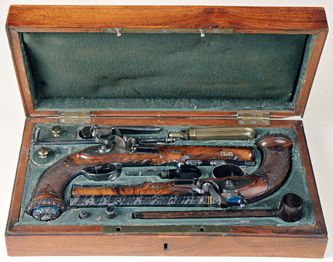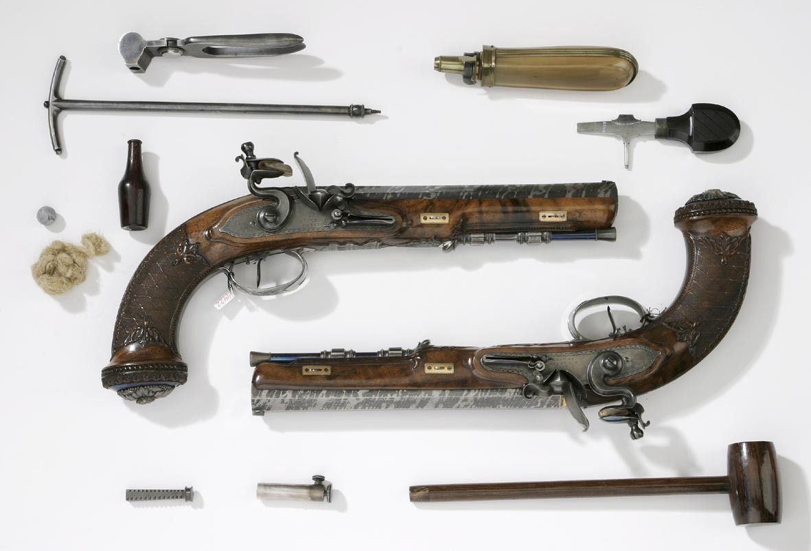 Etui till flintlåspistoler med tillbehör nr 4421-4433, Francois Ulrich, Bern ca 1800.