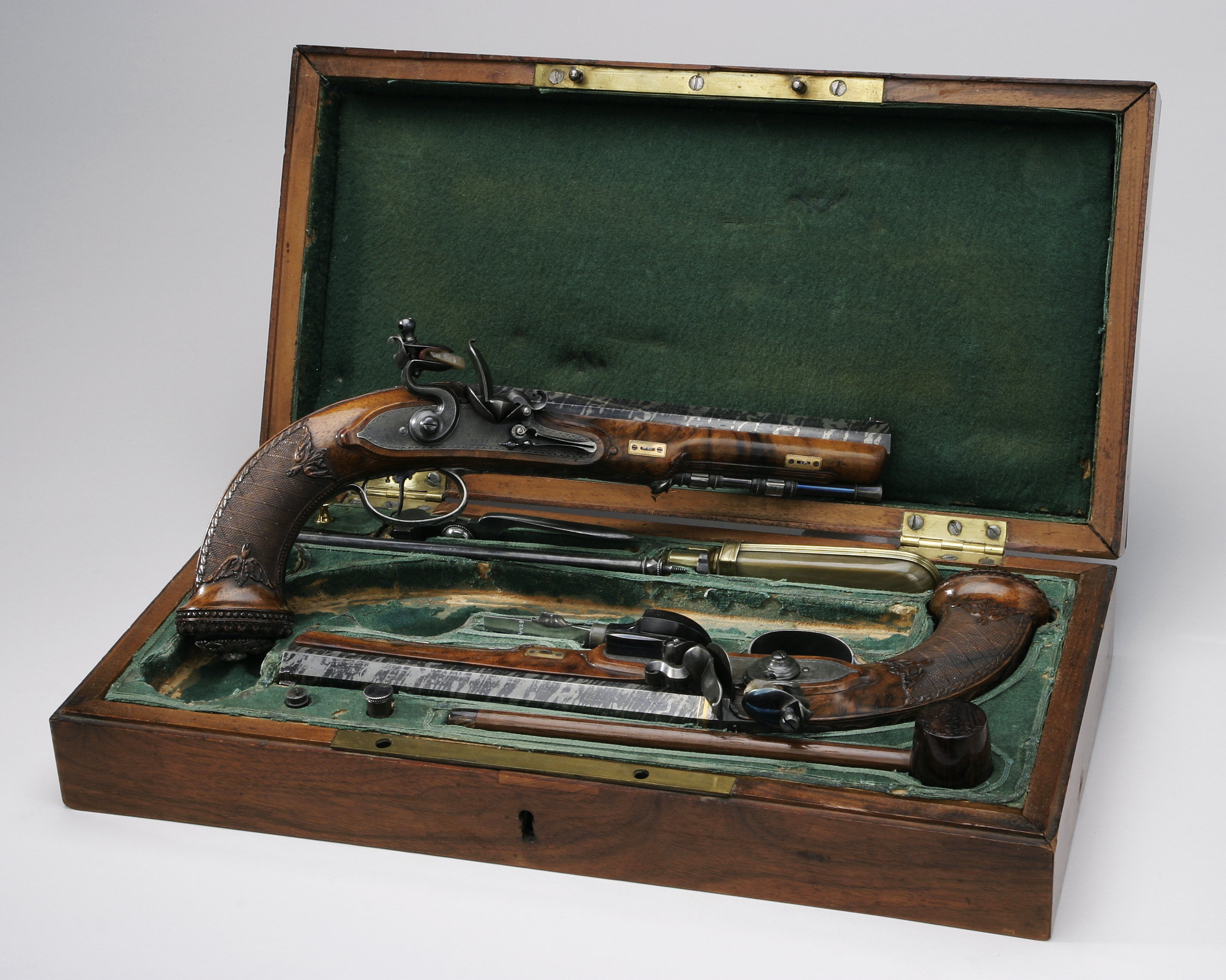 Rektangulärt pistoletui av valnöt. På locket en oval mässingsskylt, därpå graverat: "Francois Ulrich // a Berne". Två gångjärn och lås av mässing, två låstenar av stål. Locket invändigt klätt med grönt kläde. I underdelen en lös insats av ask(?), på undersidan skrivet med bläck:"Dessa pistoler äro en gåva af // Konung Carl XIV Johan till // Generalmajoren Carl Johan Hederstierna". Översidan klädd med delvis mycket slitet, grönt kläde med urtag för pistolerna, laddklubba, två kratsar, mejsel, läskstång, krutflaska och kultång samt i övre v. hörnet ett rektangulärt och ett runt fack, båda med lock klädda med klädet och med iskruvade knoppar av mässing, det runda locket löst, det fyrkantiga endast fäst med ett litet stycke kantband. Fack och kanter kantade med kantband av grönt silke, bortslitet på flera ställen och fransigt på andra.