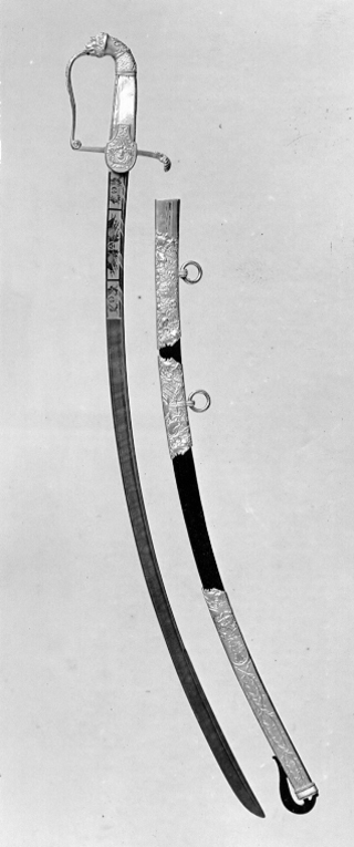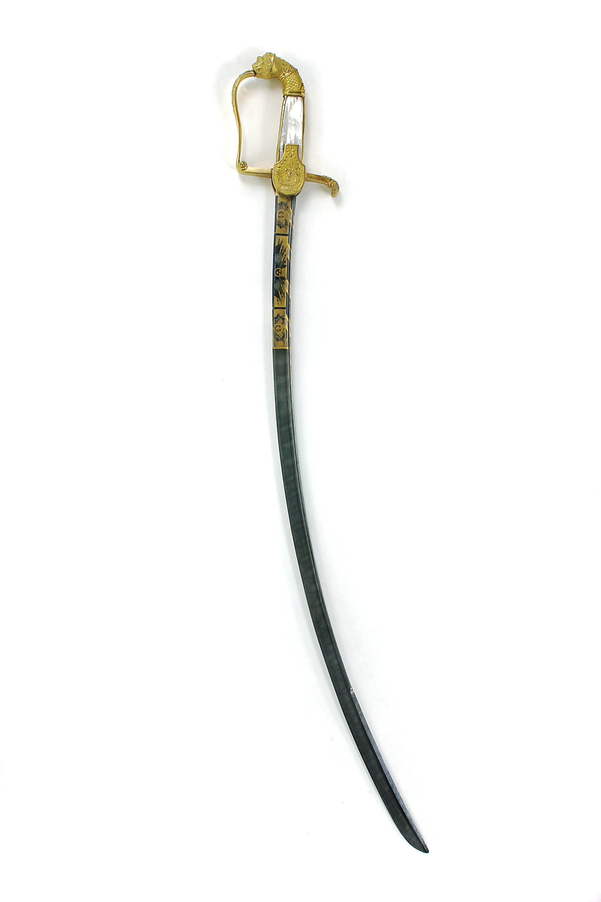 Fäste av förgylld, rikt ciselerad mässing. Kappa i form av framåtböjt lejonhuvud, på slät hals prydd med palmett och därnedanför fjäll. Handbygel intappad i lejonets mun, överdelen utsvängd förenar sig i rak vinkel med främre parerstången. vid mötespunkten är handbygeln inrullad. På handbygelns utsida olika slags blankvapen och klubba korsade med fascas och trumpet i relief mot punsad botten. Insidan slät. Parerstängerna släta med rektangulärt genomsnitt. Bakre parerstången avslutas med nedåtböjd mussla med palmett över. Styrskena nedre bred nedåt rundad upptill avsmalnande rakt avskuren med ciselerad dekor i relief mot punsad botten i form av palmetter, blad och skäggigt hjälmklätt ansikte. Lika på in- och utsidan. Kavel med rektangulärt genomsnitt och pärlemorplattor på in- och utsidan, fram och bak förgylld mässing med lager och ekkvist i låg relief. Klinga damaskerad böjd eneggad utom spetspartiet som har låg 220 mm jelman. Ryggen rundad, förstärkt. Intill basen ett 195 mm långt parti med etsad förgylld och blånerad ornering. Tre rektangulära fält. På utsidan närmast basen förgyllt prickigt parti med rund sköld med Norges lejon, krönt av kunglig krona, inramat av blånerade lager och palmkvistar. Därovanför blånerad fanborg mot förgylld botten. Framför fanorna kanon och trumma, kanonkulor och rund krönt sköld med tre kronor. Därovanför förgyllt prickigt fält med Göta lejon ( folkungavapnet) i rund krönt sköld omgiven av lager och palmkvistar. Ryggen med guldband i spiral mot blånad grund. På insidan fältet närmast klingan blixtknippe mot stålgrund, delvis förgyllt och i förgylld ram. I fanborgens sköld Karl Johans initialer "CJ" krönt av kronprinskrona. I nedersta fältet två korsade svärd genom lagerkrans, palmkvistar och lagerkvistar i förgylld ram.