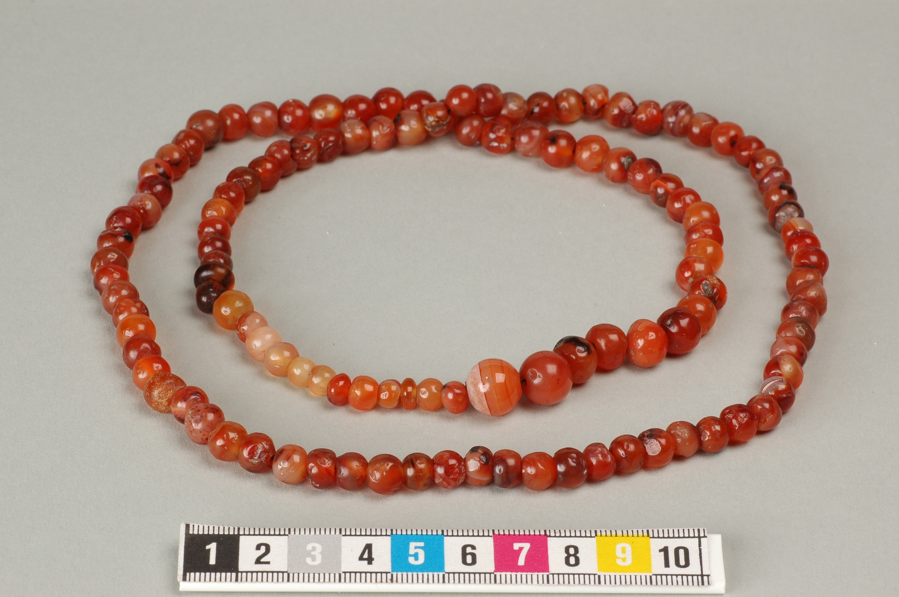 118 st. pärlor av karneol dessutom 2 st. utan genomborrat hål
