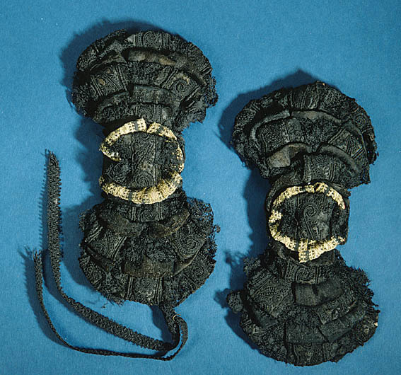 På en platta av rektangulär form med insvängda långsidor av 13,5 cm längd, som är klädd med lärft och svart taft sitter små öglor av släta svarta atlasband och smala, ca 3 cm breda, broderade atlasband med en ca 2 cm bred svart knypplad uddspets som vikts ut åt kortsidorna. I mitten har man lagt metalltrådsbandet i 4 små öglor, som en liten ros, i vars mitt ett svart broderat band ligger.