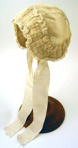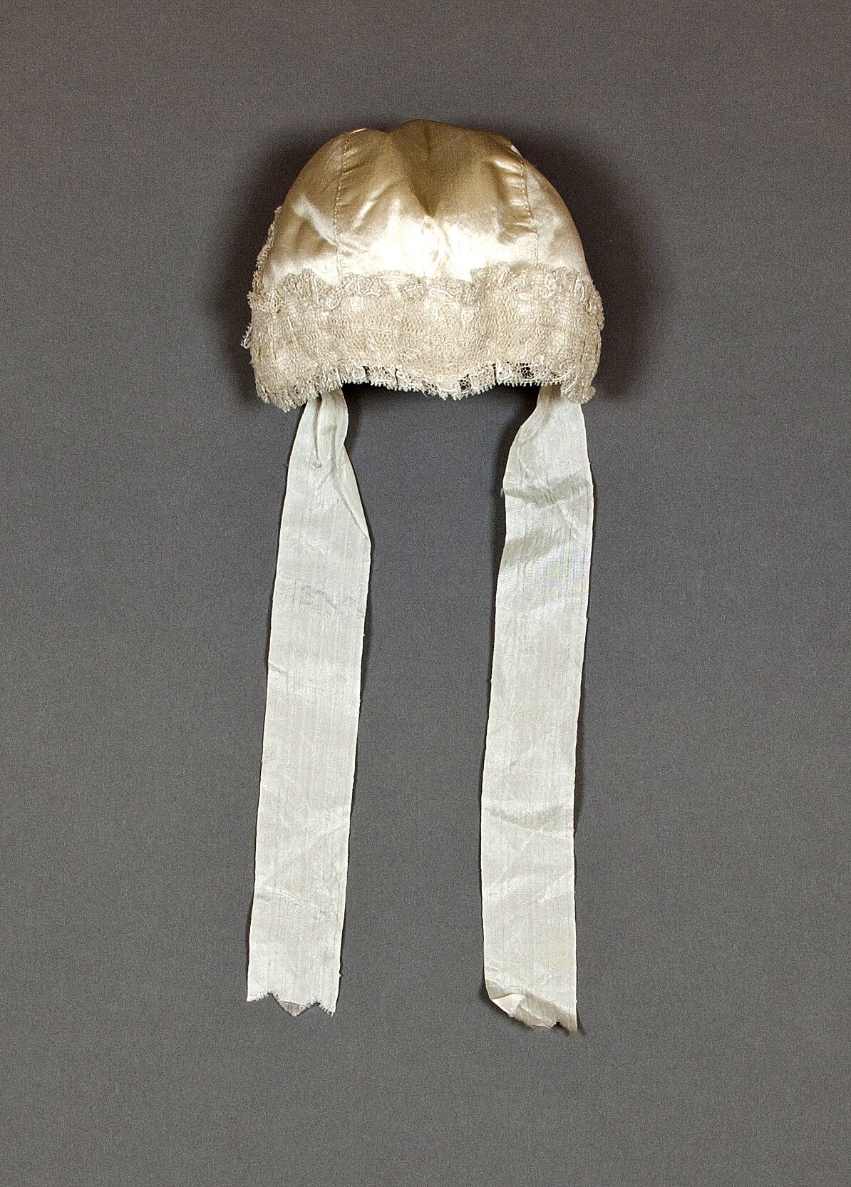 Naturvit mössa av atlassiden, sydd i ett mittstycke och två sidostycken. För flicka. Kantad med 41 mm bred veckad spets, blonde. Naturvitt foder av sidentaft, sytt i 3 stycken. Hakband av siden, bredd: 33 mm, längd: 262 mm, klippta i 3 flikar nedtill.