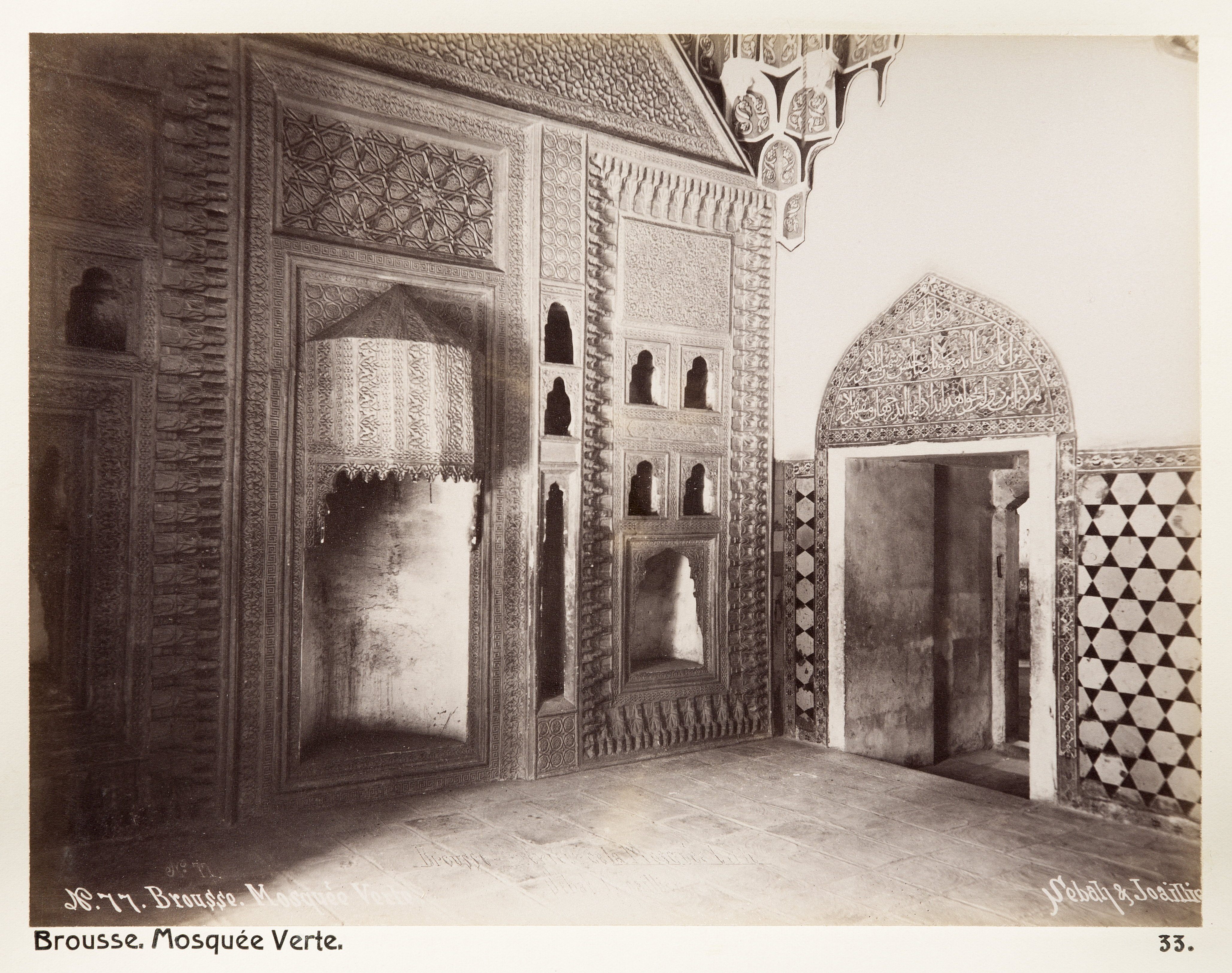 Gröna moskén i Bursa. Text på originalet: "Brousse. Mosquée Verte." Fotografierna LXVI:O.01.-54. kommer från resan till Turkiet och Mindre Asien som Wilhelmina och Walther von Hallwyl gjorde den 27 april - 20 juni 1901. De lämnade Sverige den 5 november 1900 för Egypten, där de stannade till den 28 mars 1901, då de fortsatte till Palestina. Den 27 april fortsatte de till Turkiet och Mindre Asien. Med på resan var Wilhelminas sällskapsdam, fröken Ida Uhse. I Konstantinopel (Istanbul) anslöt sig Wilhelminas mor Johanna Kempe och kusindottern Elma Hök. Fotografierna är inköpta av Wilhelmina i Konstantinopel (Istanbul) och Brussa. Alla uppgifter kommer från Ida Uhses reseanteckningar.