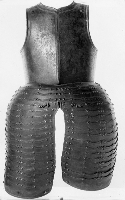 Lång tassett/taska med knäbuckla bestående av 23 delar. De 19 lamellerna ovanför knäbucklan har en profilerad vågformig och spetsig överkant som markeras av dekorativa, förgyllda nitar samt tre längsgående mejslade linjer. De två lamellerna nedanför knäbucklan med motsvarande dekor i nederkant. Ytter och innerkanter med inåt omvikt, rundsmidd kant med mejslad repdekor. Rörlig knäled bestående av knäbuckla samt fyra ovanförliggande och tre nedanför liggande lameller, nitade vid varandra i ytter- och innerkant. Knäbucklans vinge med inåt omvikt, rundsmidd kant med mejslad repdekor. Innanför denna tätt sittande förgyllda dekorativa nitar. Därefter tre mejslade parallella linjer. Mitt på musslan en ring av 12 förgyllda nitar, varav två har fäst knäledsremmen. Från cirkeln till knäbucklans mitt en 130 mm lång, i ändarna avsmalnande, driven vulst med mejslad repdekor. Mitt fram på knäbucklan en lodrätt vulst med mejslad repdekor i ett nedsänkt mandelformat parti. Nedersta lamellen uppdragen i en spets mitt fram, ovanför denna en sju-bladiga, förgylld, driven blomma med huggna strålar. Knäledens översta lamell är något större och dekorerad med motsvarande blomma. Knäledsdelen är avtagbar. Dess översta lamell är försedd med hål som på lårdelens nedersta lamell motsvaras av nitar, varav den inre är vridbar. Lårdelens nedersta lamell har en inåt omvikt, rundsmidd nederkant med mejslad repdekor. Den översta lamellen är försedd med två hål som tappas in bukskenans nitar och låses med hake. Haken har varit försedd med en nu saknad skruv för att säkra att den inte glider ur låsläge. Lårdelens lameller är i ytterkant nitade direkt i varandra i avlånga hål, för ökad rörlighet. På insidan, mitt fram sitter lamellerna delvis samman på ursprungligt läder och längs innerkanten är numera lamellerna också nitade direkt i varandra. Lamellernas innerkanter har ursprungligen nitats i läder för att öka rörligheten. I ytterkanten nitrad för läder som ett dekorativt band kan fästas i. Lamellernas nederkant är vågformig av materialbesparande skäl. Dekoren överensstämmer med övriga rustningsdelar