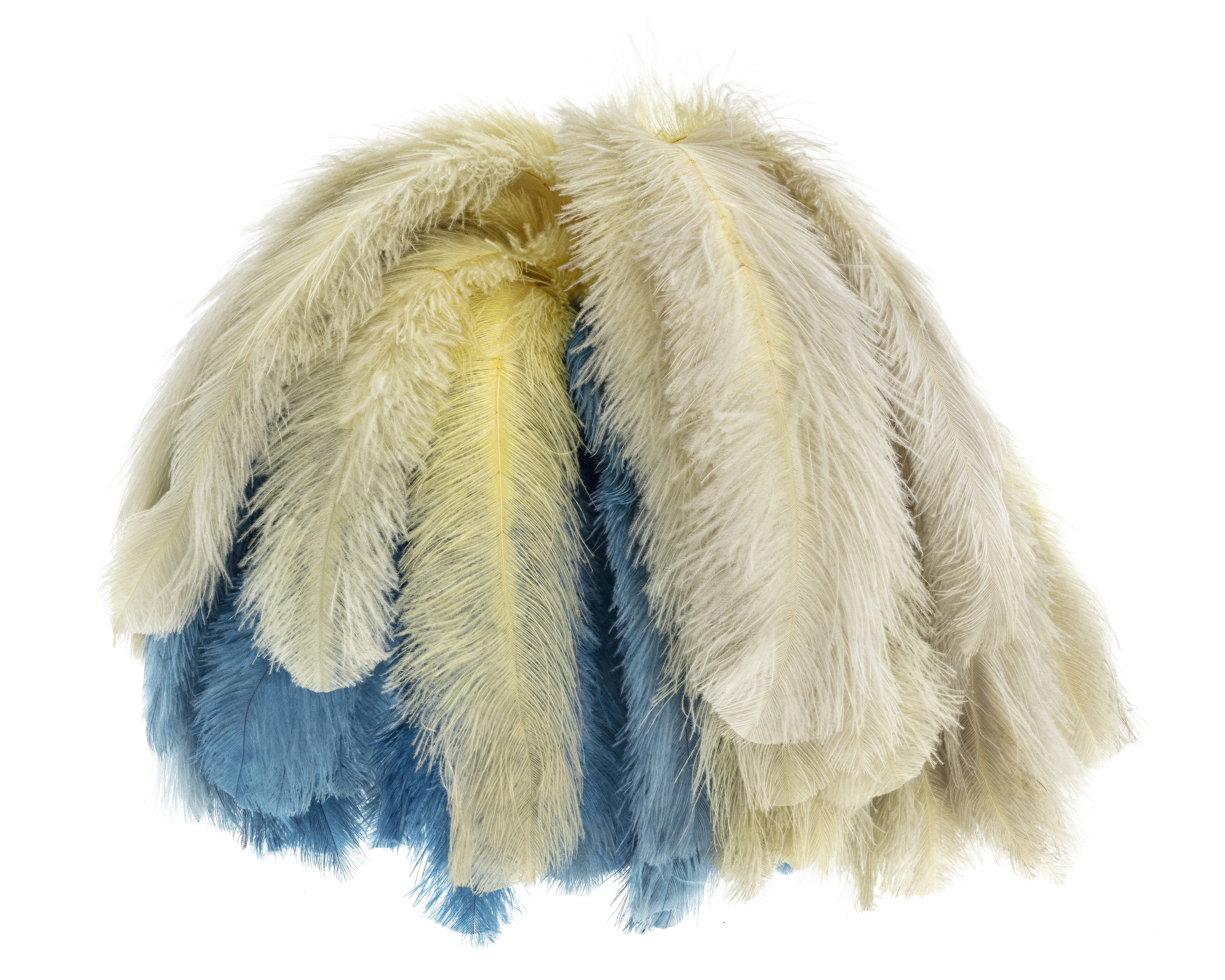 Plym av gula och blåa fjädrar i en läderholk med en mässingstrådögla.