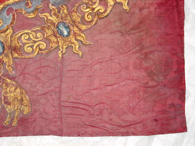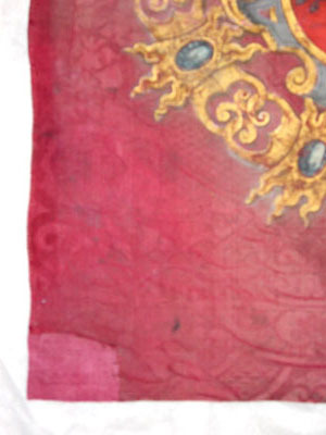 Fanduk av karminröd sidendamast i två vertikala våder, 260 och 540 mm breda, omvikta, kastade kanter. På båda sidor målat det polska riksvapnet krönt av en kunglig krona, en vapensköld lagd på en rullverkskartusch i olika grå nyanser med guldfärgade kanter, skölden omgiven av Gyllene Skinnets ordenskedja och klenod. Skölden är kvadrerad med guldkanter, alla fälten röda, i fält 1 och fyra i silver (nu grått) Polen (silverörn med guldbeväring, krönt med krona av guld), i fält 2 och 3 Litauen (ryttare i rustning av guld med lyft svärd med silverklinga och guldfäste, på v arm en röd sköld med ett två gånger korsat kors av guld. Hästen av silver med seldon av guld, hästtäcke målat med grå färg. Hjärtsköld likaså kvadrerad med guldkanter, fälten blå, i fält 1 och 4 tre kronor av guld (2,1), i fält 2 och 3 tre grå strömmar och däröver ett krönt lejon av guld. Innersköld Vasa. två gånger styckat av blått, silver och rött och däröver en Vase i guld.
