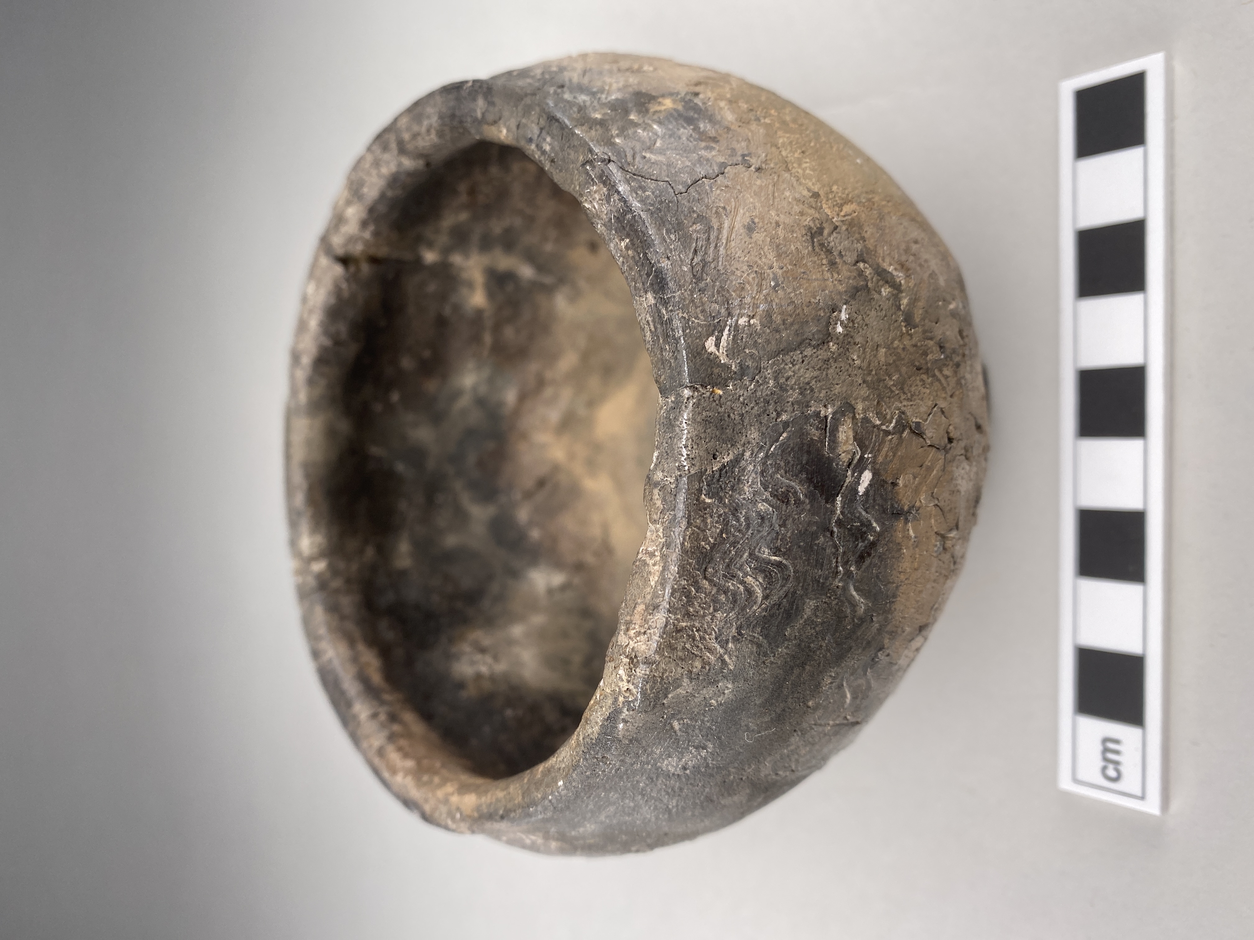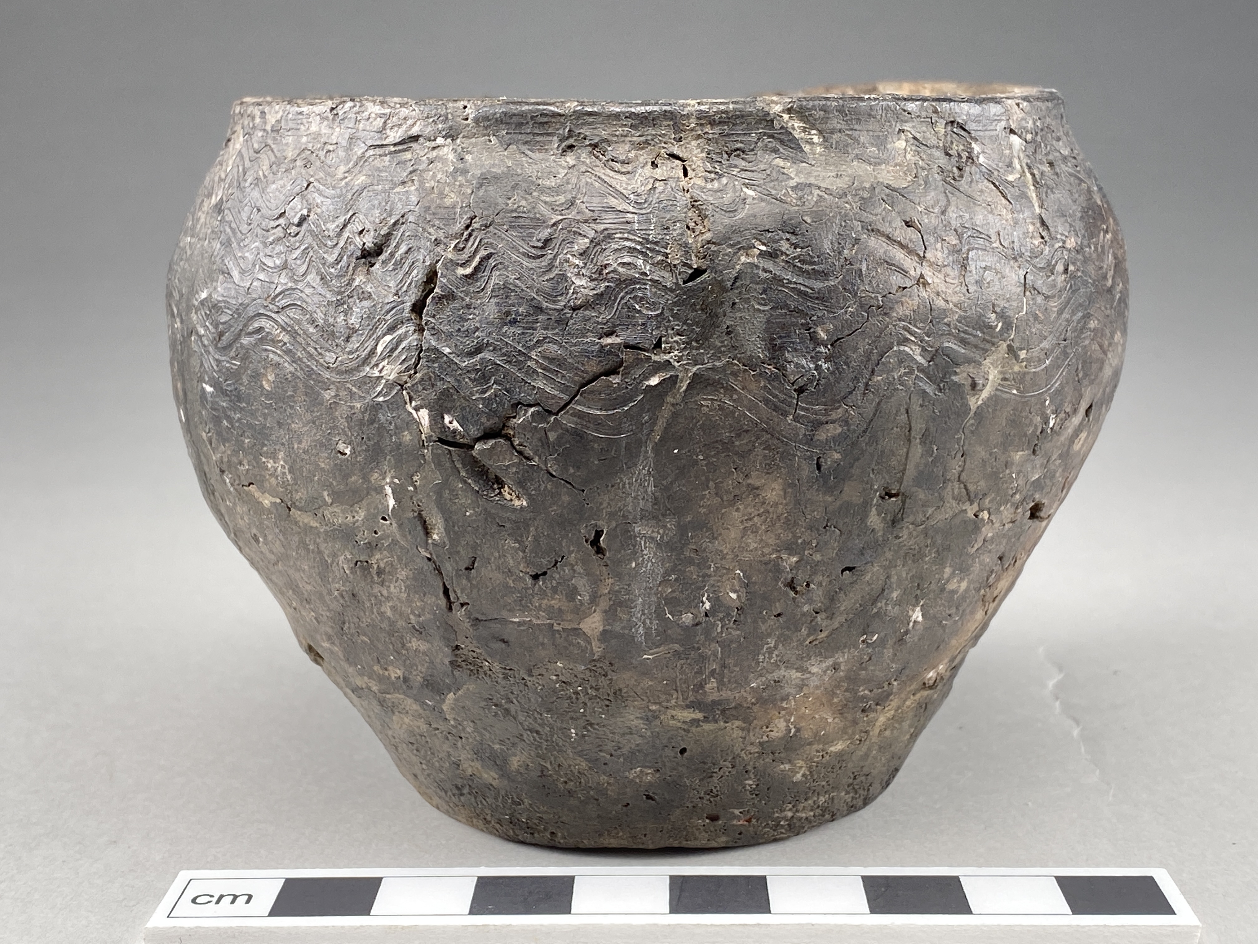 Litet rundbukigt kärl med inåtböjd mynning och plan mynningskant. Våglinjedekor. AII?