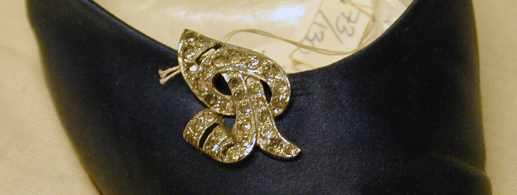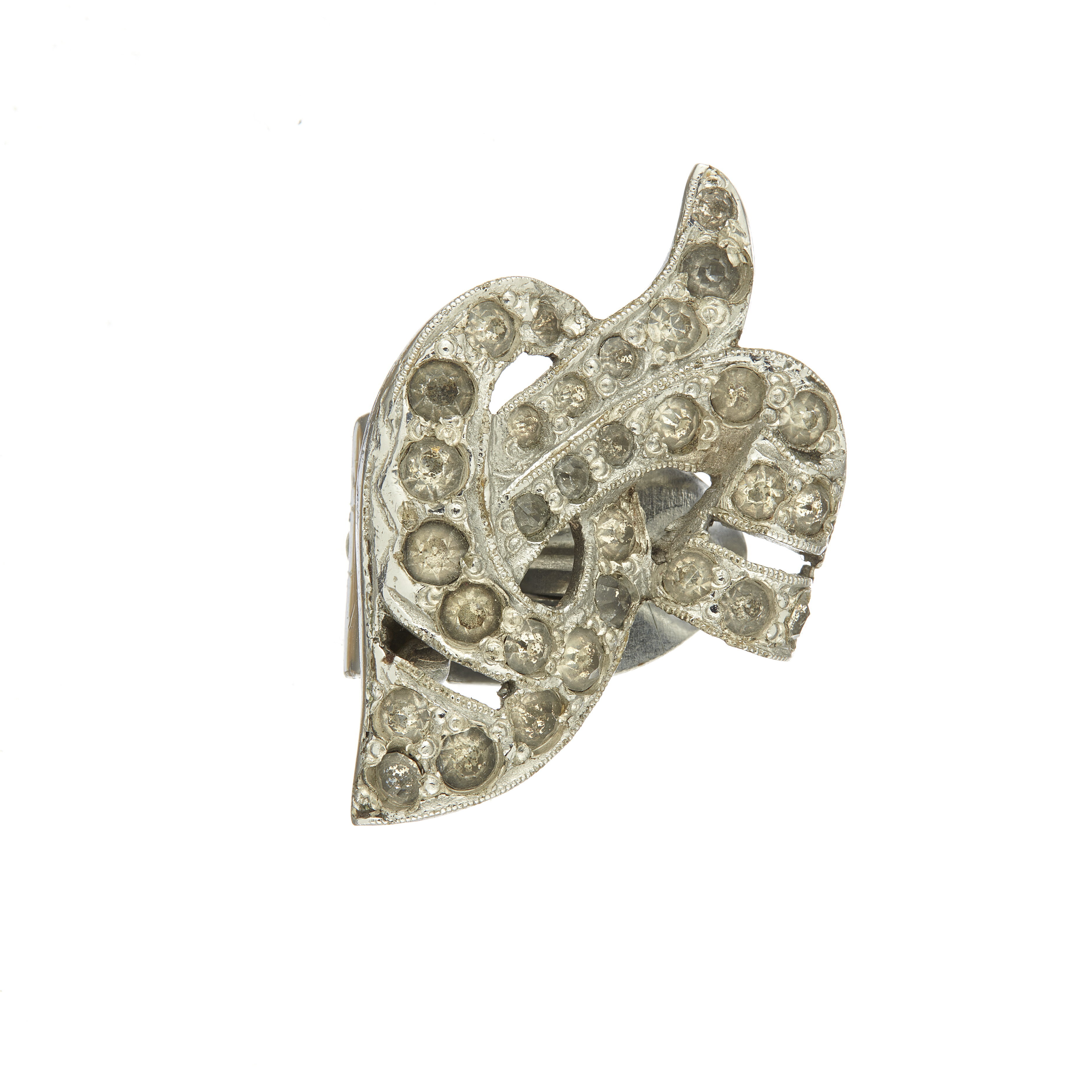 Skosmycke av vitmetall med infattade glasbitar. Fästes i skon med en clip.