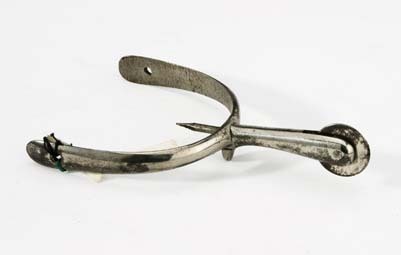 Sporre av förnicklat stål. U-formade skänklar, vidgade med hål i ändarna. Baktill på insidan mitt för halsen 21 mm lång spets, avsedd att stickas in i klacken. Rak rund hals 44 mm lång med trissa (rund slät klinga).