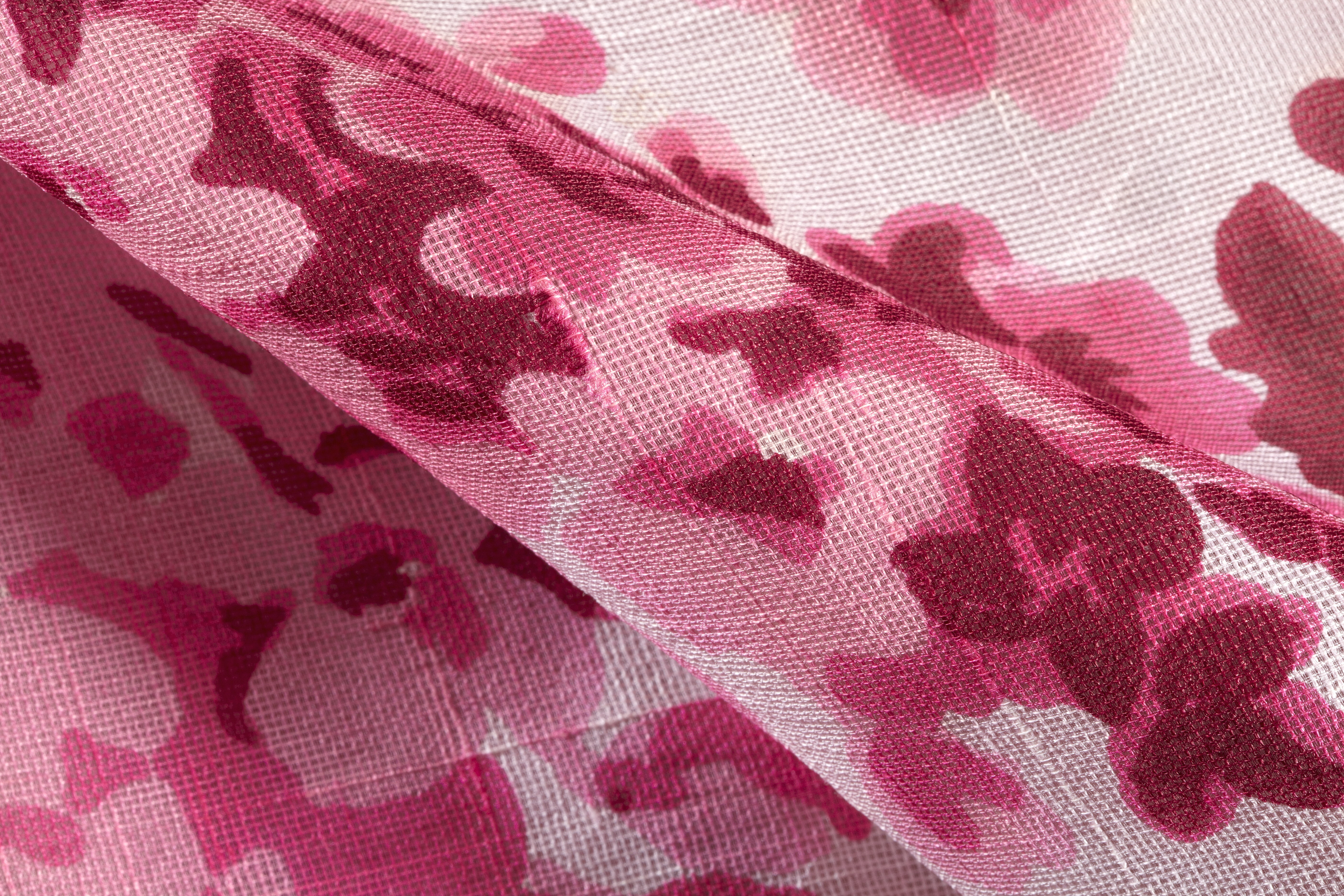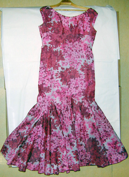 Hellång figursydd aftonklänning av helsiden med blommönster i rosa, cerise, mörk vinröd ochmörkrött. Ringad, utan ärm. Bågformigt avskuren i knähöjd med åtta flikar. Rundskuren nedtill. Ringningen rund fram och V-formad bak. Helt framstycke och delad rygg. En tvärgående avskärning under bysten mellan sidsömmarna. Under ärmarna två infällningar. Framstyckena lagda omlott i vinkel mitt fram och ej nerpressade. Figurveck överaxelsömmarna, l: 25 mm. Bak en tvärgående avskärning i midjan. På varje våd från livsömmenuppåt och nedåt ett figurveck, uppåt, längd 140 mm och nedåt längd 180 mm. Isidsömmen, vidavskärningen, ett skärp, b: 25 mm, knäppt i mitten med en välvd tygklädd knapp, d: 17 mm. Blixtlås i ryggsömmen, l: 375 mm. Hake och hyska upptill. Våderna nedtill bågformattillskurna. Vådbredd, vänster fram 410 mm, vänster sida 1120 mm, vänster sida 1100 mm,vänster bak 104 mm, mitt bak 990 mm, höger sida 1020 mm, höger sida 1080 mm, höger fram1060 mm. Fållbredd ca 65 mm. Anmärkning:I vänster sidsöm vit sidenetikett med riksvapnet och texten: "H.M. DrottningensHovleverantör // Märthaskolan // FRANSKA AVDELNING // STOCKHOLM".Vid blixtlåset i midjan ett infällt tygstycke. Sidsömmarna och sömmen mitt bak utlagda, b:30-35 mm. Klänningen buren vid prinsessan Desireés och friherre Niclas Silfverschiölds bröllop i Stockholm 4 juni 1964.
