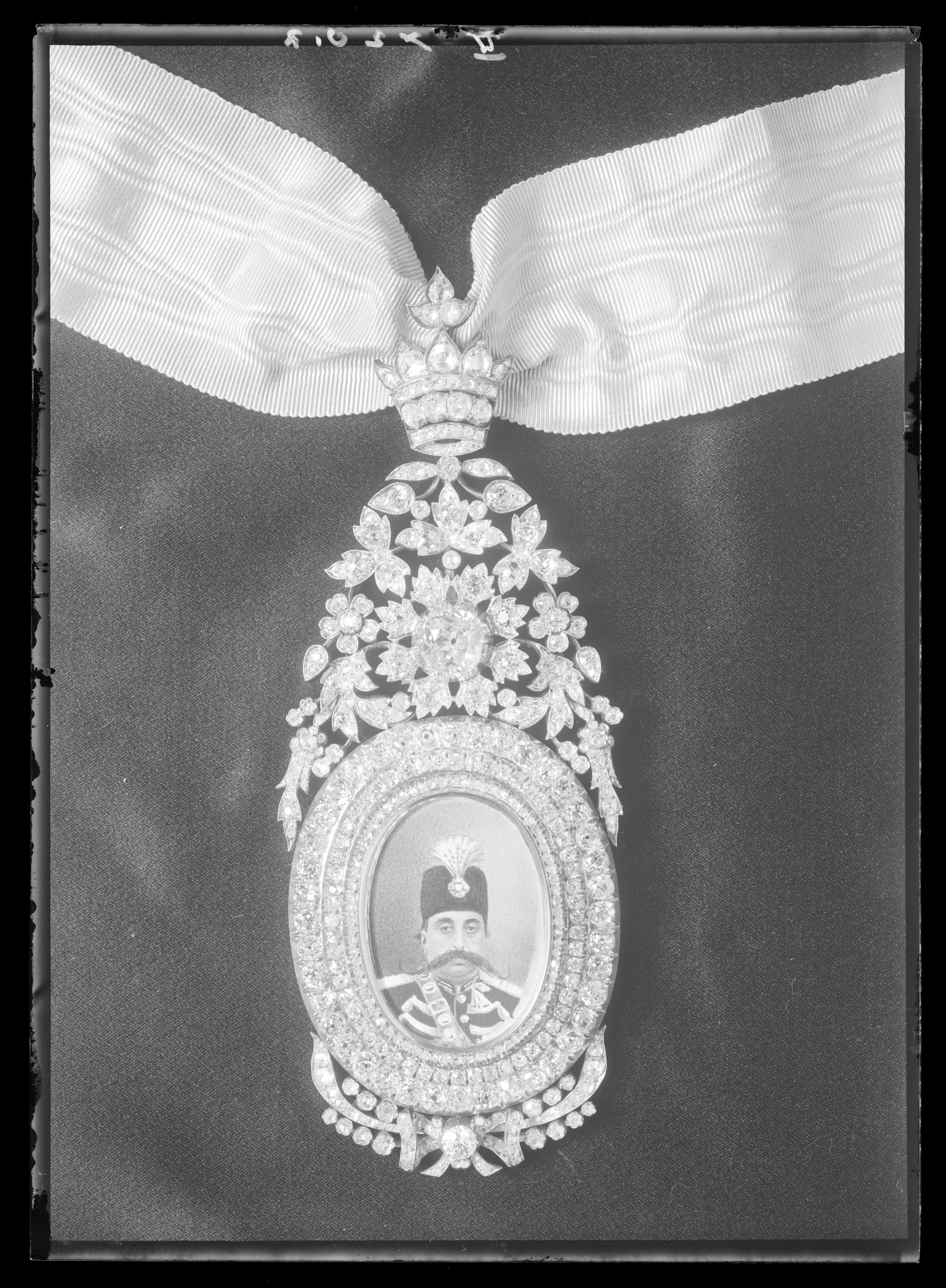 Ovalt miniatyrporträtt av shahen Nasr-ed-Din (1830-1898), bröstbild, fas, stora mustascher, svart-vit uniform, svart hatt med vit ägrett. Gouache på papper. Monterad under glas med fasad, fasetterad kant i fattning av på utsidan förgyllt silver. Rik, ursprungligen briljanterad fattning av på baksidan förgyllt silver, runt porträttet tre ringar, därnedanför rosett samt bladrankor. Ovanför porträttet blomsterrankor med fattning för en stor sten i mitten, krönt av den persiska kejsarkronan, fäst med scharner. På kronans baksida en nertill kluven bygel av förgyllt silver. Briljanterna enl. uppgift i inv. 1867 borttagna 1952 och sitter delvis på Vasaordens storkors, tilldelat överstekammarherre Nils Rudebeck (f. 1877), jfr nr 1831. Förlänad Oskar II 1889 gm f. ambassadören i Konstantinopel, Mirza Mohsin Khan, troligen med grönt band (jfr ink. Brev 3263:1962, Klietmann).