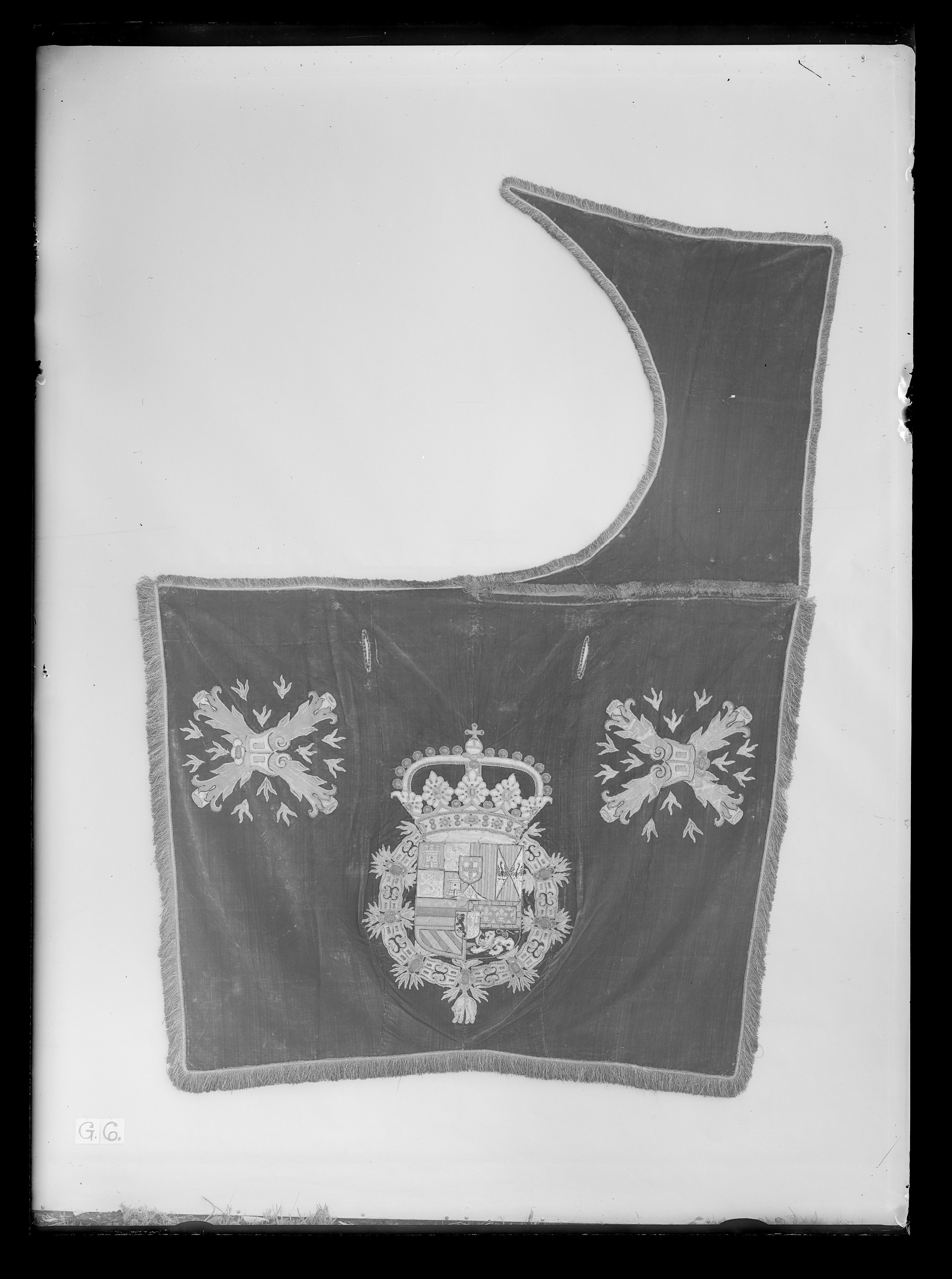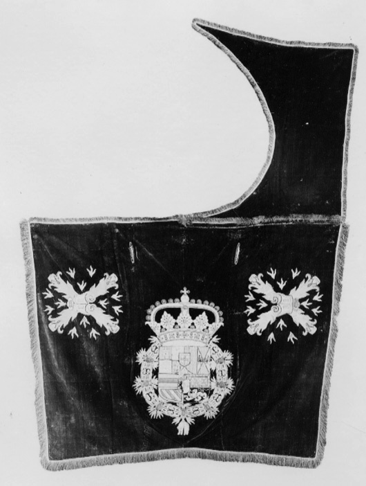 Bottentyg av röd sammet i kypert i fyra figursydda våder, de två yttre 530 mm breda till 250 mm från sammetens bakre kant där de är 440 mm. De två inre är 200 mm vid bakre kanten och 250 mm vid främre. 25 mm från sömmen mellan yttre och inre våderna och 100 mm från främre kanten 100 mm långa sprund, kantade med sammet. Bogstycket fäst på höger sida. 80 mm från bakre kanten det spanska vapnet 720 mmhögt och 500 mm som bredast. I de främre hörnen i kvistkors stål och flinta ca 350 mm högt och 400 mm brett, med eldtungor. Kungliga vapenskölden delad, på övre fältet Spaniens vapen med Portugal i hjärtsköld och Granada i mantelsnitt, på undre fältet Nederländernas vapen med Flandern och Tyrolen i kluven hjärtsköld. Övre fältet kluvet, högra delen kvadrerad med i fält 1 och 4 Kastililen, i 2 och 3 Leon, vänstra delen kluven i Aragonien och Sicilien. Undre fältet kvadrerat med i fält 1 Österrike, i 2 och 3 gamla och nya Burgund och i 4 Brabant. Kastilien: kastaler av gyllenduk på röd sidenbotten. Leon: ljusa lejon av silke i schattersöm på gyllenduk. Aragonien: röd sidenbotten med bjälkar av guldtråd i läggsöm. Sicilien: örnar av svart silke i schattersöm på gyllenduk. Portugal: röd sidenbård med guldkastaler, silversköld av gyllenduk med fem små sköldar av blått silke i plattsöm med bollar, två, en och två, av silvertråd. Granada: granat av ljust rosa silke i schattersöm och gröna blad på gyllenduk. Österrike: röd sidenbotten med bjälke av metalltråd i läggsöm. Burgund, gamla: bård av rött siden och silver i läggsöm, mittfält av blått siden med ranska liljor i plattsöm av guldtråd. Burgund, nya: bård av rött siden, balkat mittfält av blått siden och guldtråd i läggsöm. Brabant: gult lejon av gyllenduk på svart sidenbotten. Flandern: lejon av svart silke i schattersöm på gul gyllenduk. Tyrolen: örn av ljust rosa silke i schattersöm på gul gyllenduk. Vapnet krönes av en sluten krona, av applikationer av gul gyllenduk och pärlformer av silver och guldtråd och silke i blått, rött och rosa. Vapenskölden omges av gyllene skinnets orden av applikationer av gul gyllenduk som stål och blå gyllenduk i fyrpassblomma med stygn av blått silke och i mitten en ellipsform med läggsöm av silver, och eldgnistor broderade med lan av guld och silver. Kvistkorsets armar av röd sidenatlas och med kanonmynningar av gyllenduk och öppningar av silverlan. Flinta av gyllenduk med bård av guldsnoddar i läggsöm. Eldgnistor av guld och silverlan. Frans i två lager, det undre av rött silke, det övre av guld och silver med ca 6 mm stad. Längs schabrakets sidor och bakre kant 50 mm bred, längs framkanten och runt bogstycket 30 mm, silkefransen mellan framkant och bostycke i sömmen, guld och silverfransen saknas, den var fastsydd 15 mm från silkesfransen och hängande åt motsatt håll. Foder av linne i tuskaft. Fem lädertampar med mässingsringar längs framkanten. Gåva 1671 från Karl II av Spanien till Karl XI av Sverige.