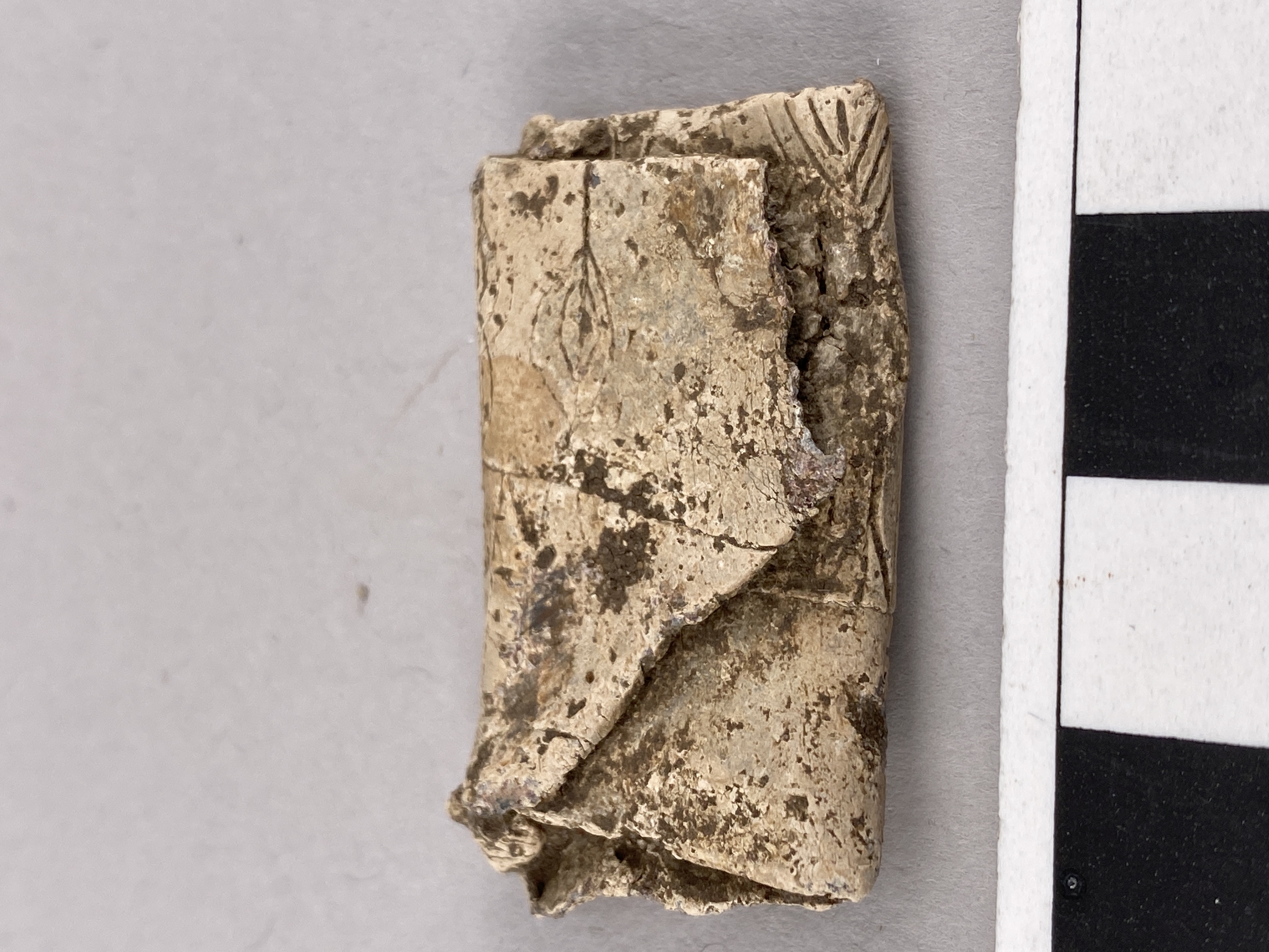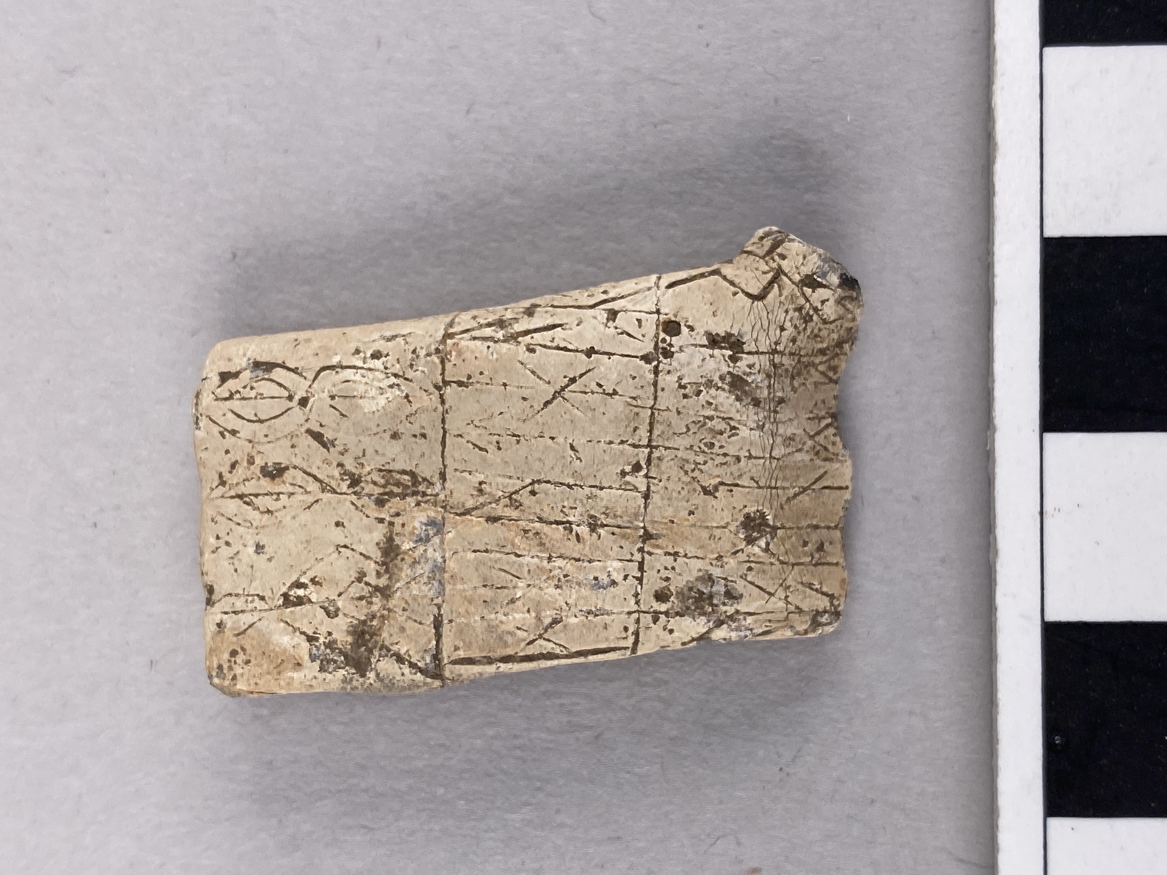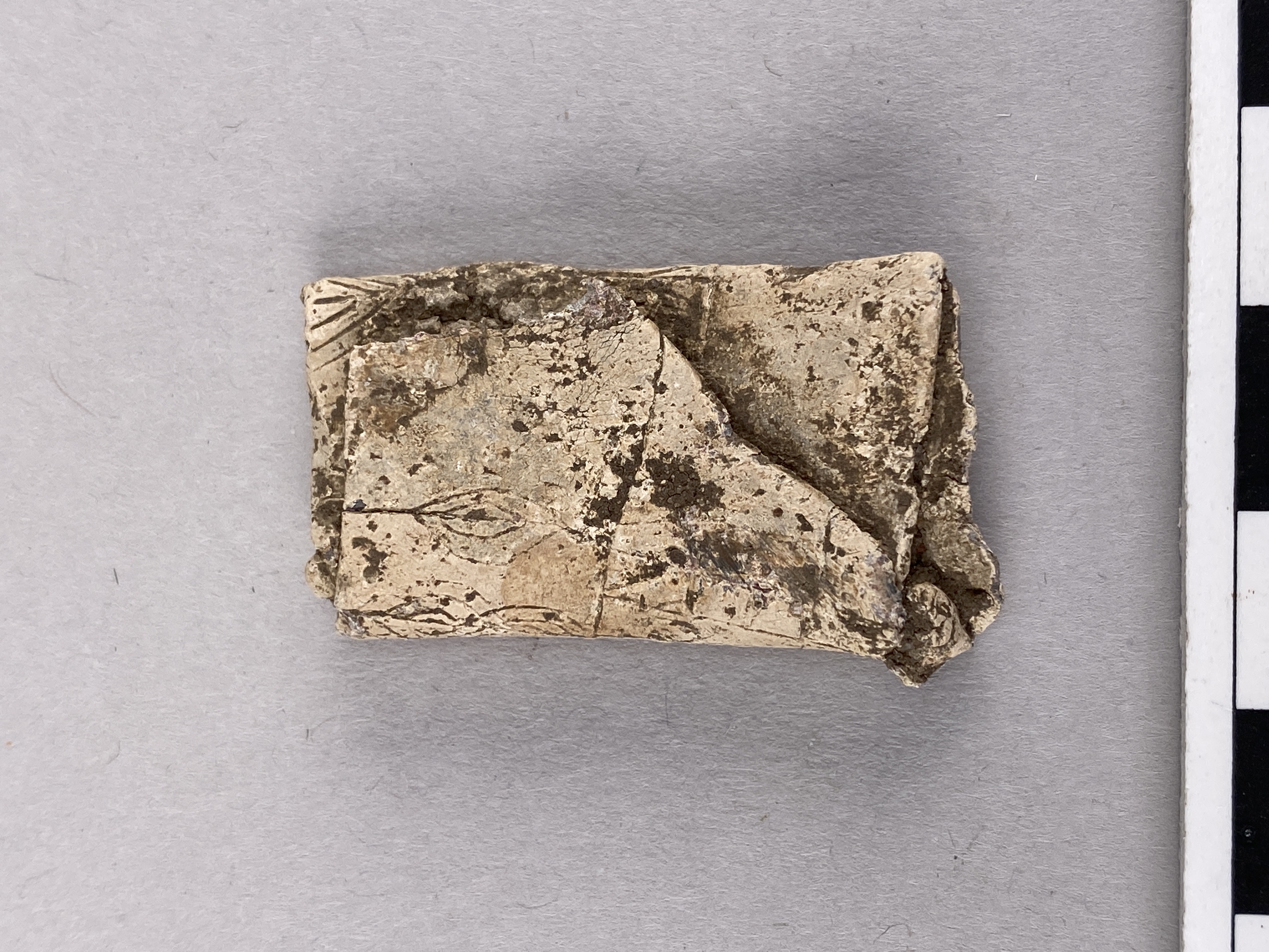 Rektangulärt runbleck av bly, som är vikt tre gånger. Föremålet är i sitt nuvarande skick 36 mm högt, 19–22 mm brett och 6 mm tjockt. På de synliga delarna av blecket finns tre rader med 9–14 mm höga runor. Ca 28 runtecken går att iaktta på de synliga delarna, men eftersom blecket är ihopvikt kan detta kan endast utgöra en tredjedel av inskriften. I den övre raden finns ett antal runor med märkliga former som sannolikt representerar någon form av lönnrunor. De övriga runorna tillhör den äldre 24-typiga runraden, men i en variant som bör tillhöra senurnordisk tid. I mittraden där de flesta av tecknen går att genomskåda kan man läsa …ʀhᴀimtᴀaʀᴀ(l)u, förutsatt att inskriften innehåller en mycket ovanlig variant av h-runan. Runföljden hᴀimtᴀ kan i så fall svara mot en form av verbet (runsvenska) hæmta ’hämta’, men då snarast på vikingatidsspråk. Detta talar för att inskriften har tillkommit under sen vendeltid eller tidig vikingatid (600-700-tal). I den tredje raden där en del av tecknen är svårare att identifiera förekommer bland annat de urnordiska varianterna av runorna s och e. / Beskrivet av Magnus Källström 2023-08-29.