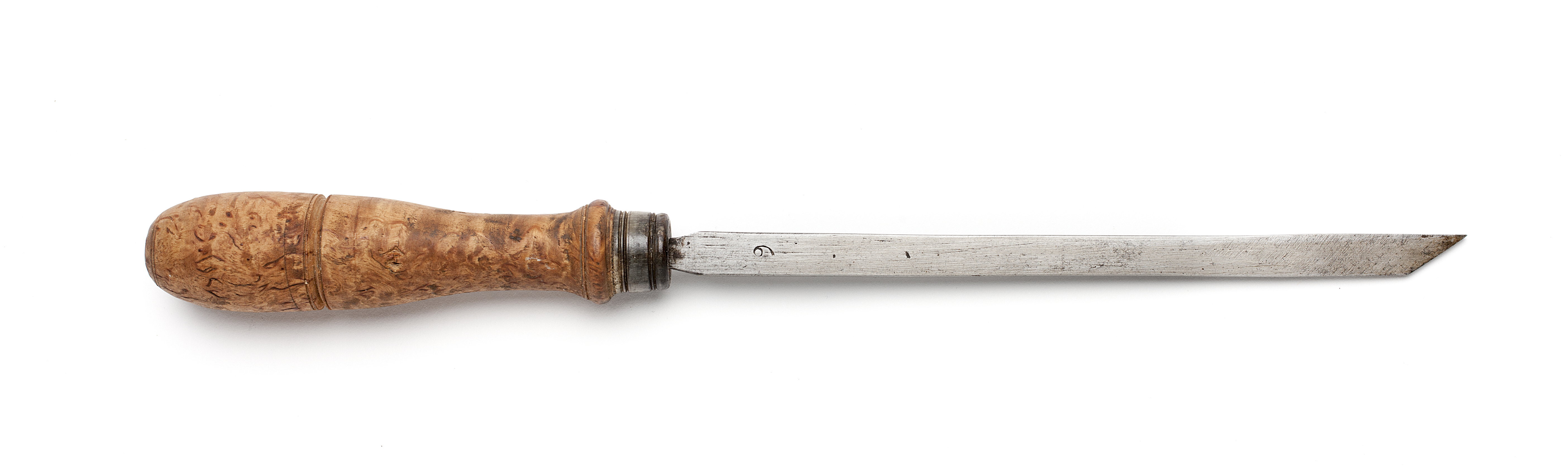 Klinga med rektangulär genomskärning. Stämplat på klingan: "6" (frakturstil). Svarvat skaft av masurbjörk, med en vulst nedtill. Hornring.