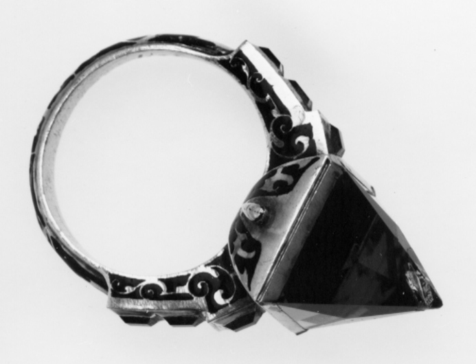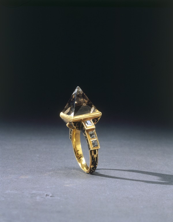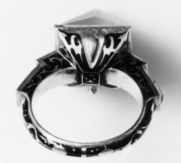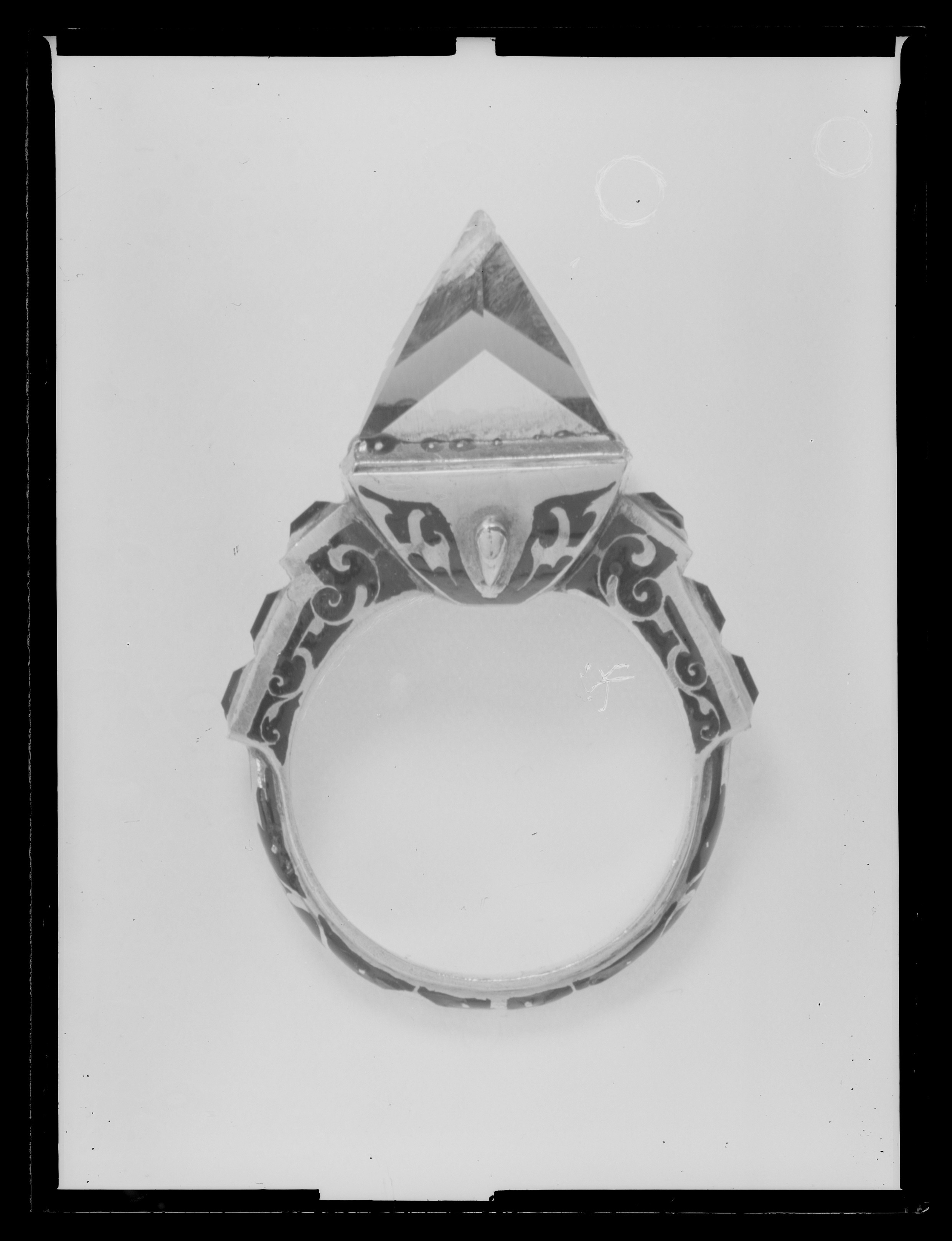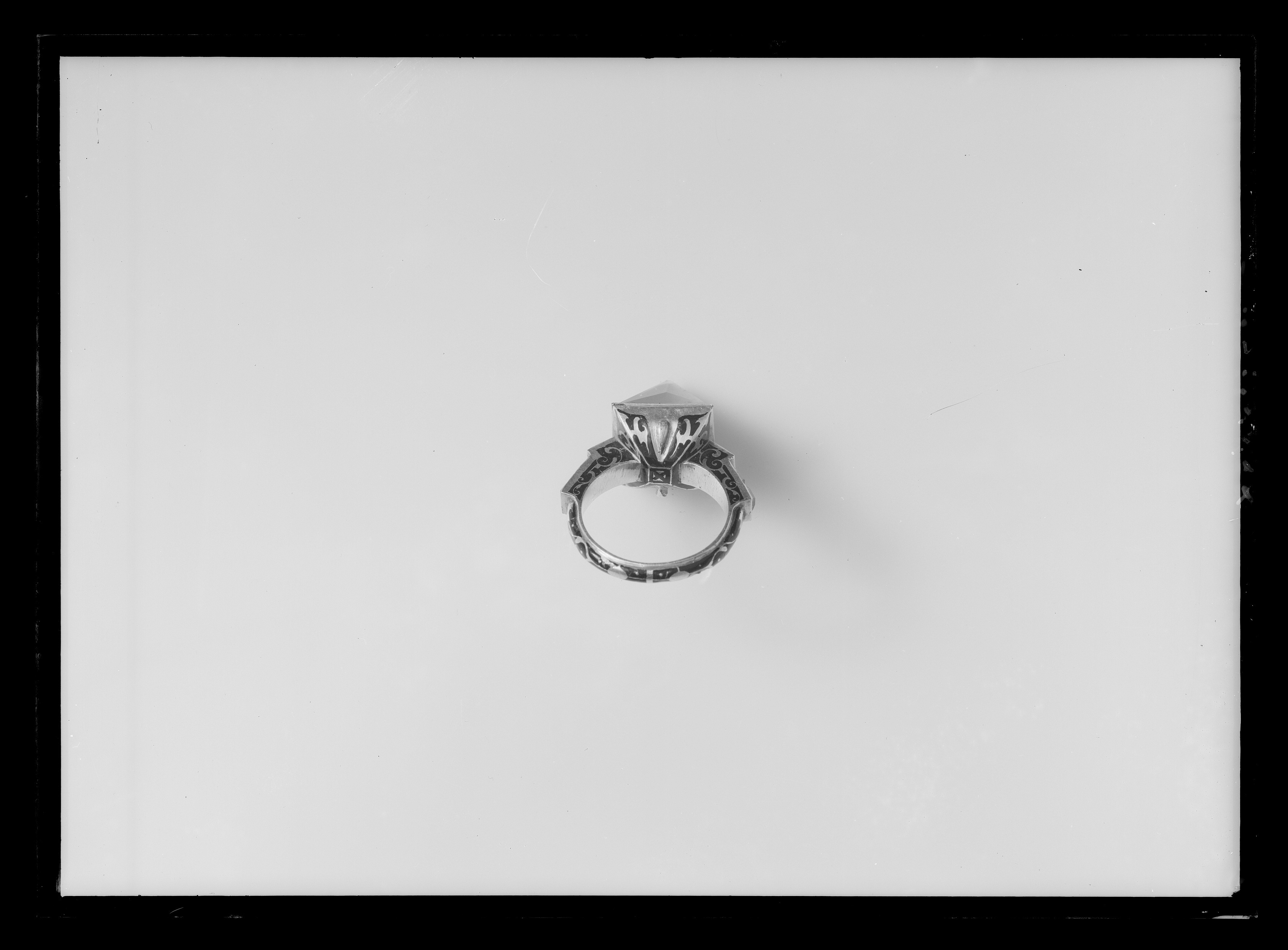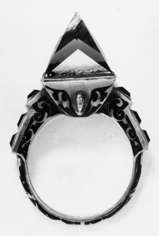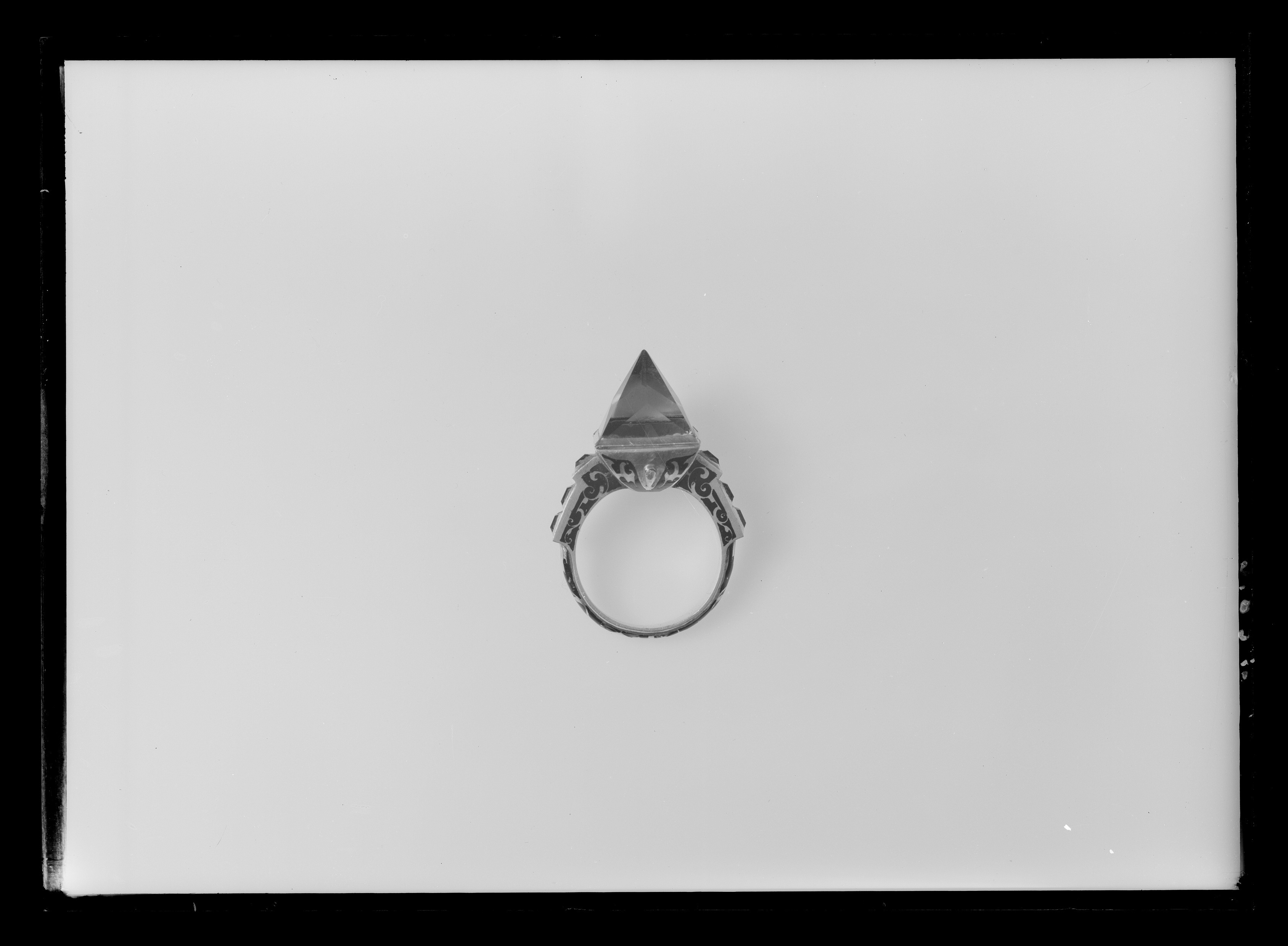 Ring av guld, nedre halvan med rundad utsida, täckt med beslagsornamentik av svart emalj och guld. Övre halvan med fyrkantig utsida, i mitten fattat en pyramidformig, ljus rökkvarts(?), slät fattning av guld, undersidan stympat pyramidformig med rundade sidor, groteskornamentik av svart emalj och guld. Stenen flankerad av sex taffelslipade bergkristaller i slät guldfattning, kanterna med groteskornamentik av svart emalj och guld. Karl IX:s kröning i Uppsala domkyrka var sista gången ring fanns med bland regalierna. Omnämns först på 1700-talets senare del som Karl IX:s. 1751: tilförende hört till Riksregalierna.