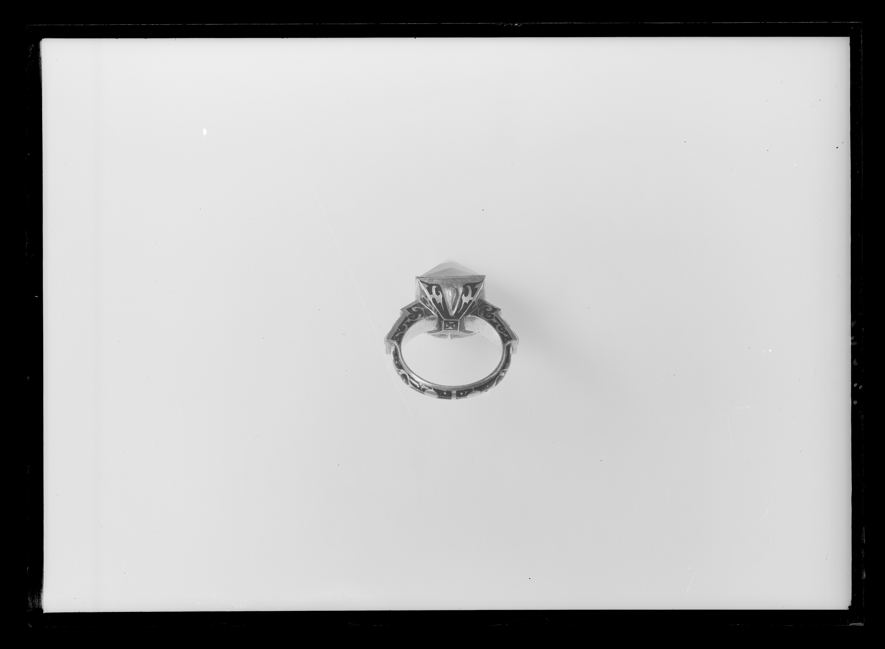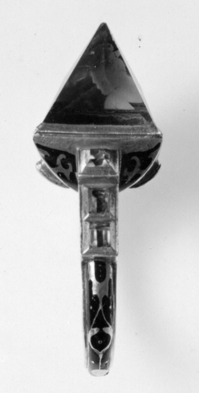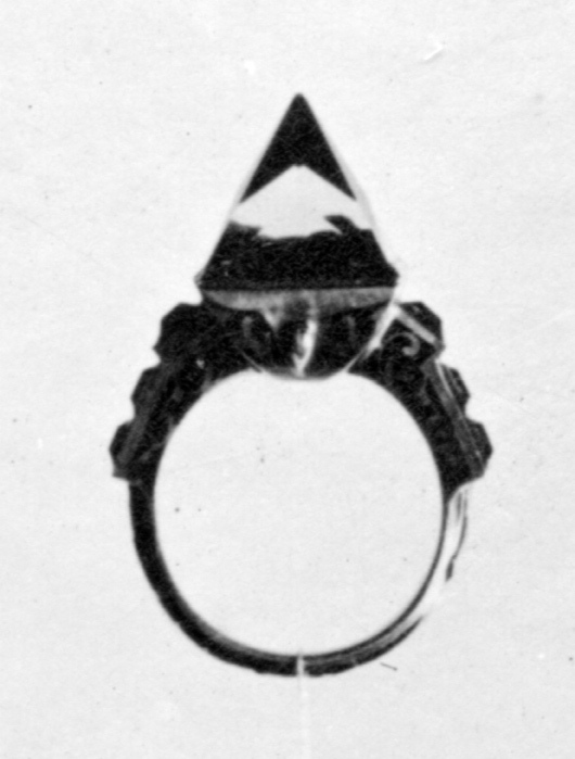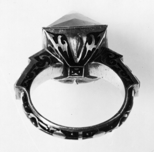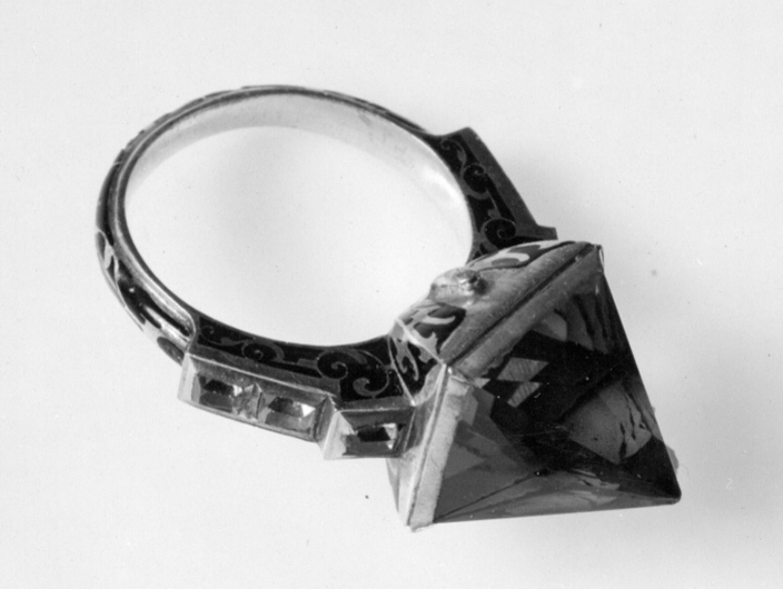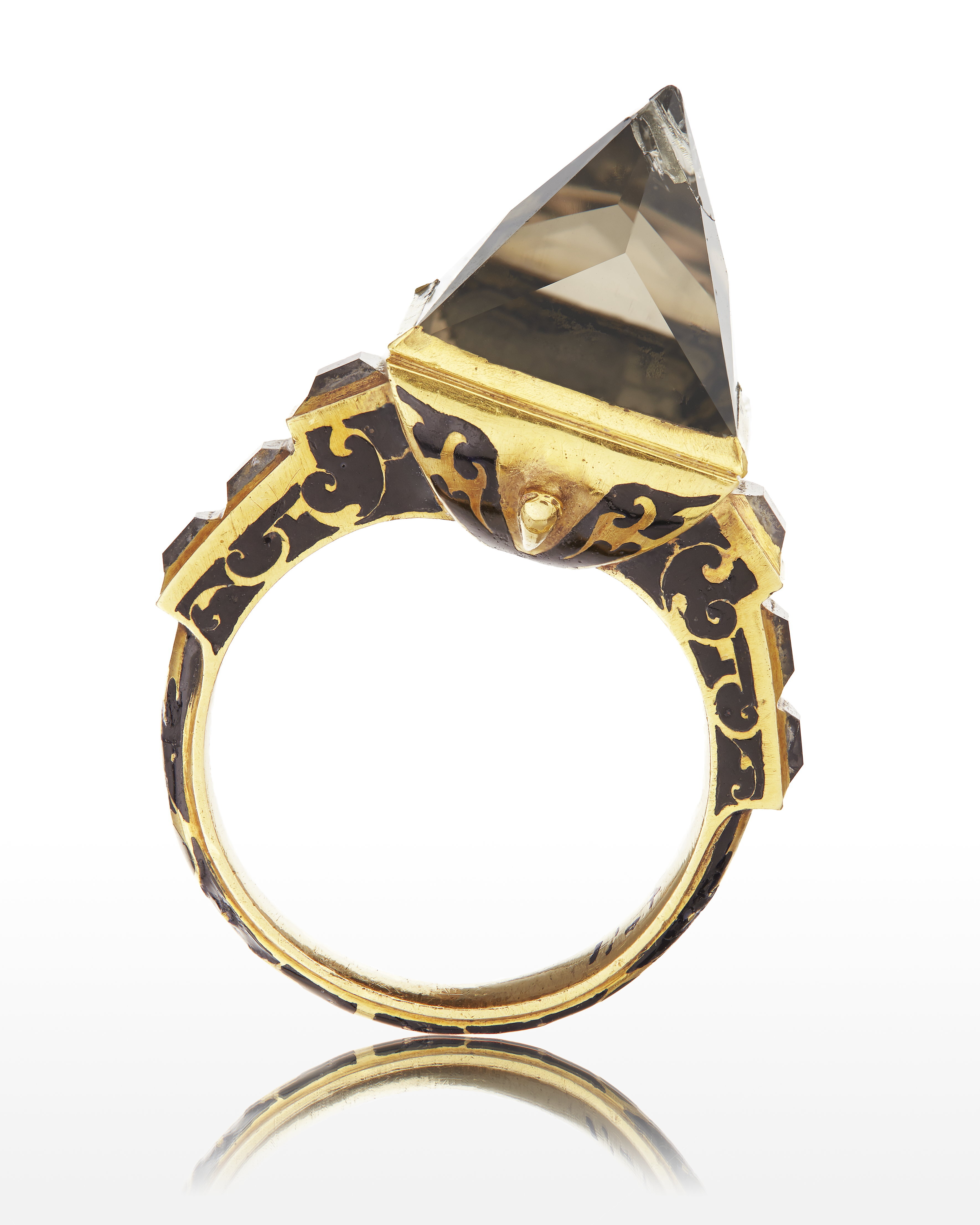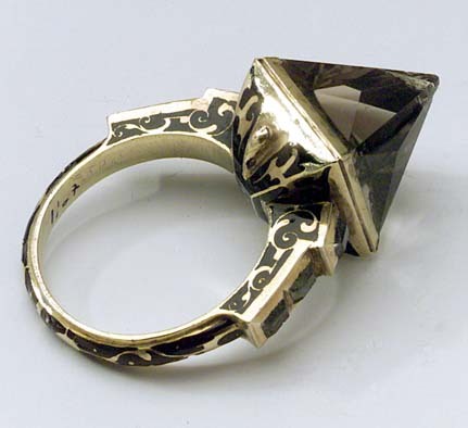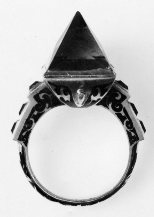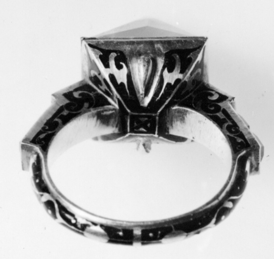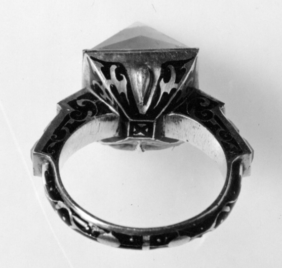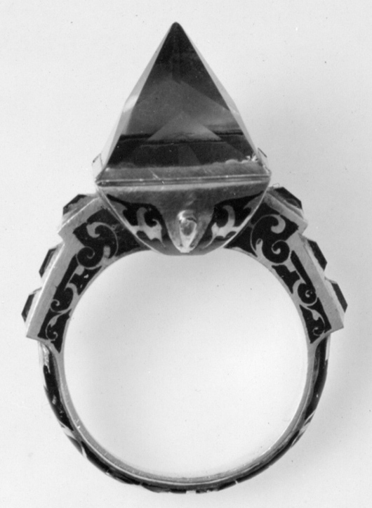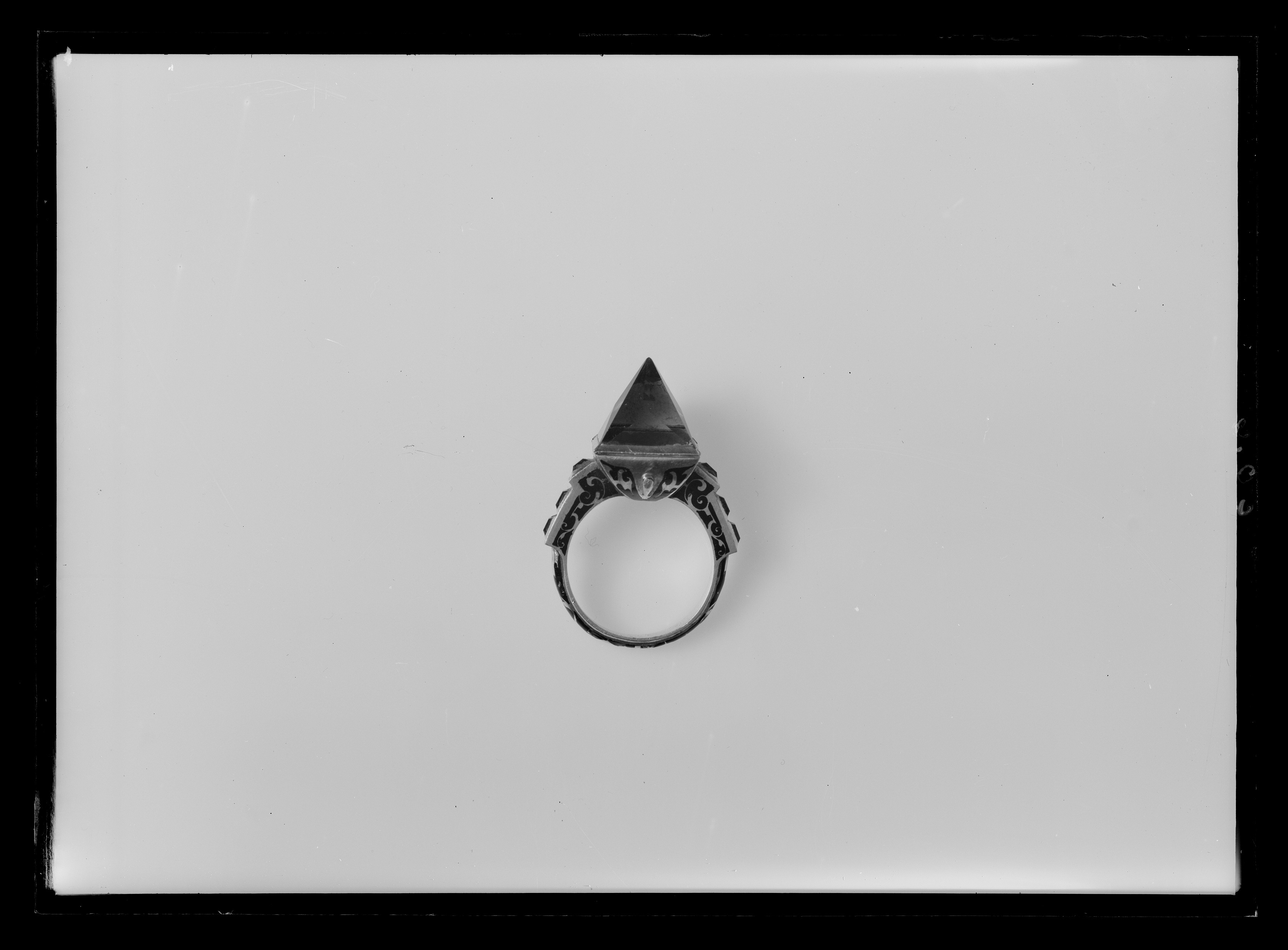 Ring av guld, nedre halvan med rundad utsida, täckt med beslagsornamentik av svart emalj och guld. Övre halvan med fyrkantig utsida, i mitten fattat en pyramidformig, ljus rökkvarts(?), slät fattning av guld, undersidan stympat pyramidformig med rundade sidor, groteskornamentik av svart emalj och guld. Stenen flankerad av sex taffelslipade bergkristaller i slät guldfattning, kanterna med groteskornamentik av svart emalj och guld. Karl IX:s kröning i Uppsala domkyrka var sista gången ring fanns med bland regalierna. Omnämns först på 1700-talets senare del som Karl IX:s. 1751: tilförende hört till Riksregalierna.