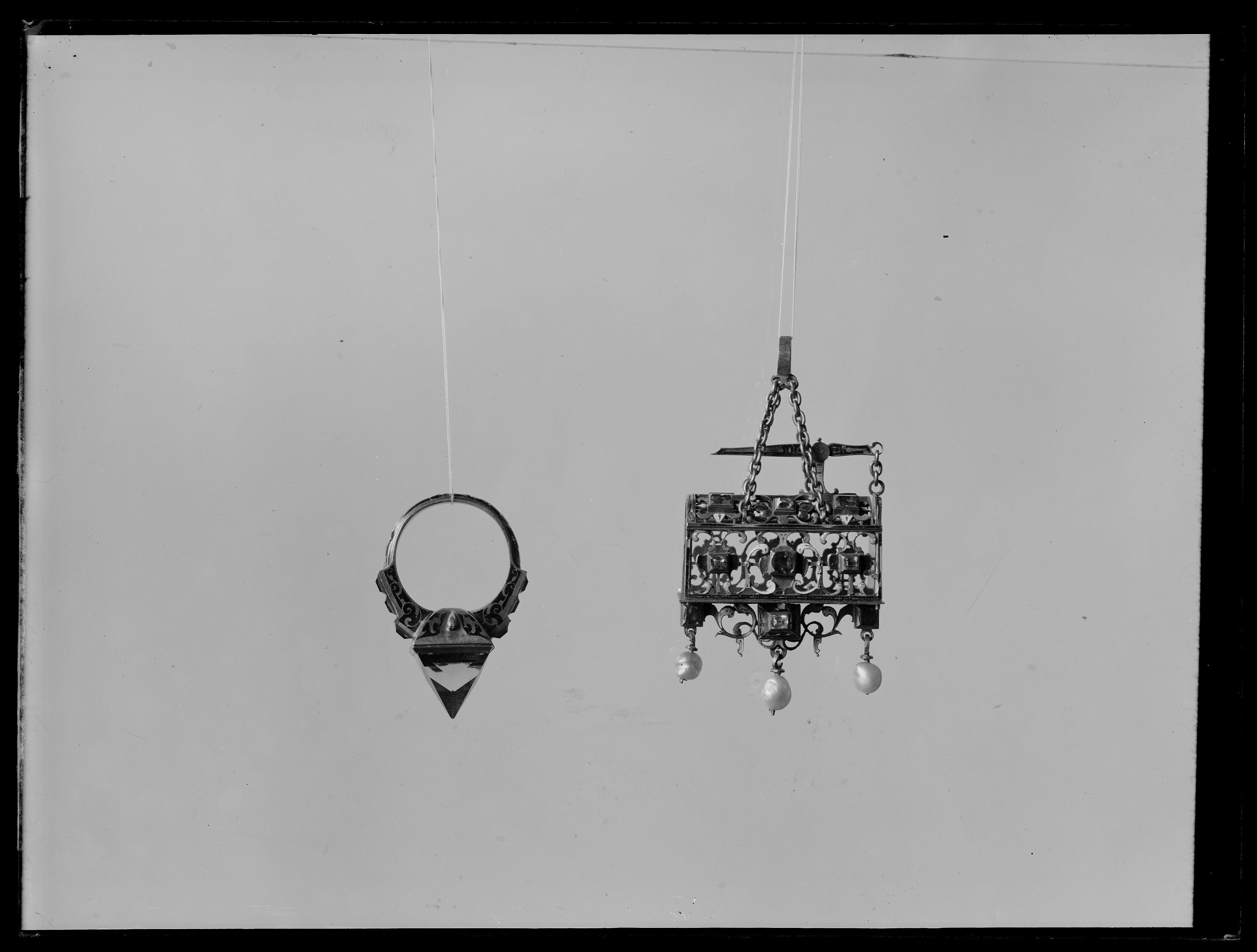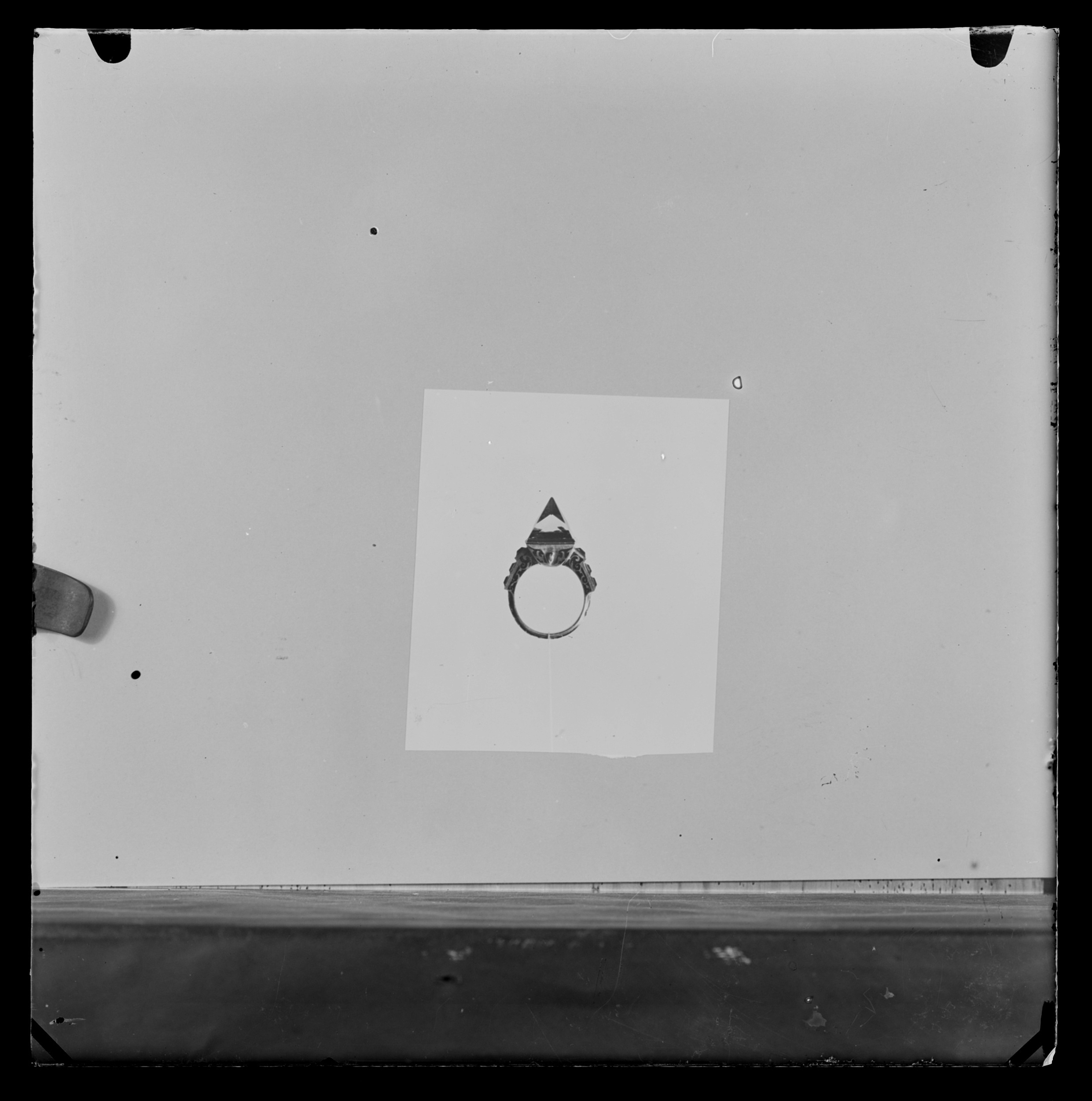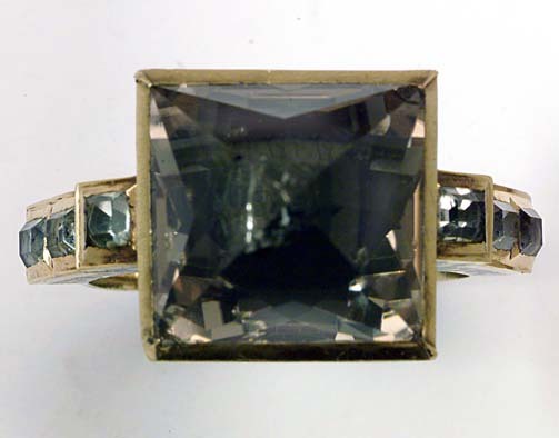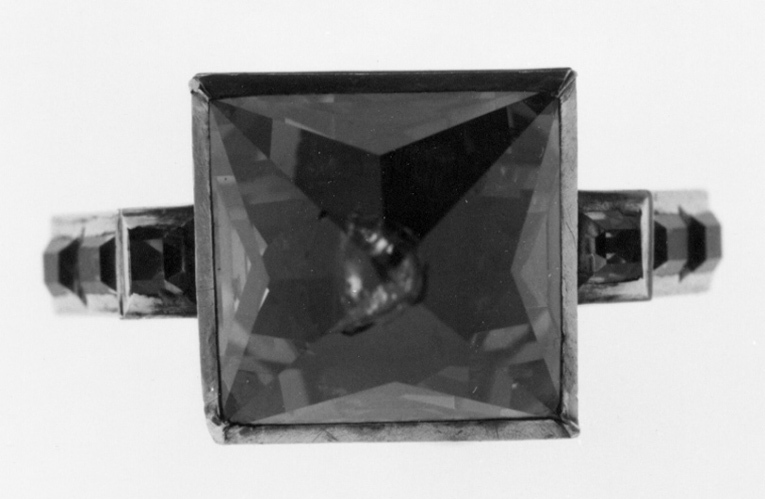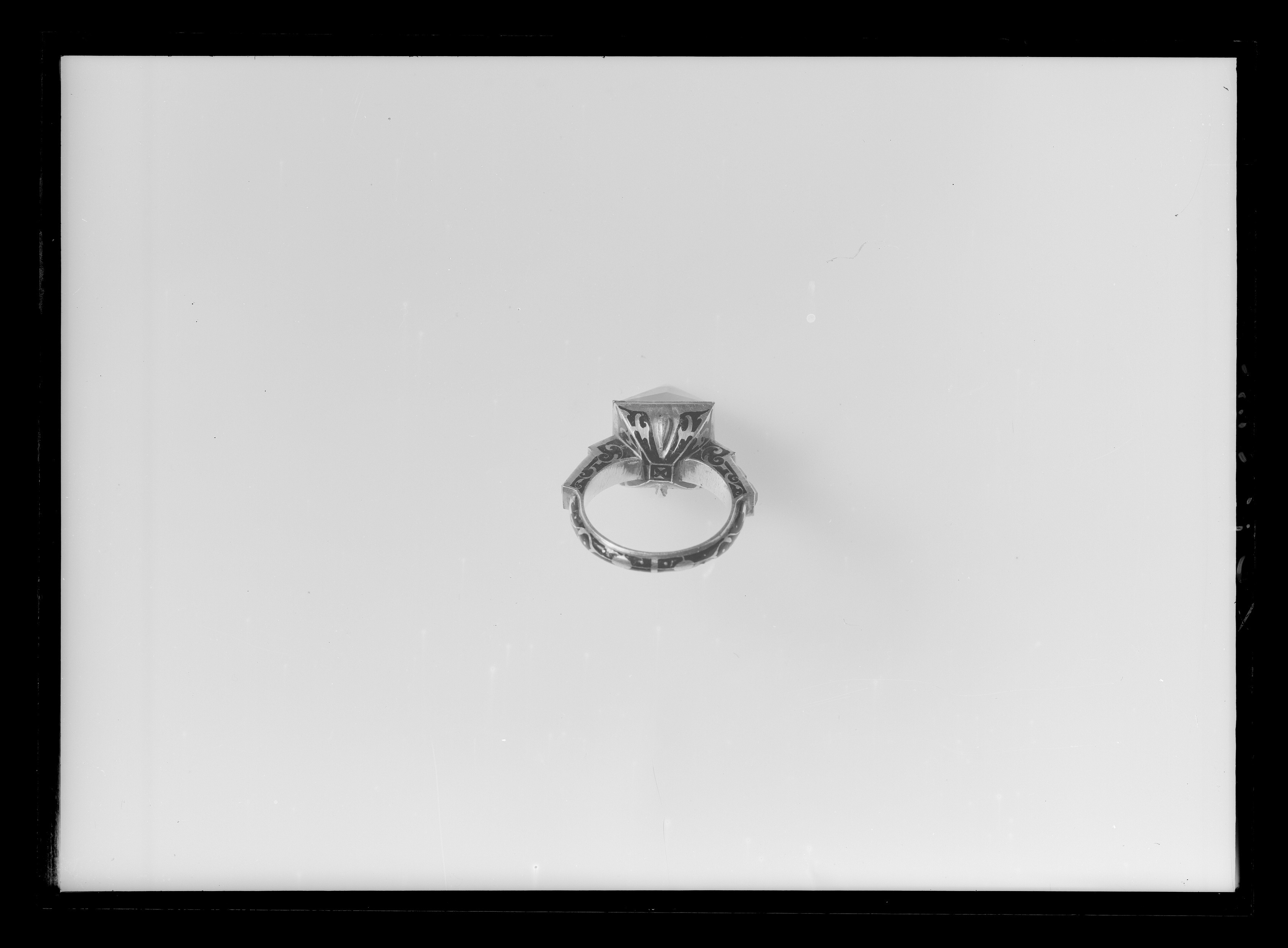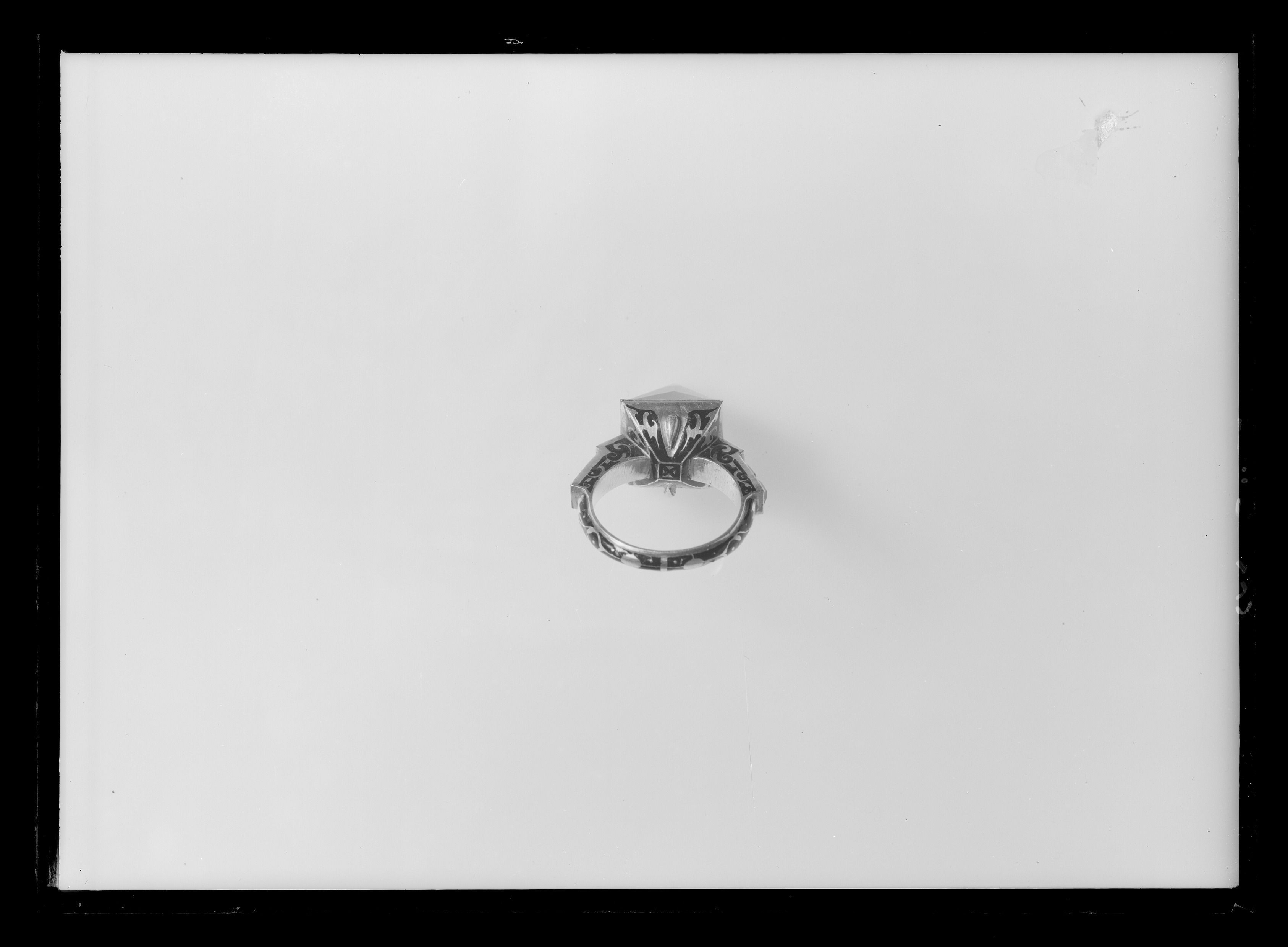 Ring av guld, nedre halvan med rundad utsida, täckt med beslagsornamentik av svart emalj och guld. Övre halvan med fyrkantig utsida, i mitten fattat en pyramidformig, ljus rökkvarts(?), slät fattning av guld, undersidan stympat pyramidformig med rundade sidor, groteskornamentik av svart emalj och guld. Stenen flankerad av sex taffelslipade bergkristaller i slät guldfattning, kanterna med groteskornamentik av svart emalj och guld. Karl IX:s kröning i Uppsala domkyrka var sista gången ring fanns med bland regalierna. Omnämns först på 1700-talets senare del som Karl IX:s. 1751: tilförende hört till Riksregalierna.