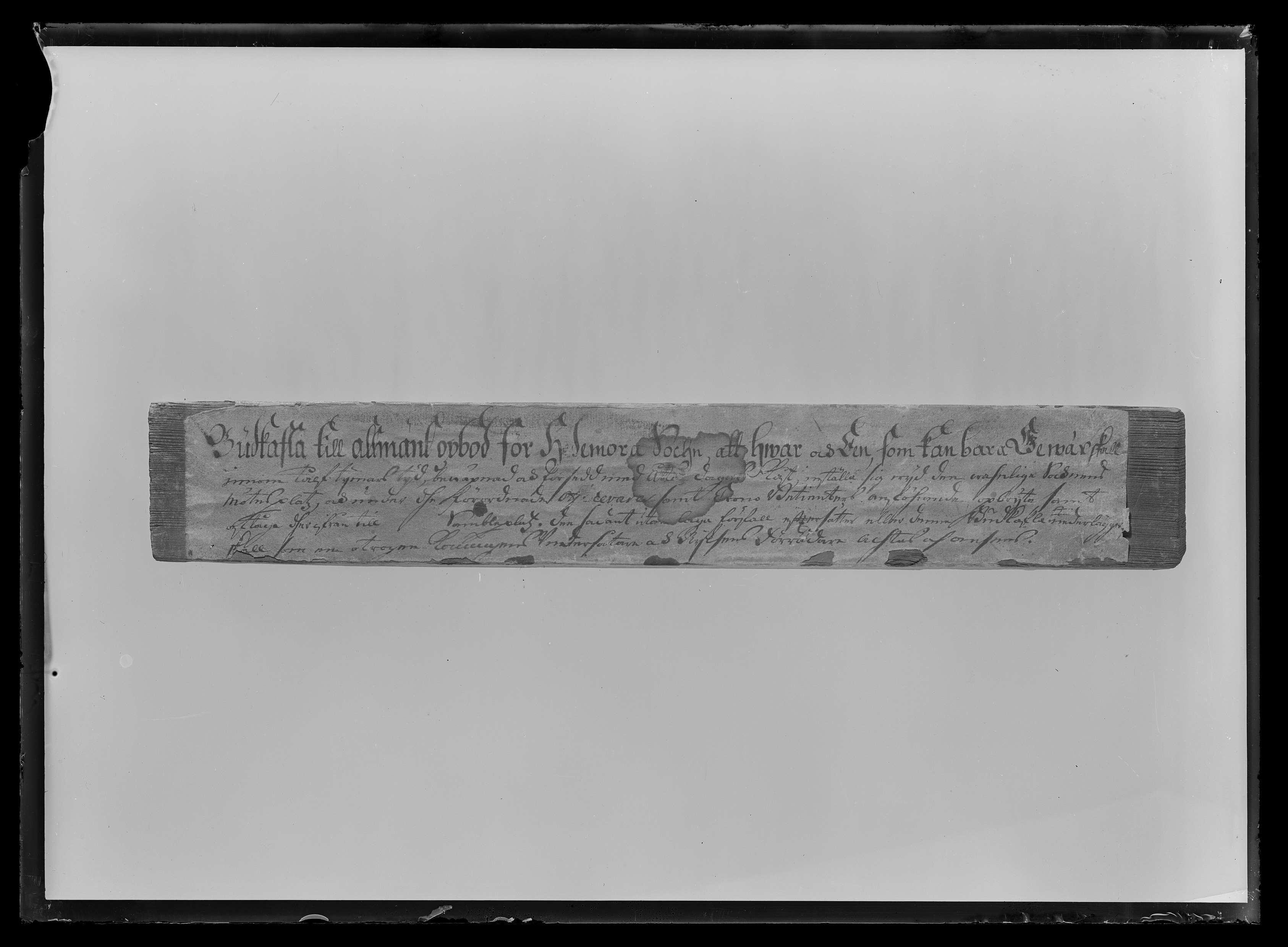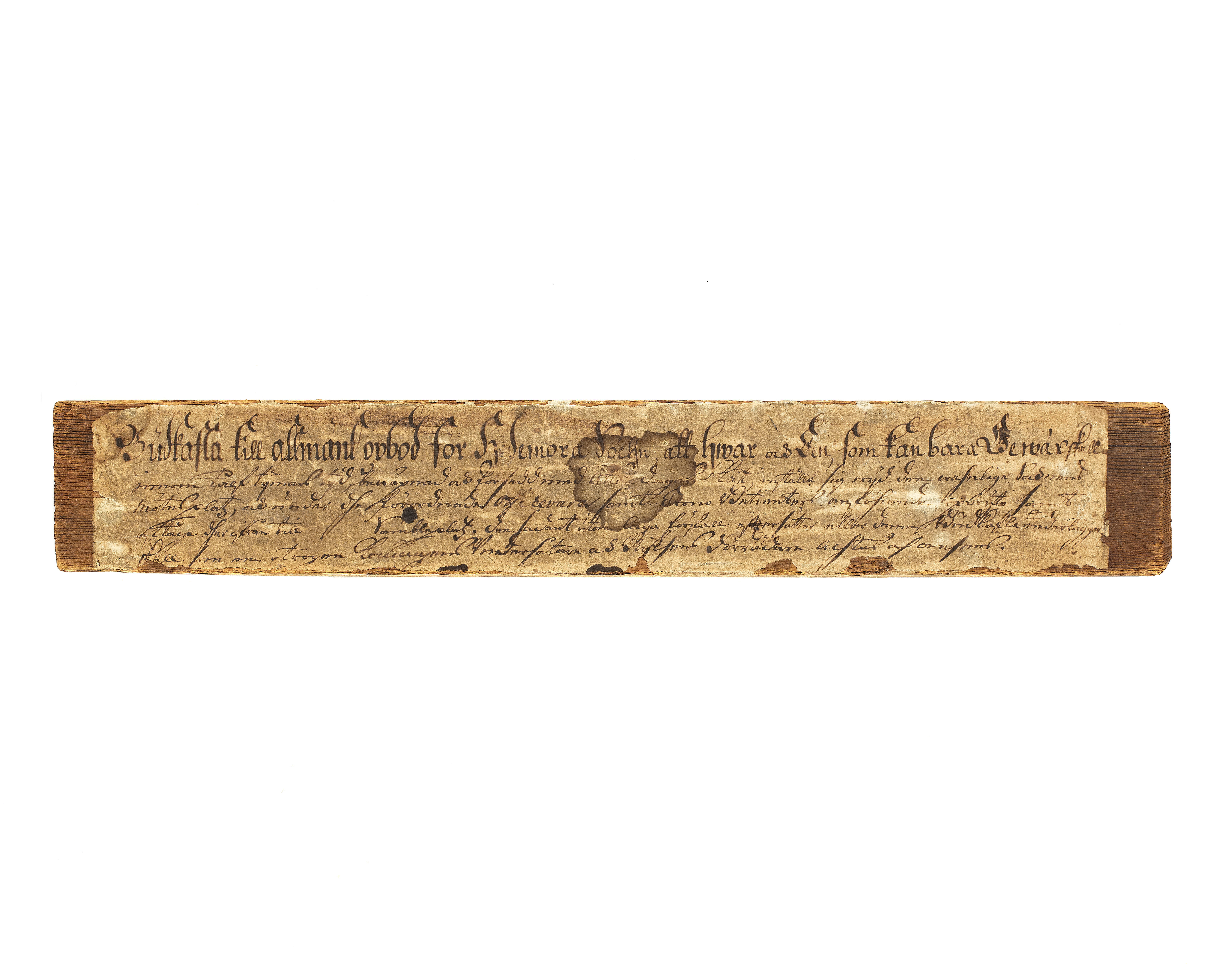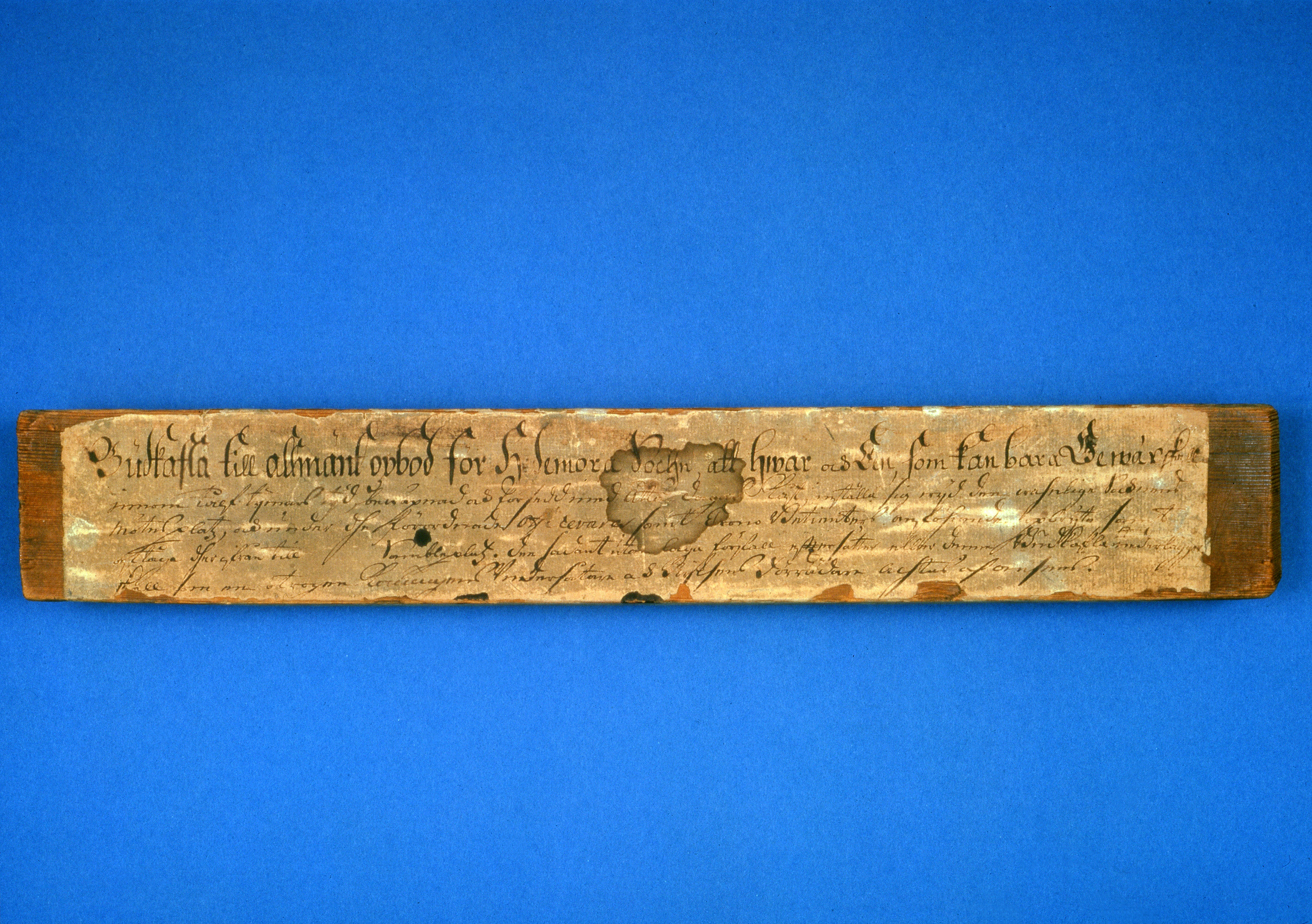 Rektangulärt furustycke, täckt på fram- och baksidorna samt kanterna med påklistrat papper med bläckpåskrift: "Budkafla till allmänt opbod för Hedemora Sochn, att hwar och EEn, som kan bara Gewär skall // innom tålf tijmars tijd, bewäpnad och försedd med åtta dagars Kåst inställa sig wijd den wahnliga Socknens // mötesplatz, och under dhe förordnade Officerars samt Crono Betienters anföhrande opbryta samt // aftåga dherifrån till Sambleplatz. Den sadant utan laga förfall efftersätter eller denna Budkafla nederlägger, // skall som en otrogen Konungens Vndersåtare & Rijksens Förrädare achtas och ansees". På baksidan antecknat: "N B denna Budkafla är wid 1743 års Dahluppror skrifwen af Bond Generalen Schedin med egenhand", samt "(Denna anteckning är af LandtRäntmästaren H. I. Gahns, // Hwars handskrift deruti igenkännes, Järta)".