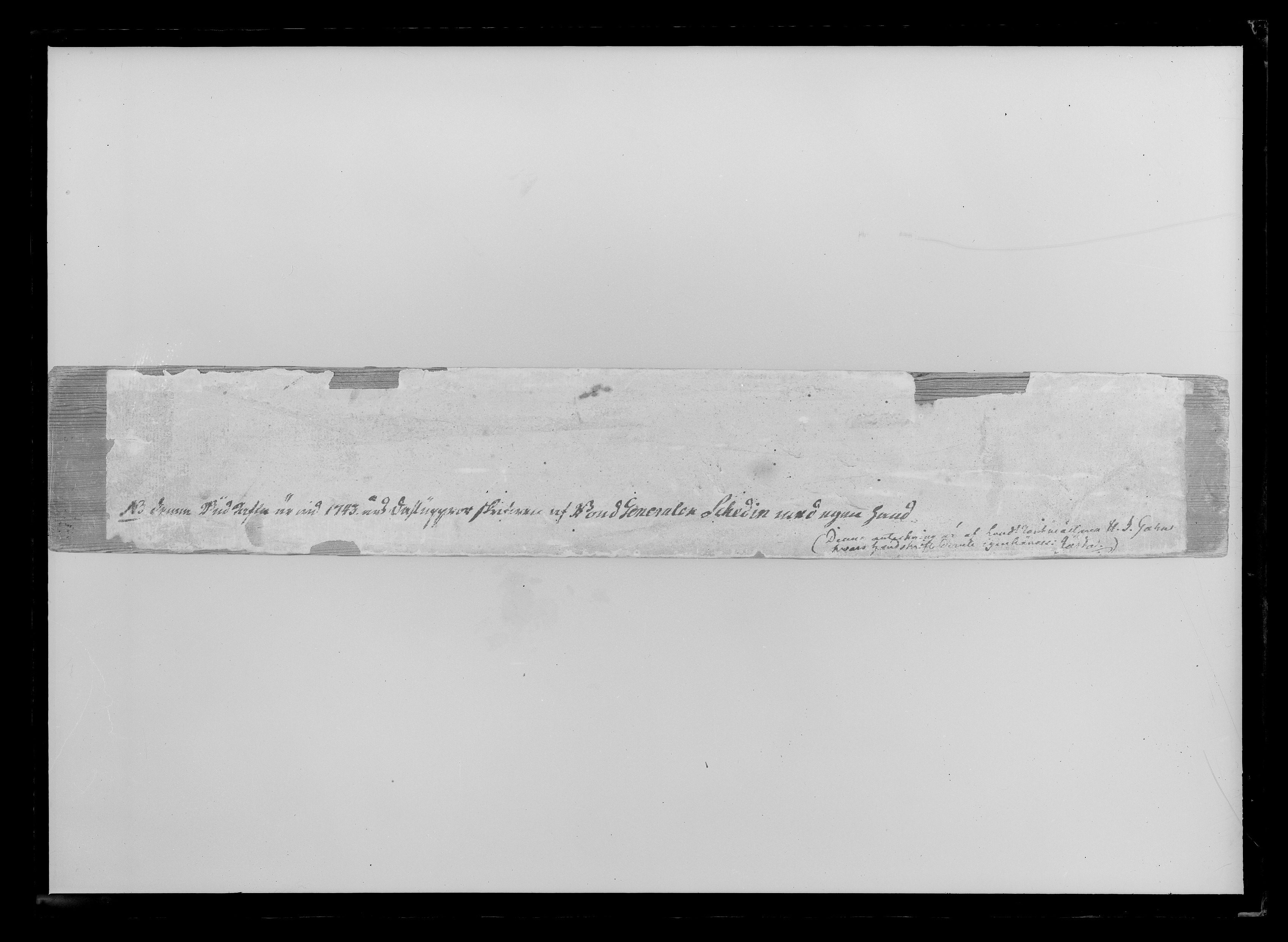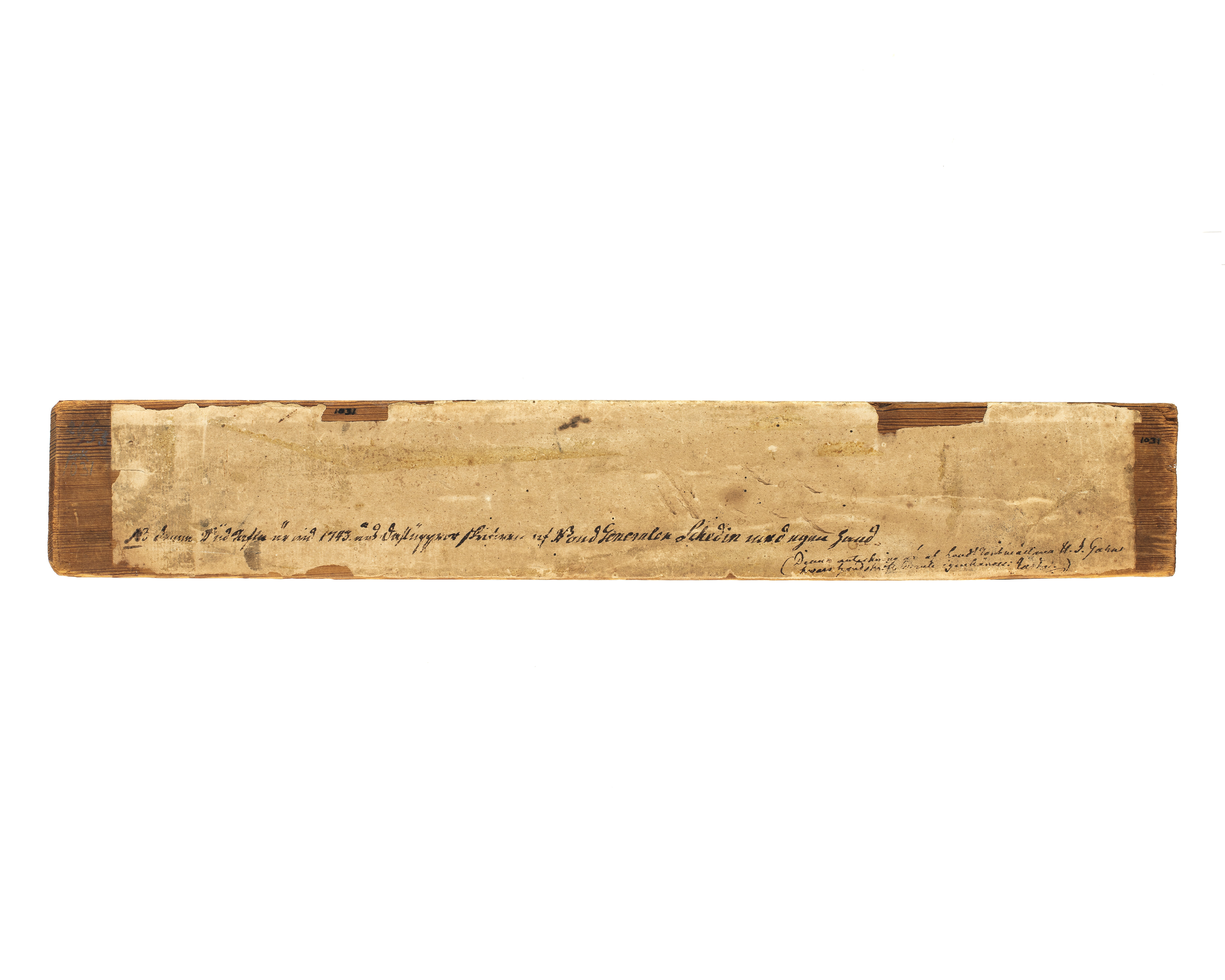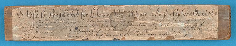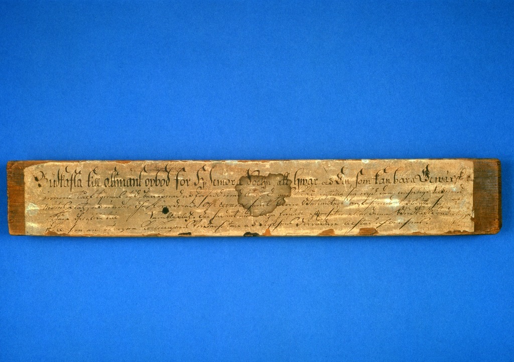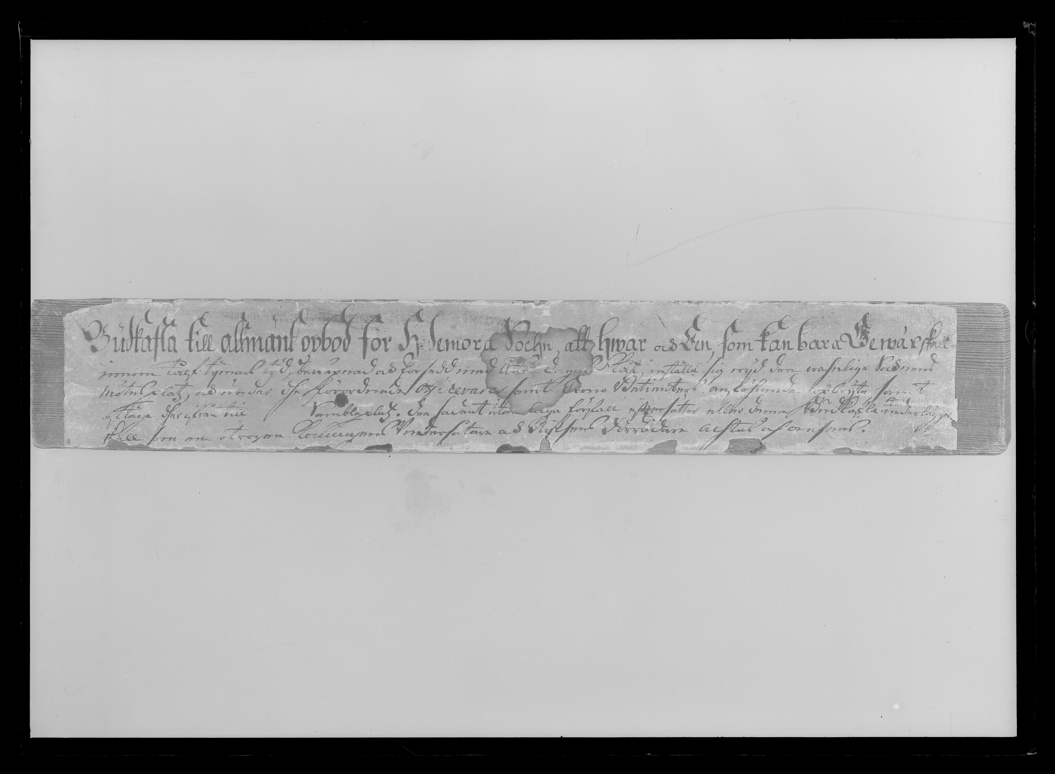 Rektangulärt furustycke, täckt på fram- och baksidorna samt kanterna med påklistrat papper med bläckpåskrift: "Budkafla till allmänt opbod för Hedemora Sochn, att hwar och EEn, som kan bara Gewär skall // innom tålf tijmars tijd, bewäpnad och försedd med åtta dagars Kåst inställa sig wijd den wahnliga Socknens // mötesplatz, och under dhe förordnade Officerars samt Crono Betienters anföhrande opbryta samt // aftåga dherifrån till Sambleplatz. Den sadant utan laga förfall efftersätter eller denna Budkafla nederlägger, // skall som en otrogen Konungens Vndersåtare & Rijksens Förrädare achtas och ansees". På baksidan antecknat: "N B denna Budkafla är wid 1743 års Dahluppror skrifwen af Bond Generalen Schedin med egenhand", samt "(Denna anteckning är af LandtRäntmästaren H. I. Gahns, // Hwars handskrift deruti igenkännes, Järta)".