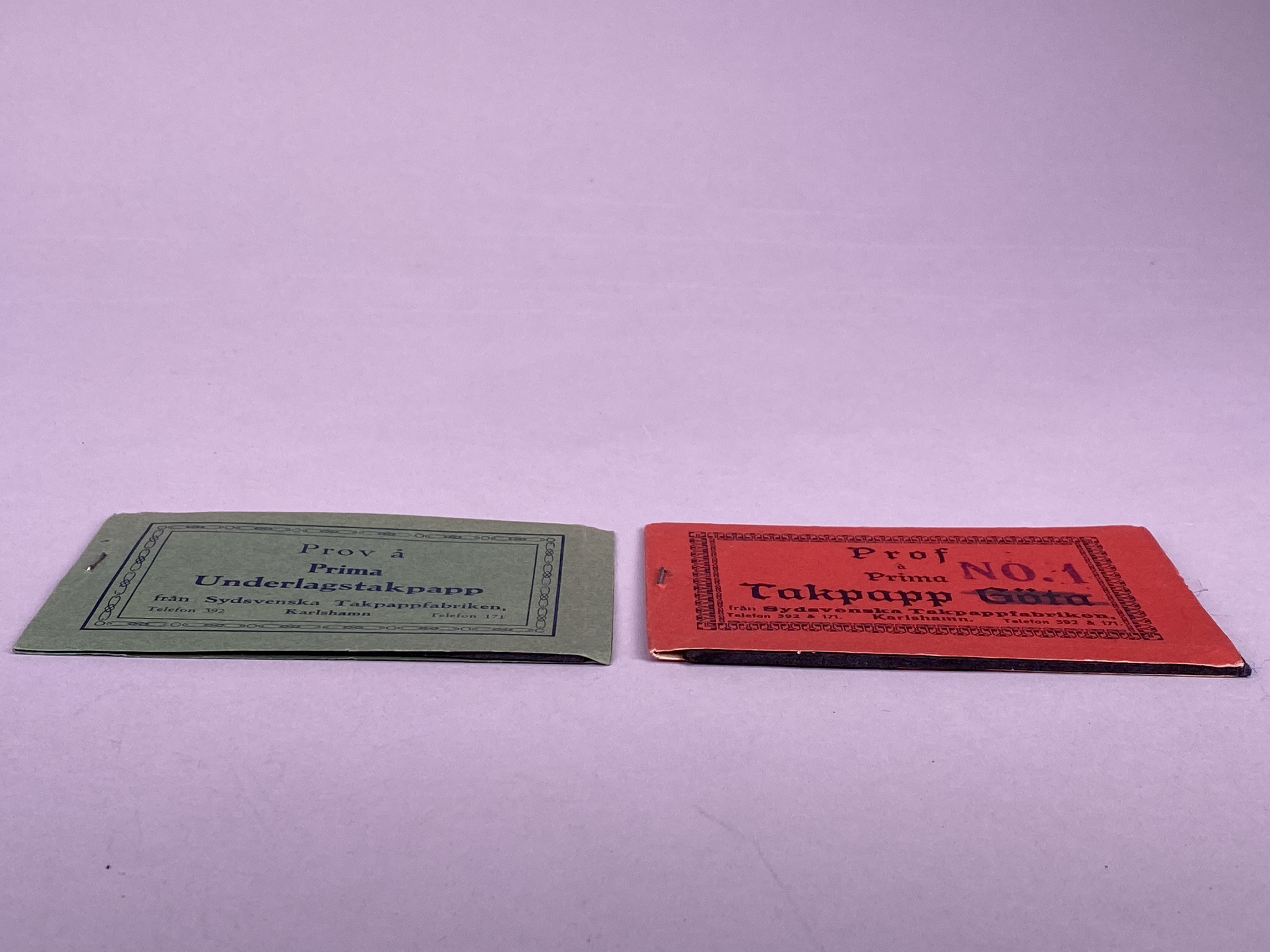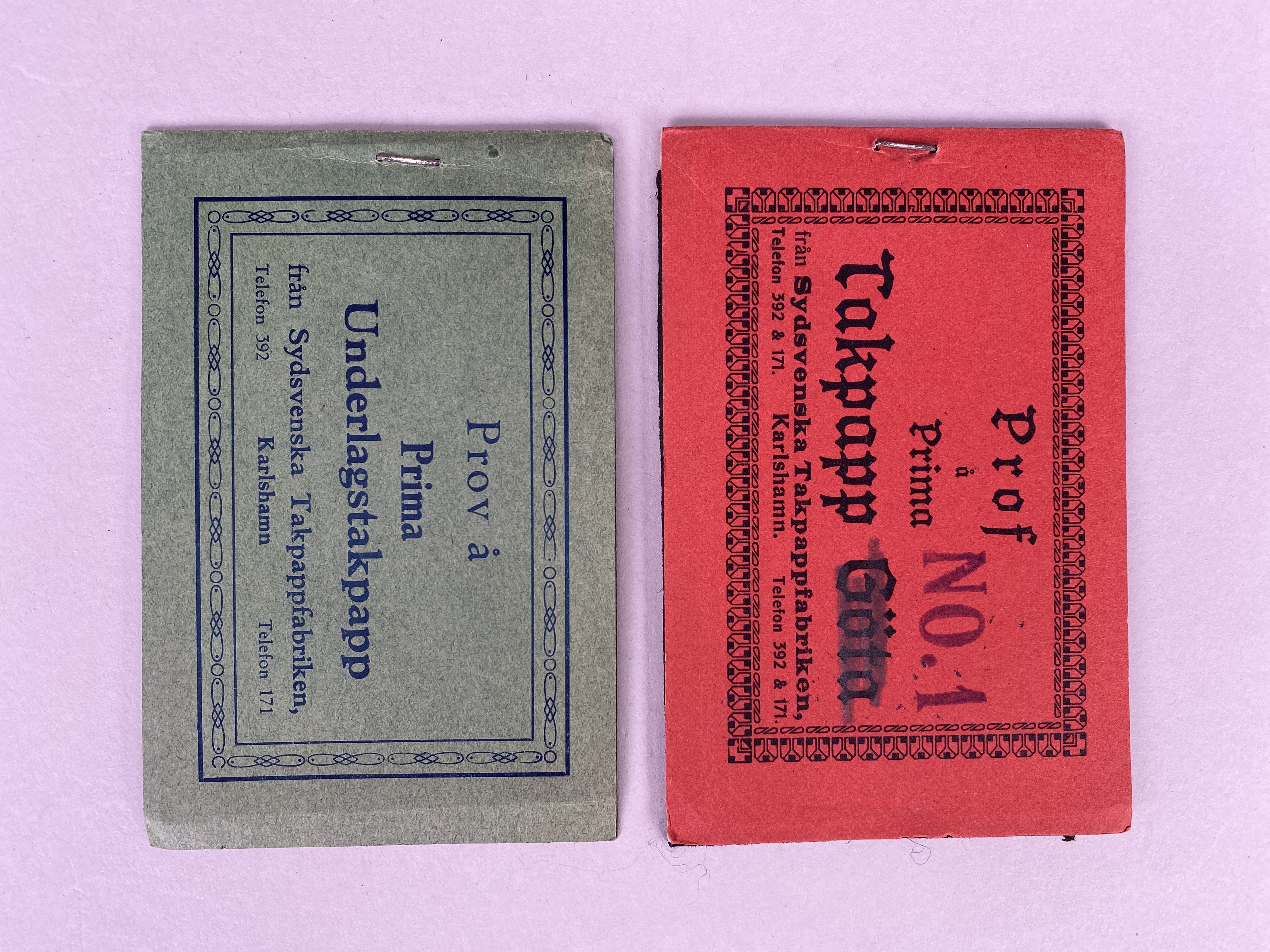 Prov på Prima Underlagstakpapp från Sydsvenska Takpappfabriken i Karlshamn. Underlagen sitter fast mellan två pappersunderlägg.