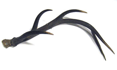 Vänsterhorn med fem taggar, tre på utsidan samt två upptill. Halv rosenstock med hål för skruv, stålskruv med avbruten spets. Ögontaggl: 350 mm, rosenkransens omkrets 200 mm, stångens omkrets 130 och 110 mm. Första gången upptagen i inv. 1686, tillväxt efter 1683, p. 2 - "15 paar hiorthorn små och stoora" eller "Item är af Hans Kongl:Maj.thz Cammar Wachtmestare inlefwererat efter des Attest fol. 19 11 paar hiortehorn Hwilka warit tilförne uti Hans högst Sahl: Kong: Maij.thz Säng Cammar" (fol. 2). "Uthi Kongl:Maij.thz Lijf Rust Cammar hafwer Jagh Undertecknadt, till Rustmästaren, Wälbetrodde Knut Wetterskiär inlefwererat Ellofwa paar Hiortehorn, hwilke legat uthi högst sahl: Kong. Maij:thz Cammarpå Slottet, och i förledne Brand uthtagne, som här med attesteras 1697, Håkan Cuttman, Kl.Mthz Cammar Wachtmästare".