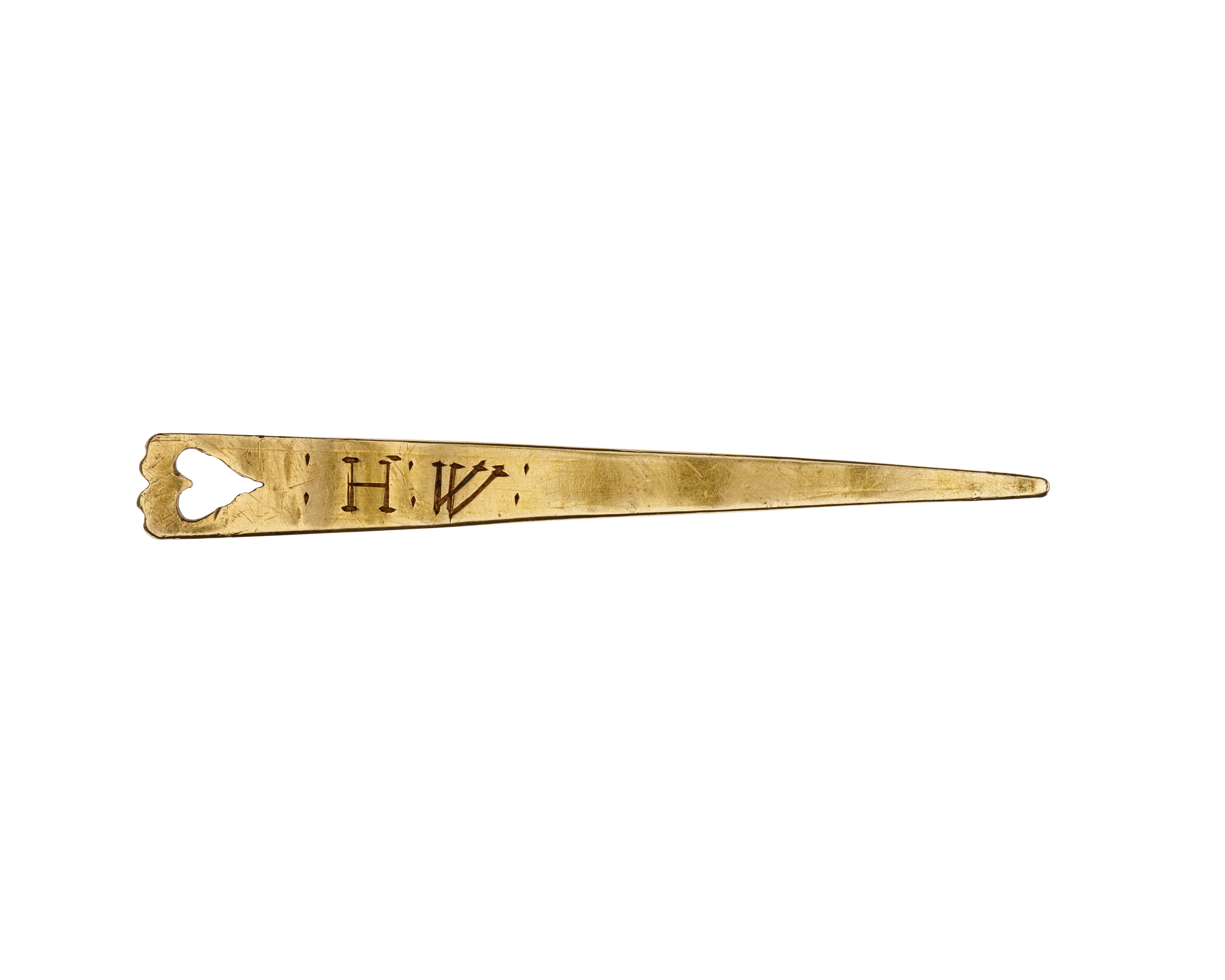 Platt, triangelformad nål av guld med hjärtformigt hål vid den konturerade basen.