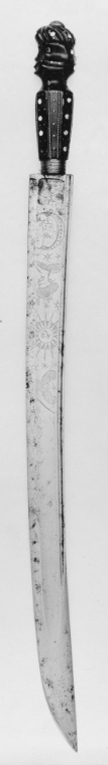 Fäste av mörkt horn nedtill åttkantigt upptill snidat i form av ett turkhuvud med runda inläggningar av ljust ben och däremellan mässingsstift, nedtill ringformigt beslag 12 mm brett av mässing upptill knappformigt fäste (för tången) av mässing. Ut med den åttkantiga delen sex stycken längsgående tvinnade mässingstrådar. Klinga böjd eneggad utom vid det ca 130 mm långa spetspartiet, där tvåeggad. Brett ryggparti, utmed detta smal hålkäl samt utmed klingan i övrigt bred, grund hålkäl i vilken på båda sidor lika etsade ornament: närmast basen måne, turkhuvud, sol, stjärnor.