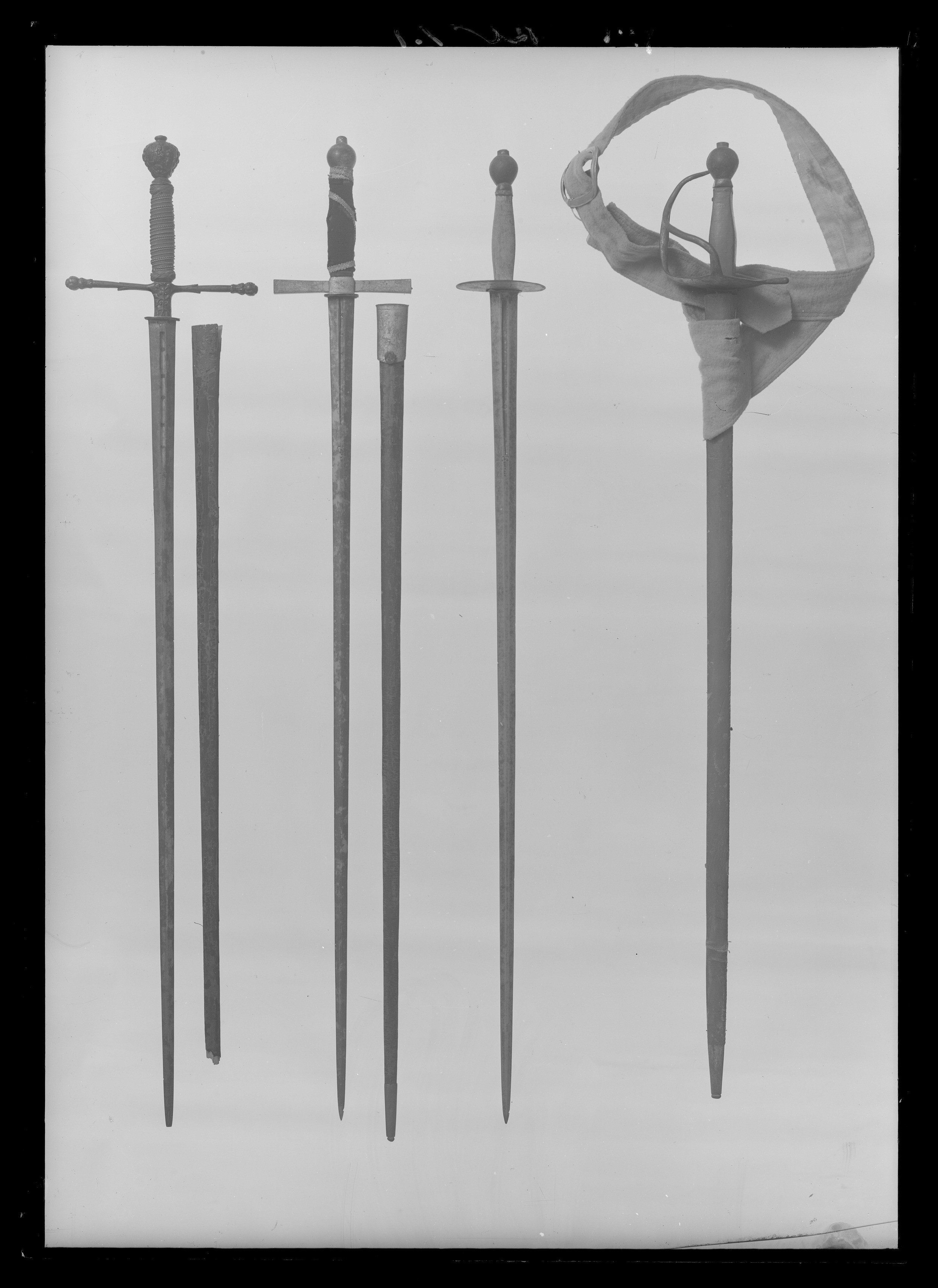 Modell 1685. Använd vid något av de gustavianska riddarspelen 1799-1800. Korsformigt fäste av mörkanlöpt reliefsnidat stål. Knapp omvänt päronformad med på ena sidan en snidad mansfigur och på andra sidan en kvinnofigur. På bak- och framsidan blomornament. Parerstänger långa, raka med knoppformiga ytterändar i form av blomknoppar. Krysset relativt högt med snidade blomrankor. Lindning av ursprungligen förgylld tvinnad mässingstråd, omväxlande tjock och tunn. Upptill och nertill flätade kransar. Klinga rak, tvåeggad, m: 1685, variant för kommissvärja. Vid klingbasen proberstämpeln P svagt synlig. Mellan fäste och klinga stötlapp av rött ylle.