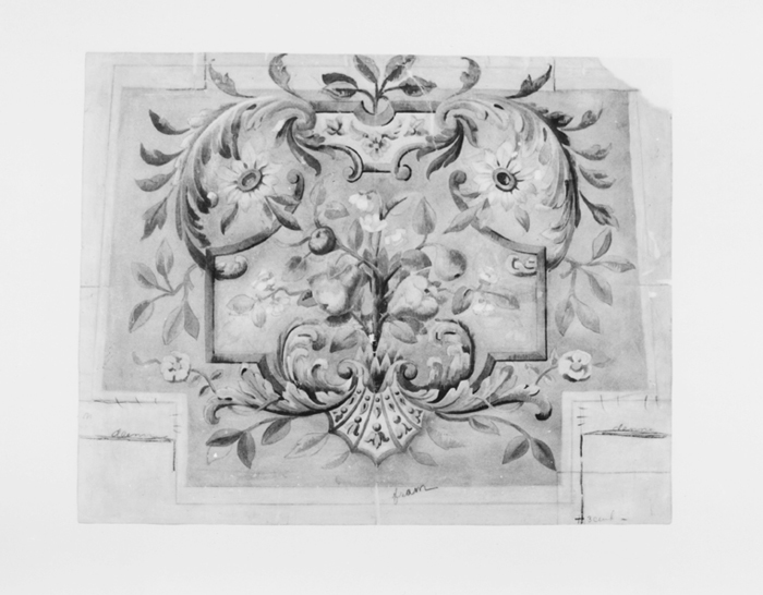 MÖNSTERFÖRLAGA, till möbelklädsel. Till stol inv nr Gr VI:II:A.a.13. (för beskrivning se Hallwylska samlingen Gr VI, text) Utfört på kraftigt papper tecknat med blyerts och färglagt med akvarellfärger. Utöver tillägg som gjorts med rödkrita finns också arbetsbeskrivning skriven med blå krita (se konserveringsrapport) Mönster med blomsterornament, solfjädersform, fyra päron och päronblomma i olika färger mot gulgrön botten. Påskrift på baksidan "Grefve Hallwyl (stol gul botten)" Mått: H 49,4 cm B 61,7 cm Gåva 1943 av arkitekt Gustaf Clason (se protokoll 54 º 4)